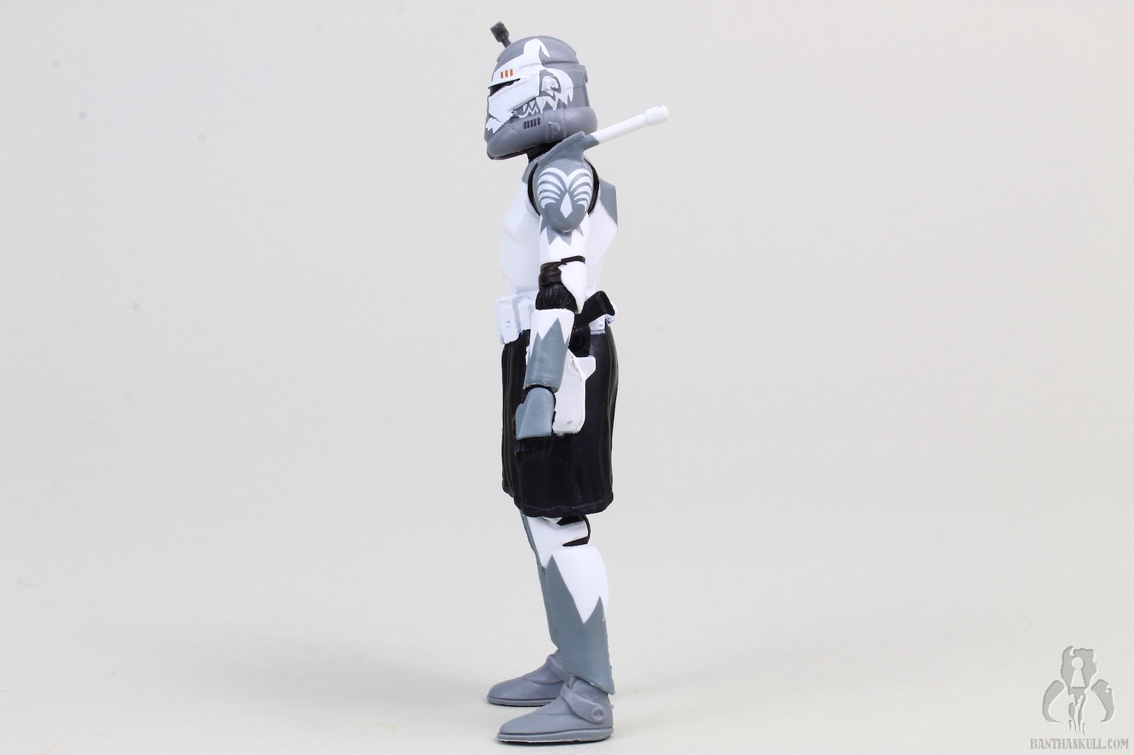 Hasbro had a bunch of clone commanders jammed into the limited “Phase 2” run of the 3.75” Black Series. That Wolffe figure was all new and unique. But also released at around the same time were Rex, Thorne, and Doom. The mold used for those figures was roughly the same, with a minor tweak or two, but heavily repainted as to render them essentially new. The limitations of that mold included a small head (although not as small as their buddy Wolffe’s), swivel waist articulation, and swivel hips with limited range. Also, at least on Rex, the wrist joints were poorly sculpted and looked like he had a case of rheumatism.