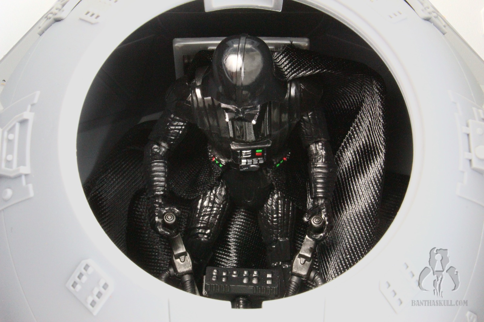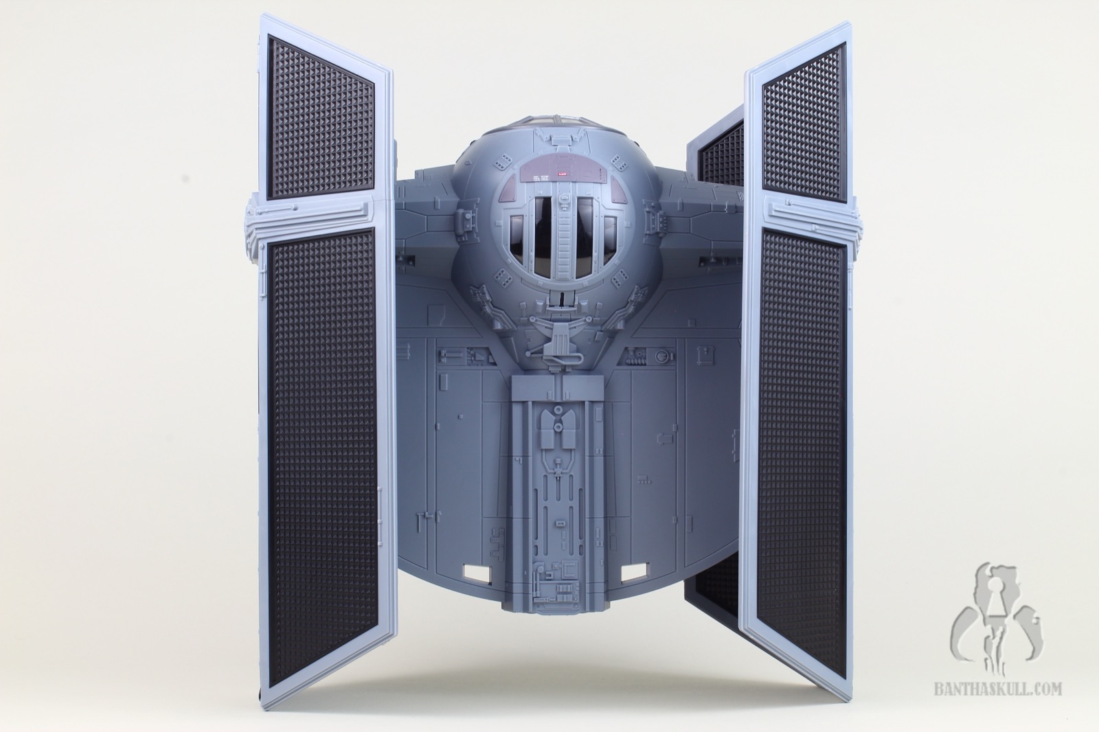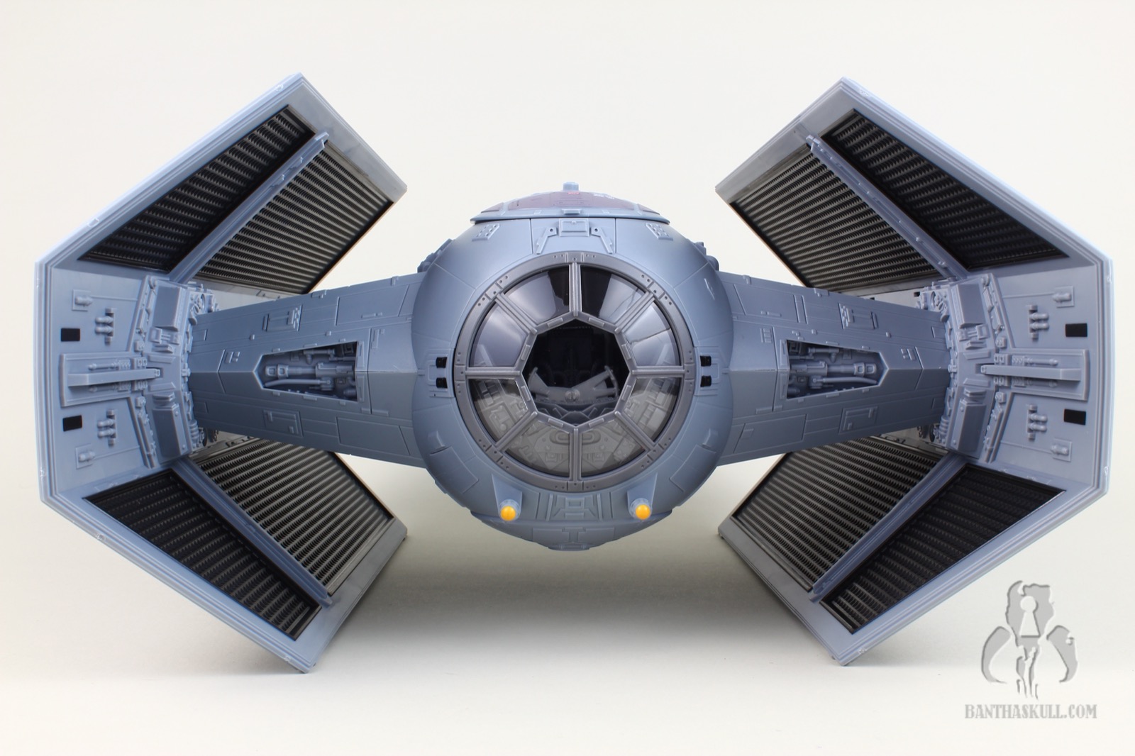 Right out of the box and after popping on the wings, it is immediately apparent that it is far superior to what we have. Comparing this new TVC version with the most recent one from 2011 side by side, it really highlights the differences. The proportions of the POTF2 mold are just off. They always were, but never enough to annoy me. This one just looks right. The struts/arms are now shorter, and the wings are bigger and designed with more appealing angles. Gone are any “play” features, like launching missiles or retractable cannons. Later for that noise. The big sliding switch is now gone from the underside of the ship. The greeblies are well done and well defined, although honestly, the POTF2 version did a pretty good job with that. The detailing was done pretty nicely in the first place, so while better, the TVC version doesn’t make my jaw drop in that regard. There is, predictably, a lack of any weathering on the ship. Even some of the previous repaints had some weathering. Now maybe Vader didn’t take his experimental ship into battle often. I have no idea what it did in the old EU, or even in the new canon. I can accept it being fairly pristine, but a few scratches and weathering marks wouldn’t kill anyone, except the bean counters at Hasbro, apparently. One thing that did annoy me a bit was the top hatch on the old sculpt. Viewing the fighter head on, it looks like the cockpit is wearing a yarmulke. It just wasn’t sculpted well. This version corrects that with flying colors.