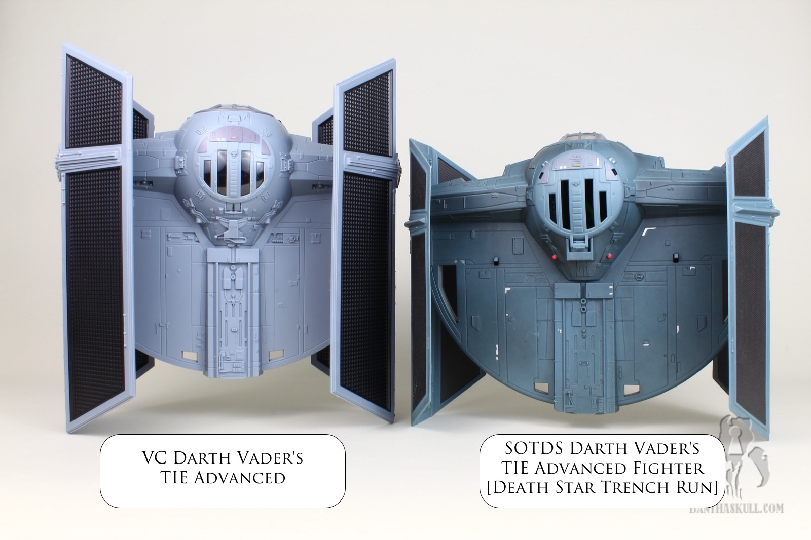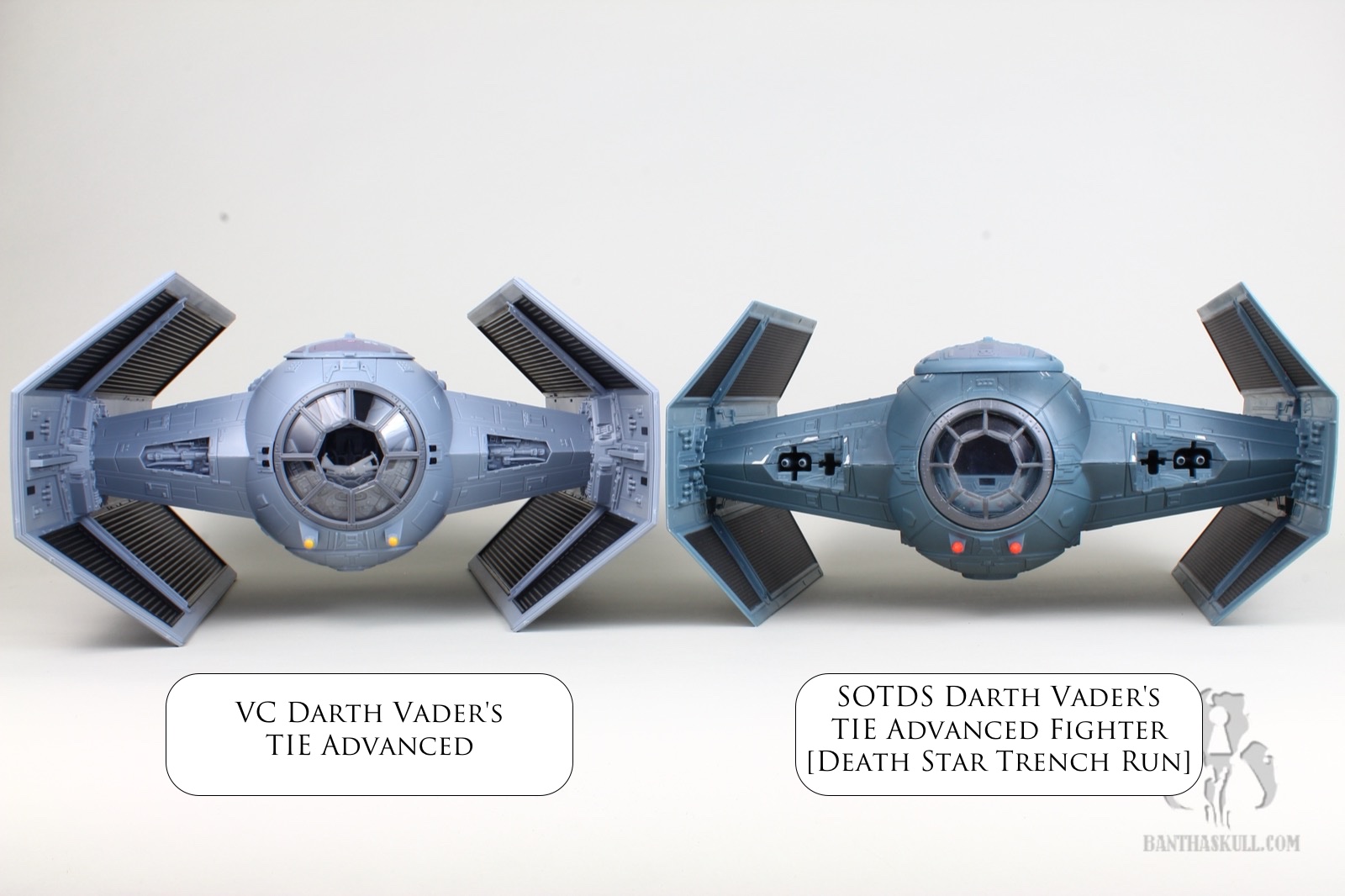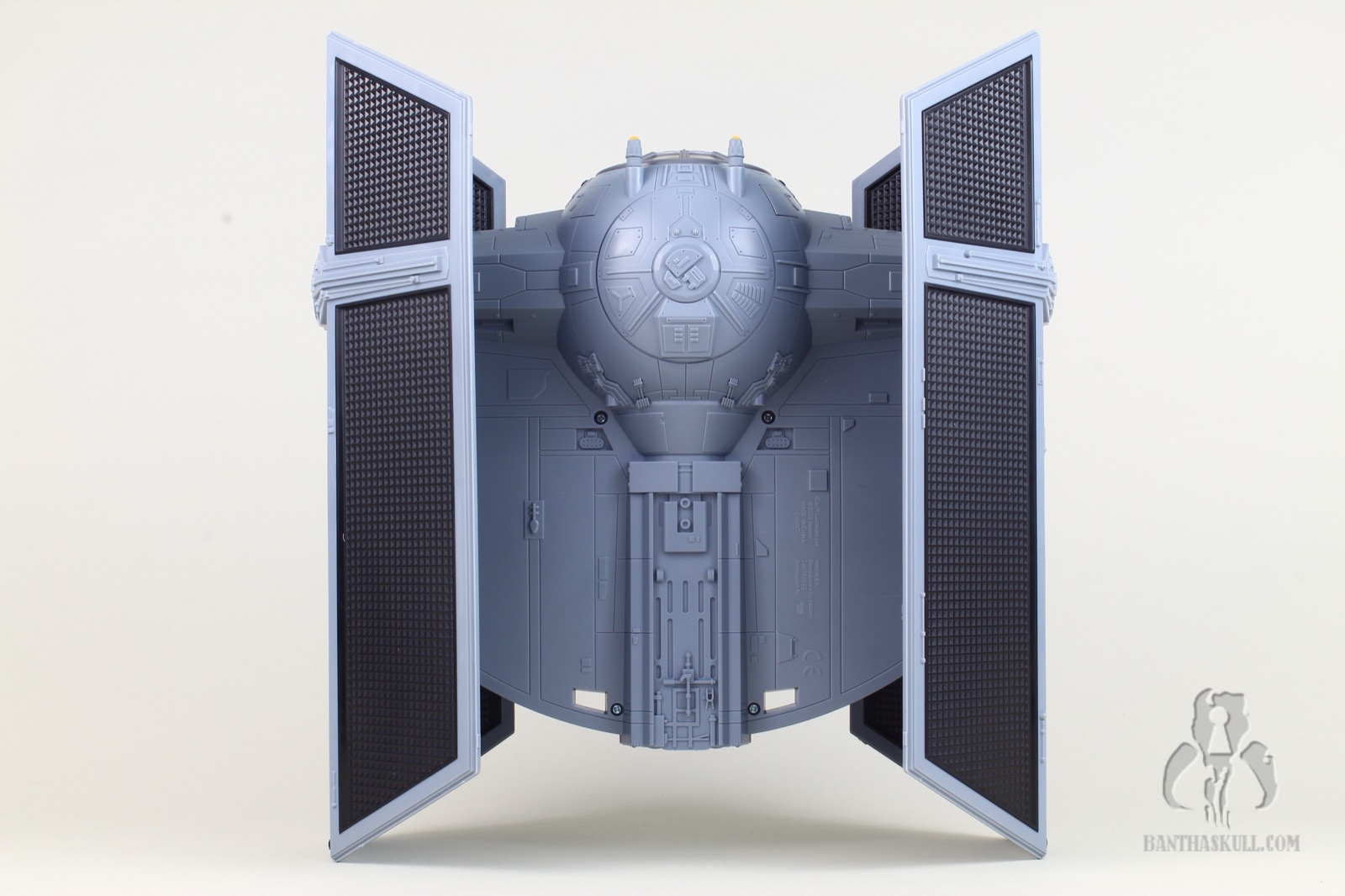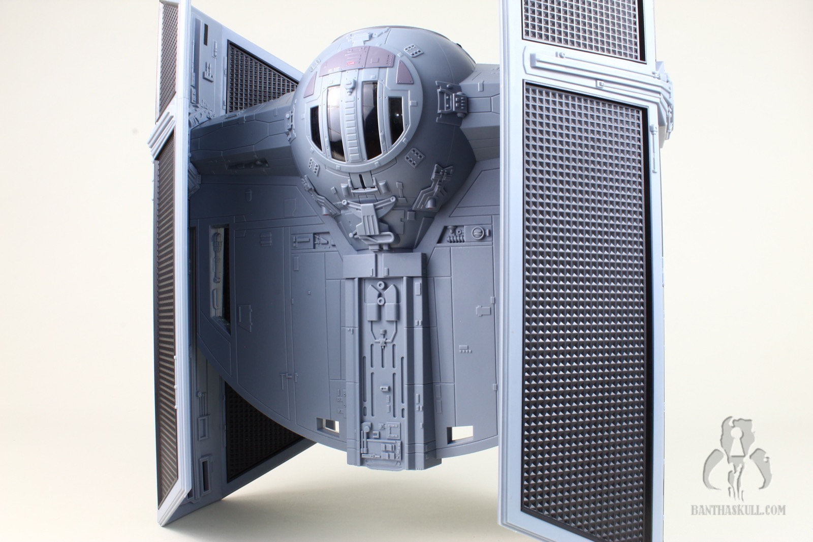 Right out of the box and after popping on the wings, it is immediately apparent that it is far superior to what we have. Comparing this new TVC version with the most recent one from 2011 side by side, it really highlights the differences. The proportions of the POTF2 mold are just off. They always were, but never enough to annoy me. This one just looks right. The struts/arms are now shorter, and the wings are bigger and designed with more appealing angles. Gone are any “play” features, like launching missiles or retractable cannons. Later for that noise. The big sliding switch is now gone from the underside of the ship. The greeblies are well done and well defined, although honestly, the POTF2 version did a pretty good job with that. The detailing was done pretty nicely in the first place, so while better, the TVC version doesn’t make my jaw drop in that regard. There is, predictably, a lack of any weathering on the ship. Even some of the previous repaints had some weathering. Now maybe Vader didn’t take his experimental ship into battle often. I have no idea what it did in the old EU, or even in the new canon. I can accept it being fairly pristine, but a few scratches and weathering marks wouldn’t kill anyone, except the bean counters at Hasbro, apparently. One thing that did annoy me a bit was the top hatch on the old sculpt. Viewing the fighter head on, it looks like the cockpit is wearing a yarmulke. It just wasn’t sculpted well. This version corrects that with flying colors.