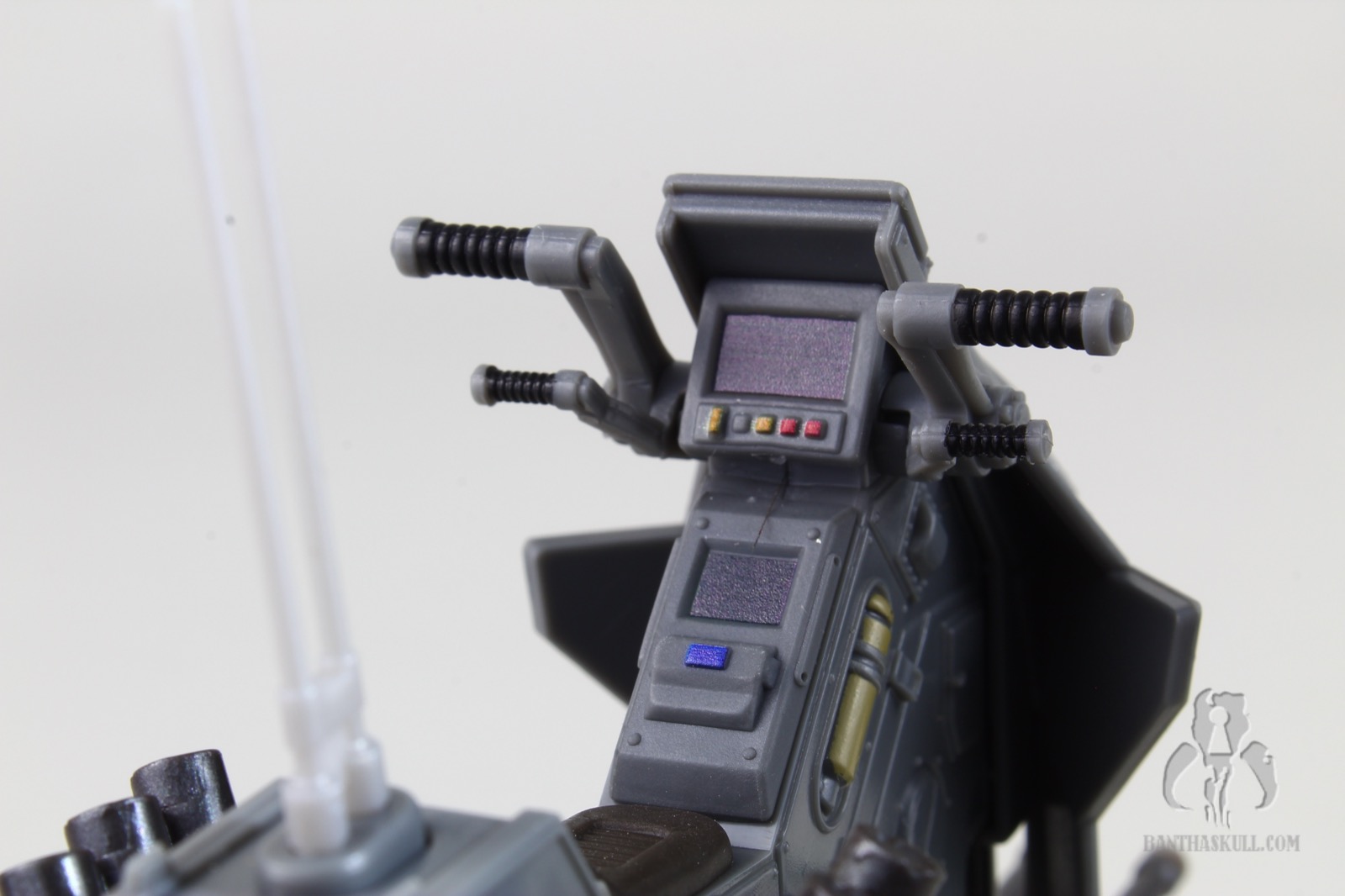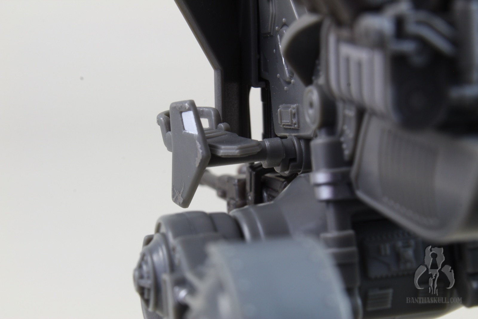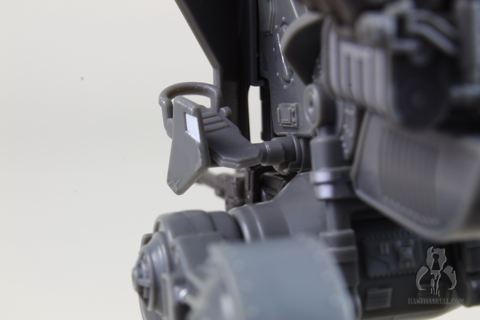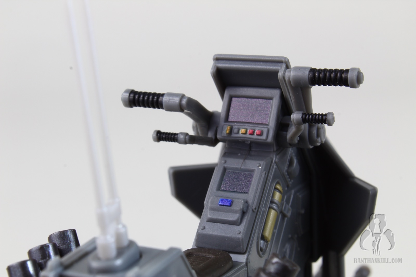 The front cannon is articulated, and can turn left/right/up/down. Included is a translucent red, double-blast effect, which plugs into the front cannons, if you so desire. The handles/grips and the pedals are swivels, to assist with fitting the driver comfortably. The vertical double antenna behind the seat is made of a rather rigid plastic, which is good. It has some flexibility so it may not easily snap off, but it’s definitely better than the noodle plastic that was used for the antenna on the 2005 AT-RT.