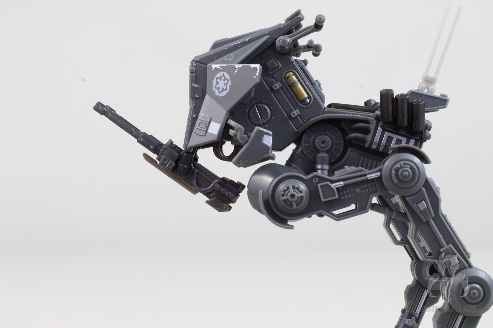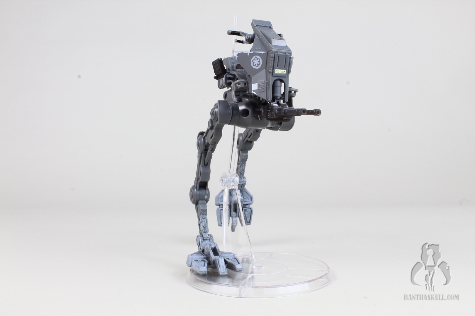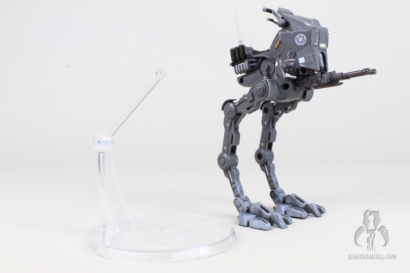 Once I started messing around with it, the first thing that struck me was the articulation. The legs have 4 points of articulation, allowing for a slew of dynamic poses. It can stand upright at various heights, it can hunch down for the driver to get on board, and it will remain upright in a few simple walking poses. But the real win here is that Hasbro included an adjustable, clear “flight” stand. They’ve done simple stands for a few items in the past, but I don’t recall there ever being an articulated stand offered in the 3.75” line. The two-piece arm has a ball at the end that snaps lightly into a socket underneath the cockpit. The base fully supports the weight of the AT-RT and driver with no problem. It serves as a support for some walking poses that wouldn’t be sturdy, but also allows for some fully dynamic running or jumping poses. It’s pretty fun, and I hope Hasbro finds reasons and ways to include this type of thing in future vehicle releases.