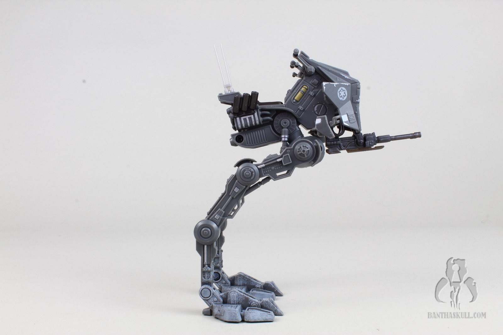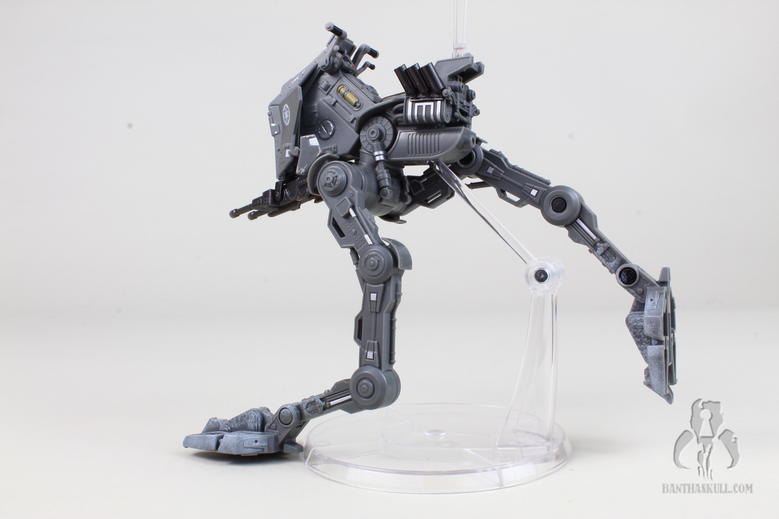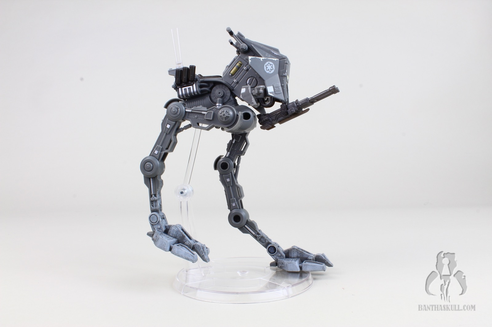 Once I started messing around with it, the first thing that struck me was the articulation. The legs have 4 points of articulation, allowing for a slew of dynamic poses. It can stand upright at various heights, it can hunch down for the driver to get on board, and it will remain upright in a few simple walking poses. But the real win here is that Hasbro included an adjustable, clear “flight” stand. They’ve done simple stands for a few items in the past, but I don’t recall there ever being an articulated stand offered in the 3.75” line. The two-piece arm has a ball at the end that snaps lightly into a socket underneath the cockpit. The base fully supports the weight of the AT-RT and driver with no problem. It serves as a support for some walking poses that wouldn’t be sturdy, but also allows for some fully dynamic running or jumping poses. It’s pretty fun, and I hope Hasbro finds reasons and ways to include this type of thing in future vehicle releases.