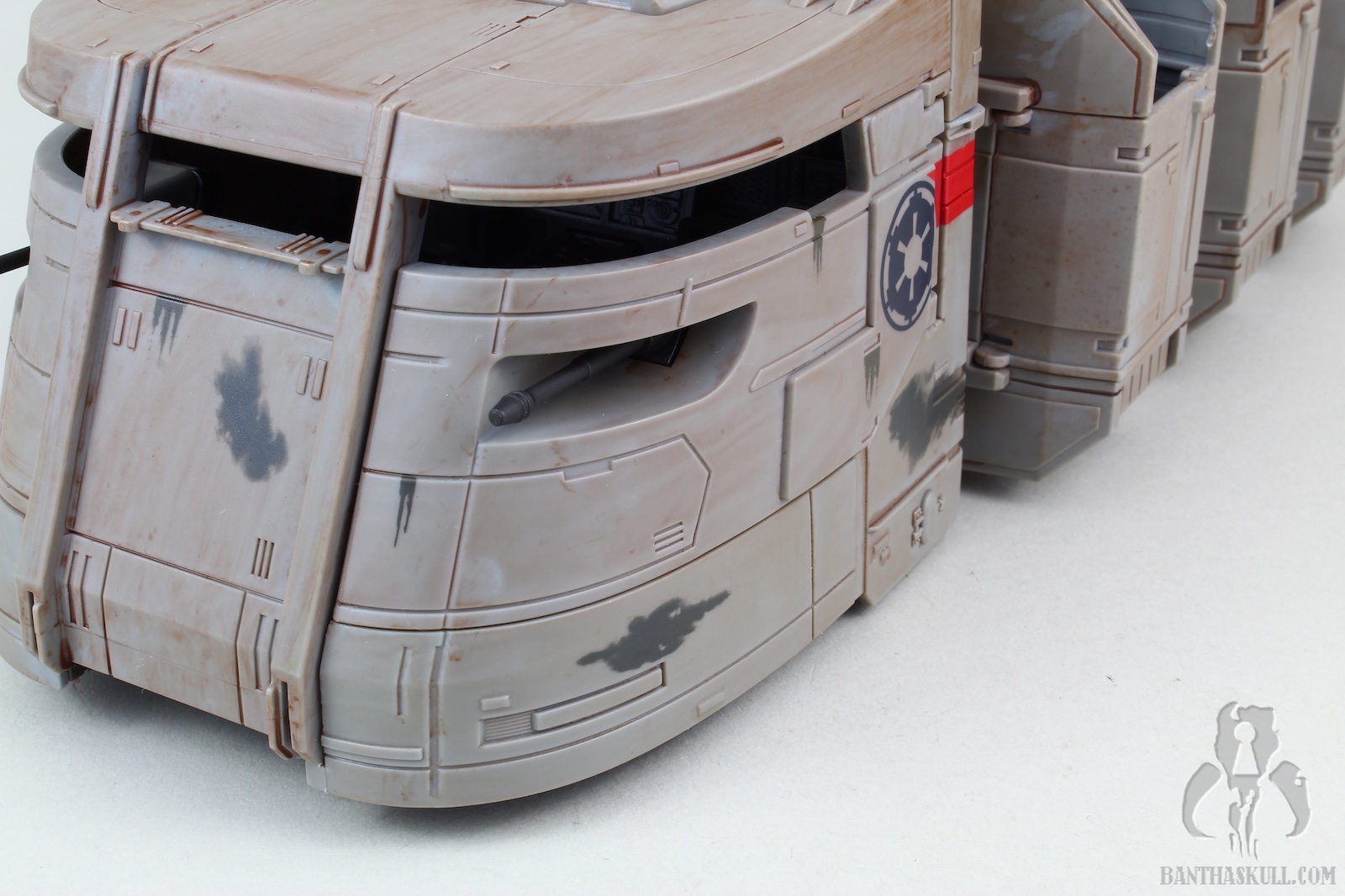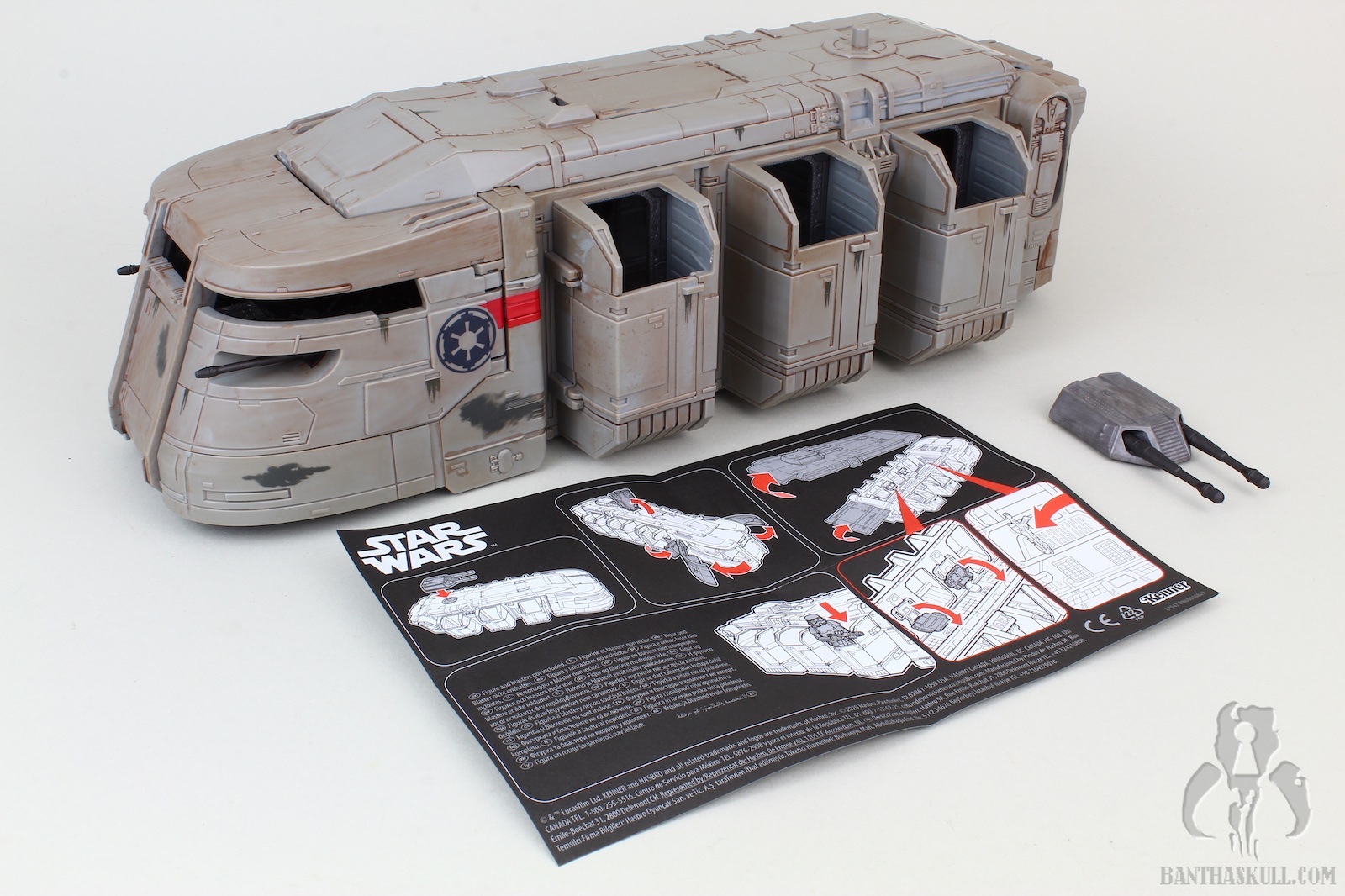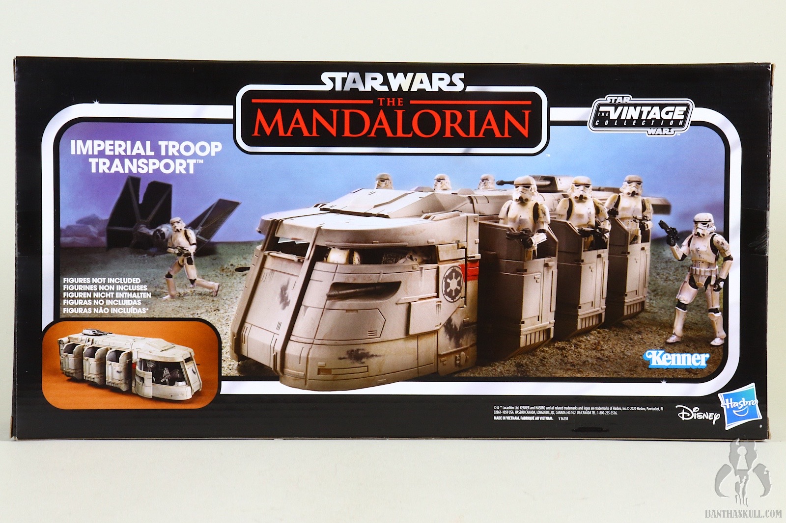 This release was a surprise to be sure. Along with Baby Yoda, it seems that The Mandalorian is full of top secret reveals. With barely any leaks (save a rumor of something codenamed “duck boat”), online retailers posted the Imperal Troop Transport on February 4, 2020. That same day, Hasbro made its official announcement and product reveal. And just like that, pre-orders were being fulfilled and shipped. I received my sample via Entertainment Earth (Sponsored Link) a mere 7 days later. And on that 7th day, there was no rest for Banthaskull. We quickly put this gallery together so that if you haven’t already made this purchase, you may decide to do so after perusing our photos and review. Or, you could just be a terrible human being, and decide not to.