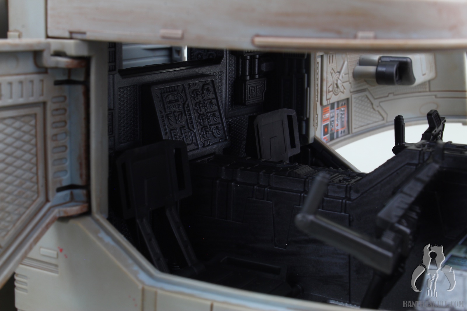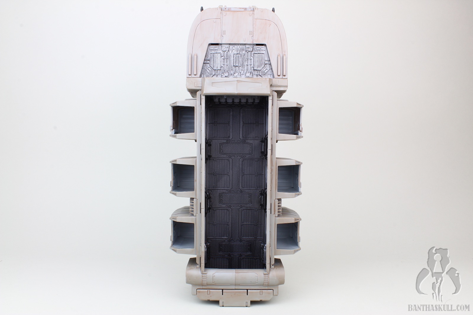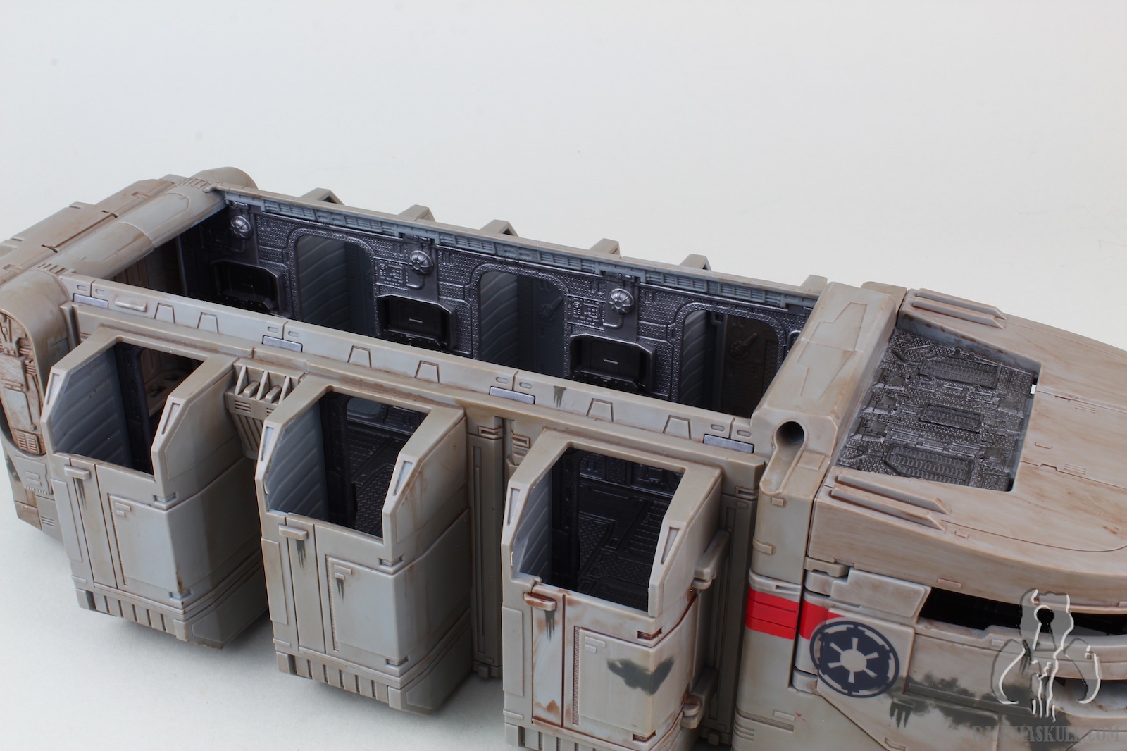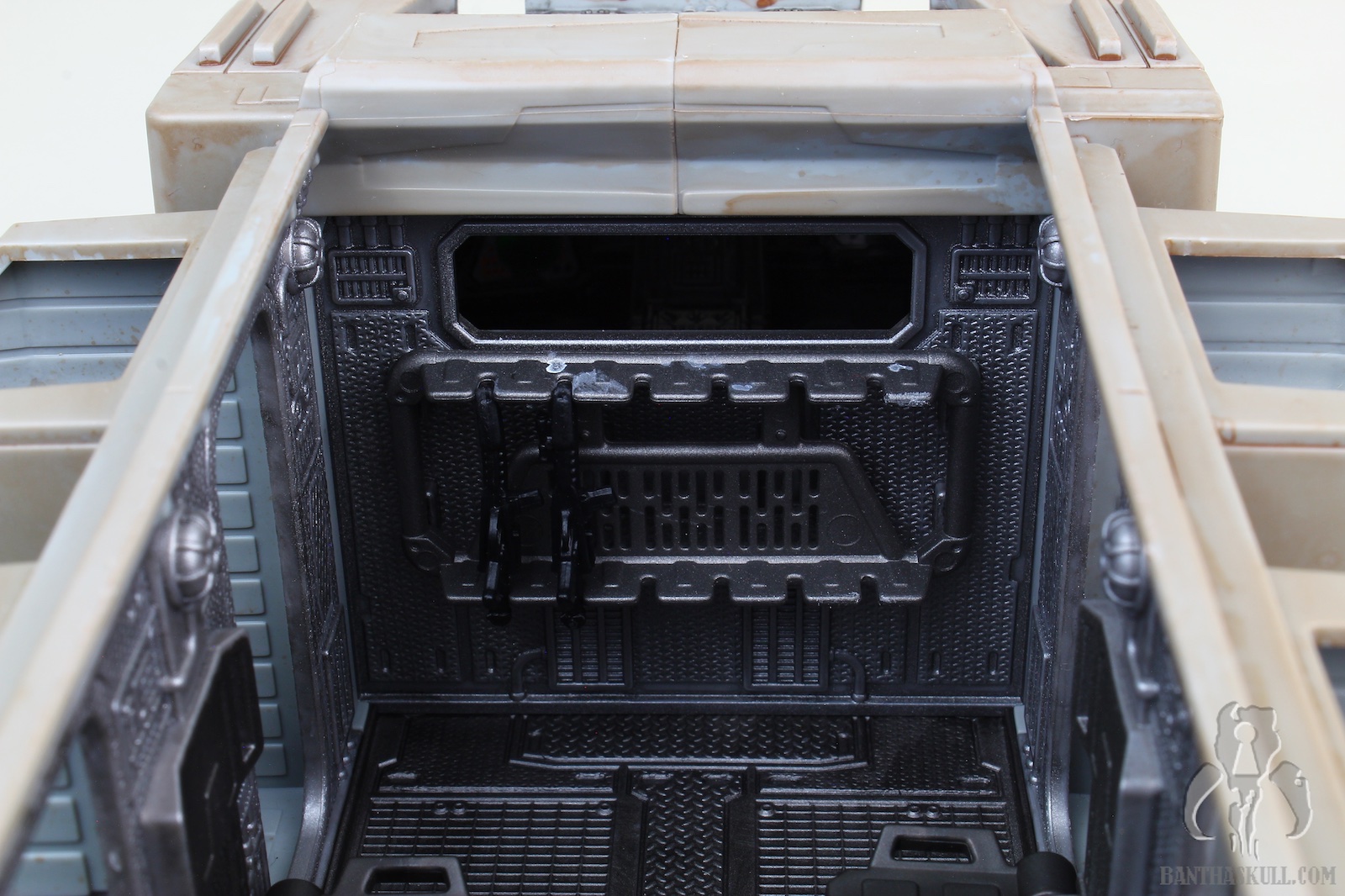 The vehicle has 3 rolling wheels, so you can glide it across the table, floor, or whatnot. It has 6 exterior troop compartments. Only the two that are closest to the front of the vehicle actually have a working door. I think we’d all prefer that each compartment had a working door, but this isn’t a deal breaker by any stretch. The cockpit interior is insanely detailed, and has a “ball jointed” controller, allowing you to move it for a more convenient way to insert your driver figure. Both sides of the cockpit have large doors that open up for easy access. The entire top of the vehicle is a removable piece. Even this piece has a lot of detail, although much is probably unnecessary as you can’t see it when the top is attached. But that’s obviously not a negative. It just shows the love that went into the sculpt. The interior has a lot to love. There are 4 fold-up seats for your troopers to sit. There’s even a weapons rack which holds 6 blasters perfectly. There’s also a “window” to see into the cockpit from the troop carrier hold. The top has a smaller hatch, which allows a trooper to stand and view out from the inside. A swivel canon on top has a 360 degree range of motion, and sports twin guns that also move up about 30 degrees. The back end of the vehicle is an upwardly opening hatch. This is reminiscent of the original Kenner vehicle. Instead of hiding the ol’ on/off switch, it opens to the roomy interior.