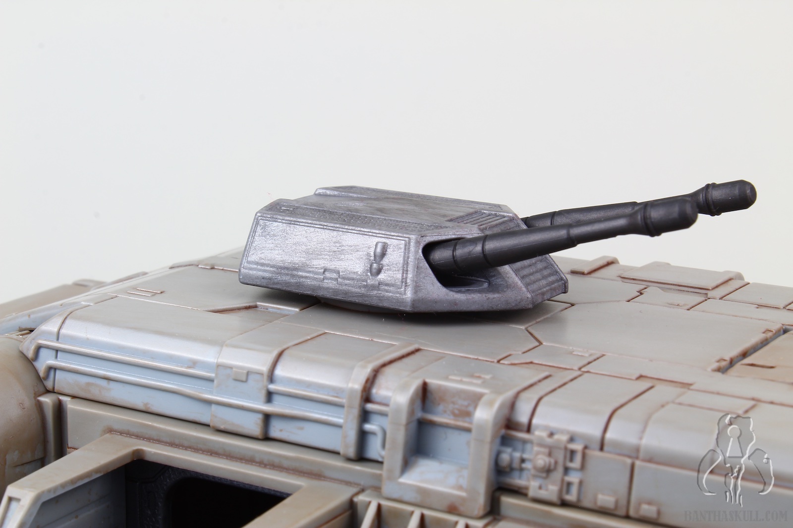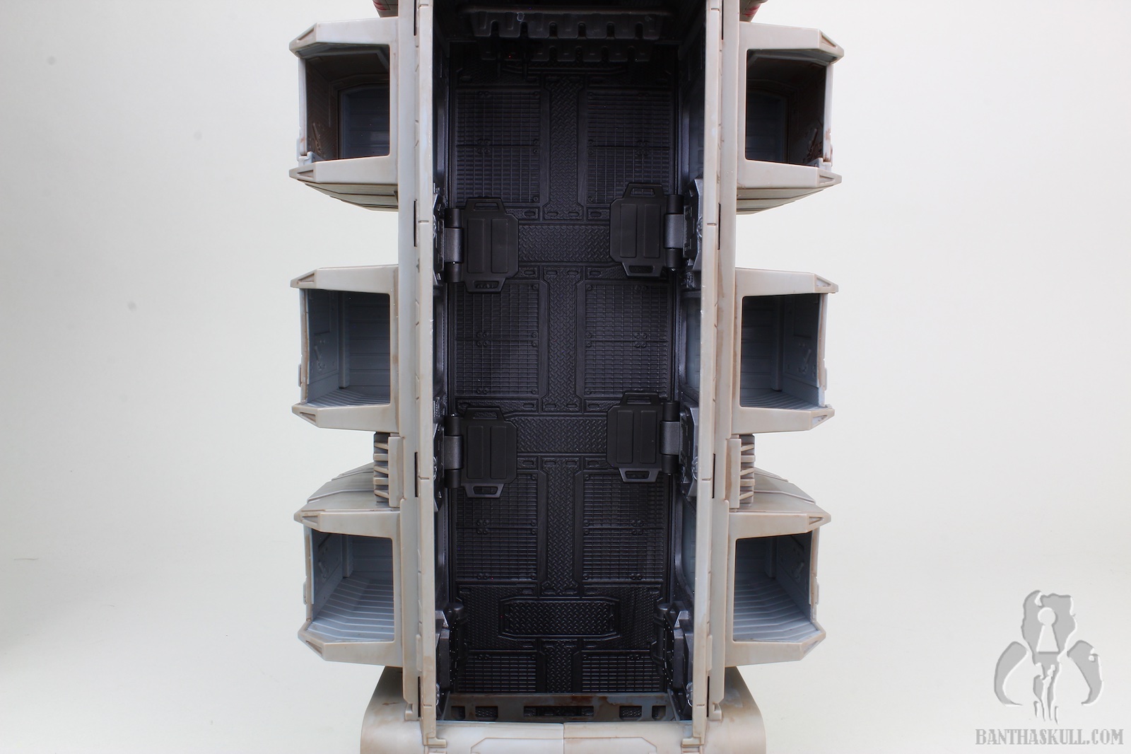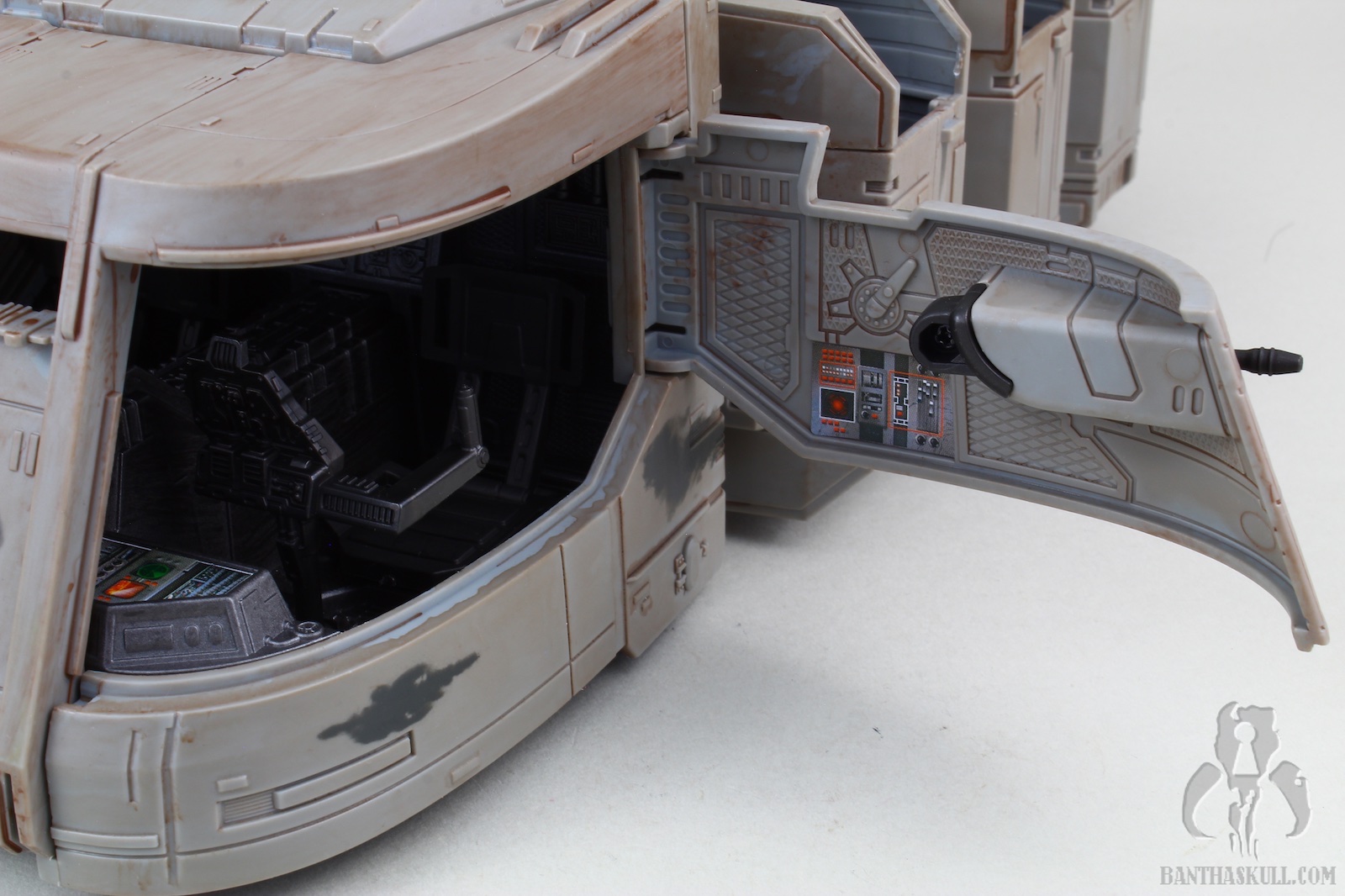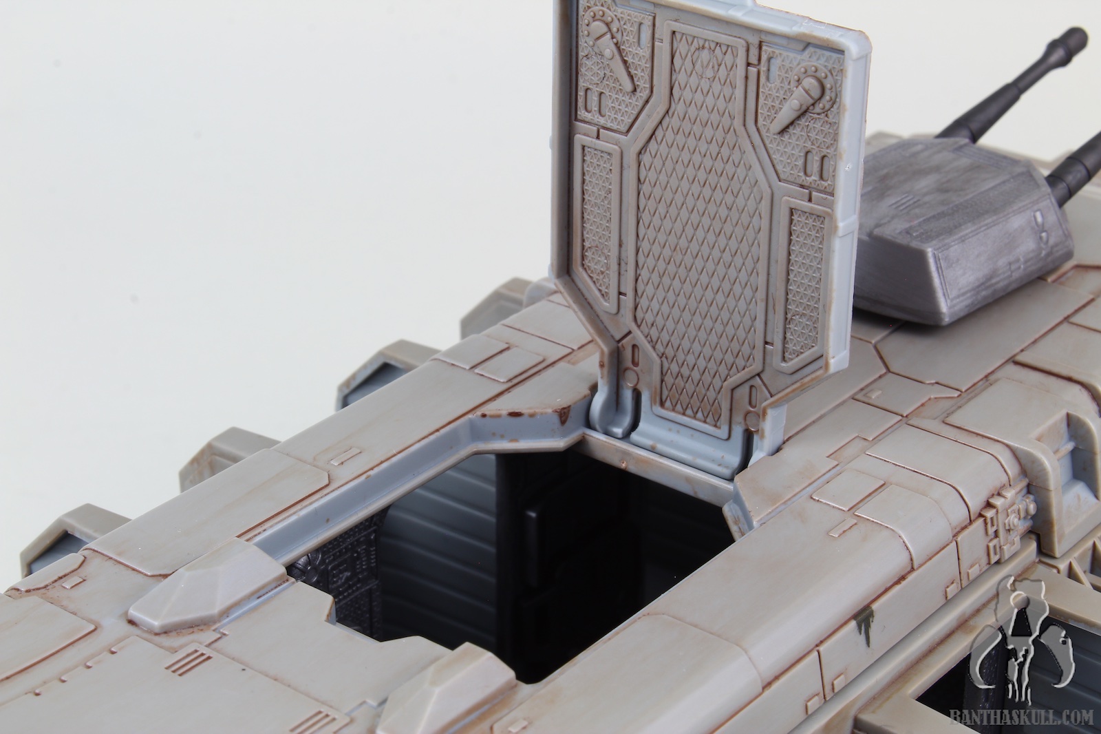 The vehicle has 3 rolling wheels, so you can glide it across the table, floor, or whatnot. It has 6 exterior troop compartments. Only the two that are closest to the front of the vehicle actually have a working door. I think we’d all prefer that each compartment had a working door, but this isn’t a deal breaker by any stretch. The cockpit interior is insanely detailed, and has a “ball jointed” controller, allowing you to move it for a more convenient way to insert your driver figure. Both sides of the cockpit have large doors that open up for easy access. The entire top of the vehicle is a removable piece. Even this piece has a lot of detail, although much is probably unnecessary as you can’t see it when the top is attached. But that’s obviously not a negative. It just shows the love that went into the sculpt. The interior has a lot to love. There are 4 fold-up seats for your troopers to sit. There’s even a weapons rack which holds 6 blasters perfectly. There’s also a “window” to see into the cockpit from the troop carrier hold. The top has a smaller hatch, which allows a trooper to stand and view out from the inside. A swivel canon on top has a 360 degree range of motion, and sports twin guns that also move up about 30 degrees. The back end of the vehicle is an upwardly opening hatch. This is reminiscent of the original Kenner vehicle. Instead of hiding the ol’ on/off switch, it opens to the roomy interior.