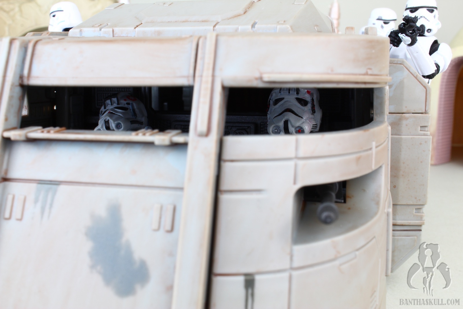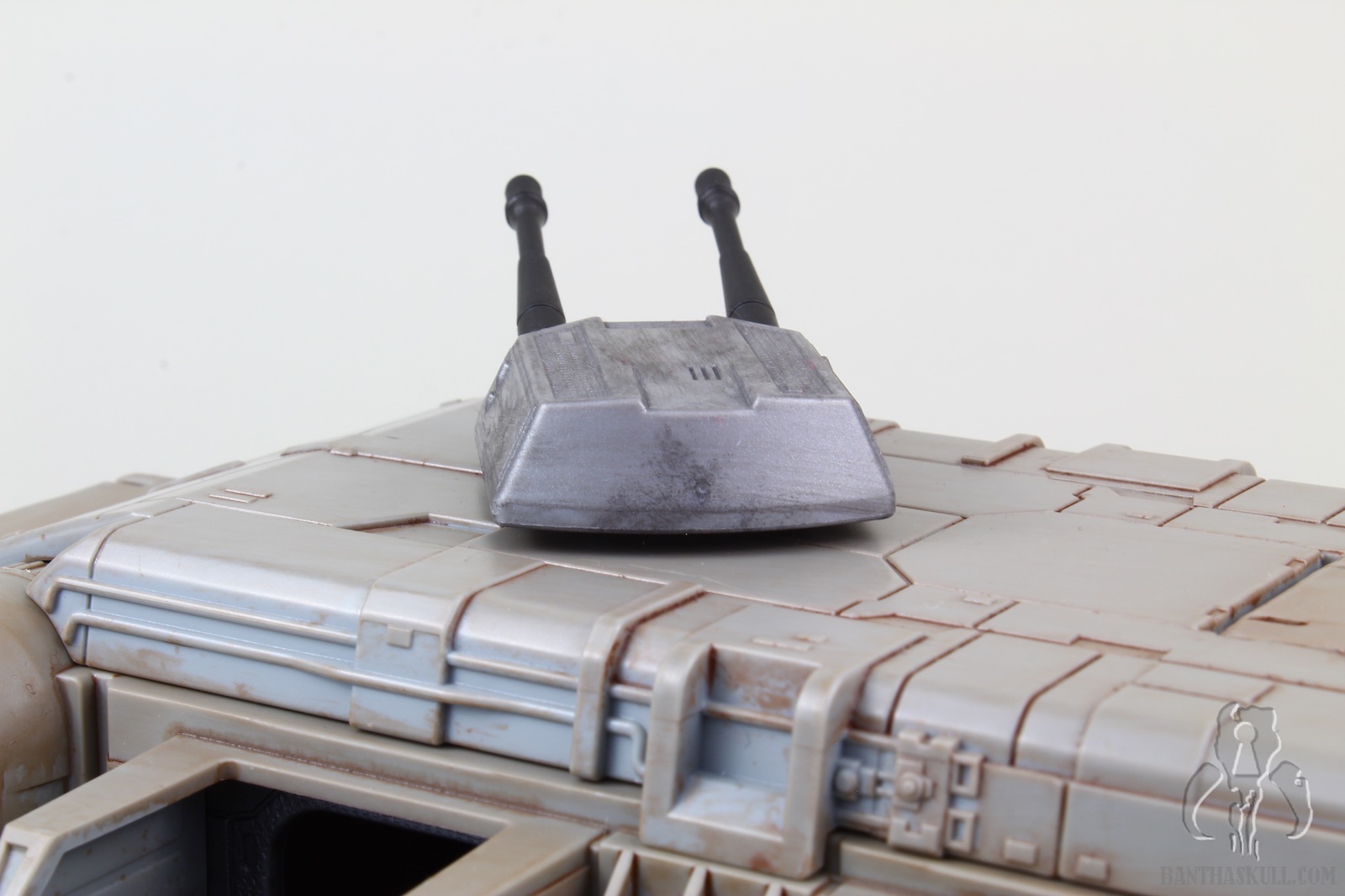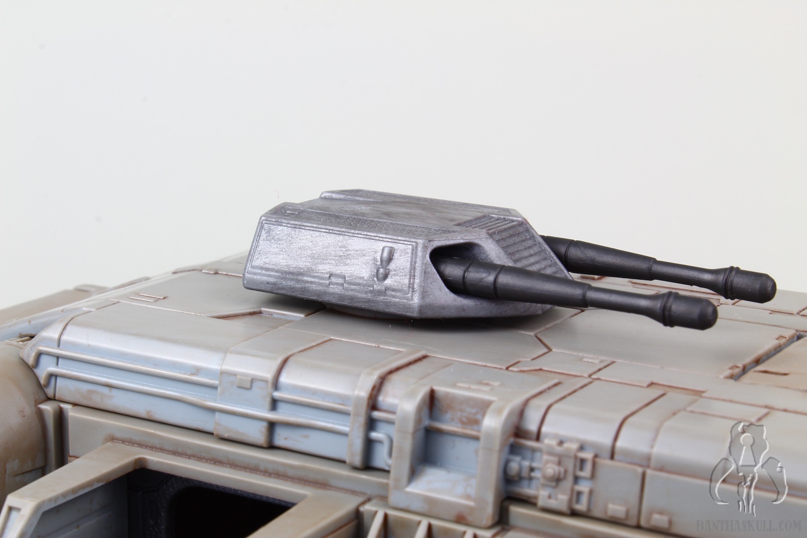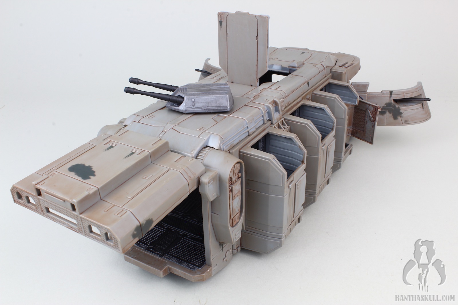 The vehicle has 3 rolling wheels, so you can glide it across the table, floor, or whatnot. It has 6 exterior troop compartments. Only the two that are closest to the front of the vehicle actually have a working door. I think we’d all prefer that each compartment had a working door, but this isn’t a deal breaker by any stretch. The cockpit interior is insanely detailed, and has a “ball jointed” controller, allowing you to move it for a more convenient way to insert your driver figure. Both sides of the cockpit have large doors that open up for easy access. The entire top of the vehicle is a removable piece. Even this piece has a lot of detail, although much is probably unnecessary as you can’t see it when the top is attached. But that’s obviously not a negative. It just shows the love that went into the sculpt. The interior has a lot to love. There are 4 fold-up seats for your troopers to sit. There’s even a weapons rack which holds 6 blasters perfectly. There’s also a “window” to see into the cockpit from the troop carrier hold. The top has a smaller hatch, which allows a trooper to stand and view out from the inside. A swivel canon on top has a 360 degree range of motion, and sports twin guns that also move up about 30 degrees. The back end of the vehicle is an upwardly opening hatch. This is reminiscent of the original Kenner vehicle. Instead of hiding the ol’ on/off switch, it opens to the roomy interior.