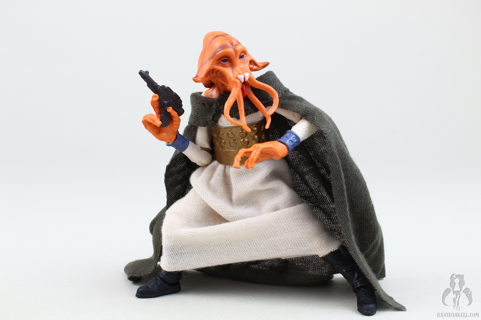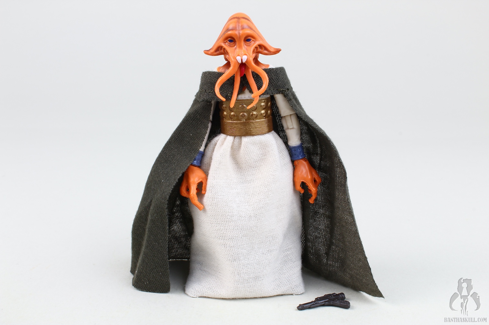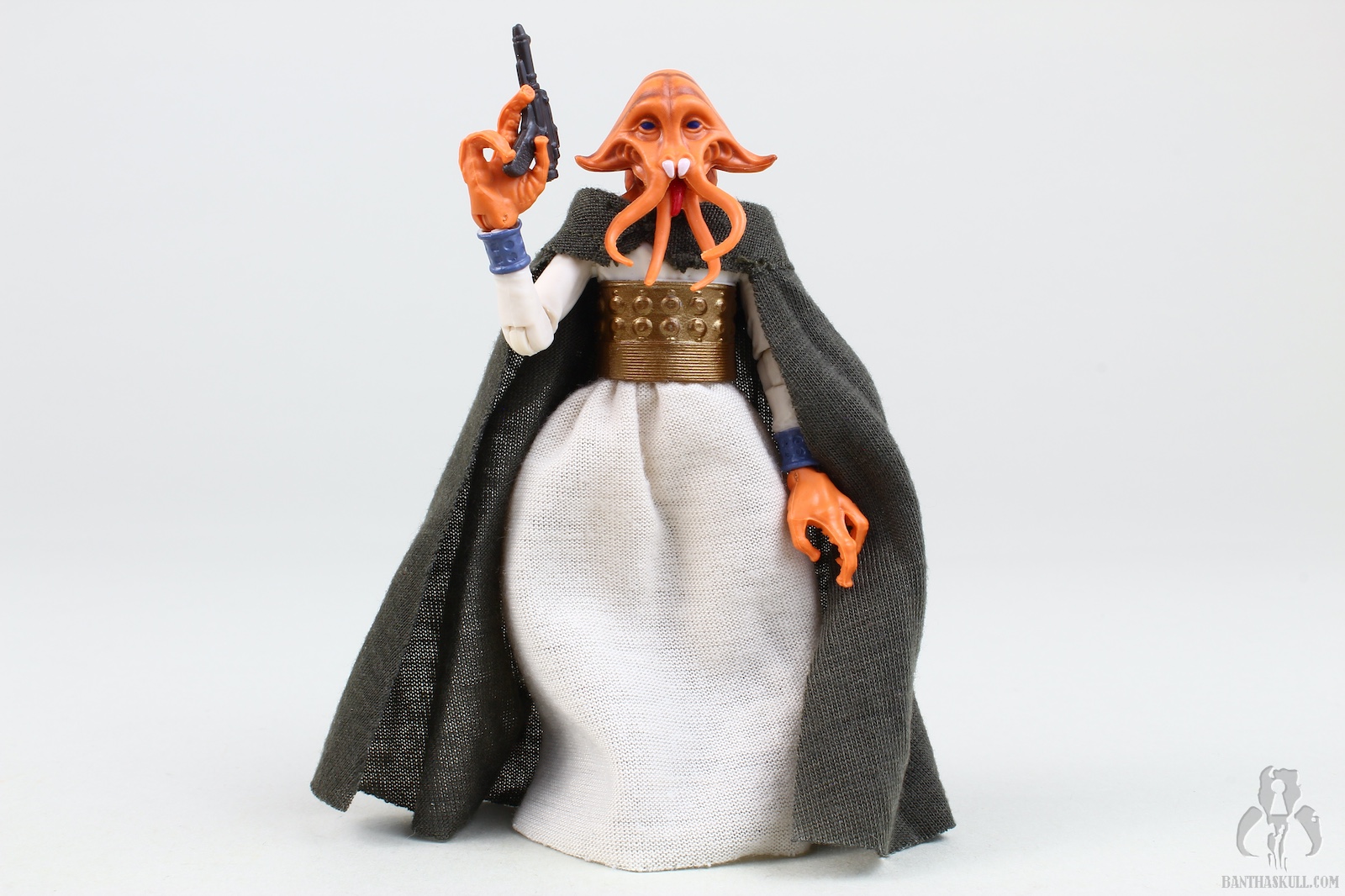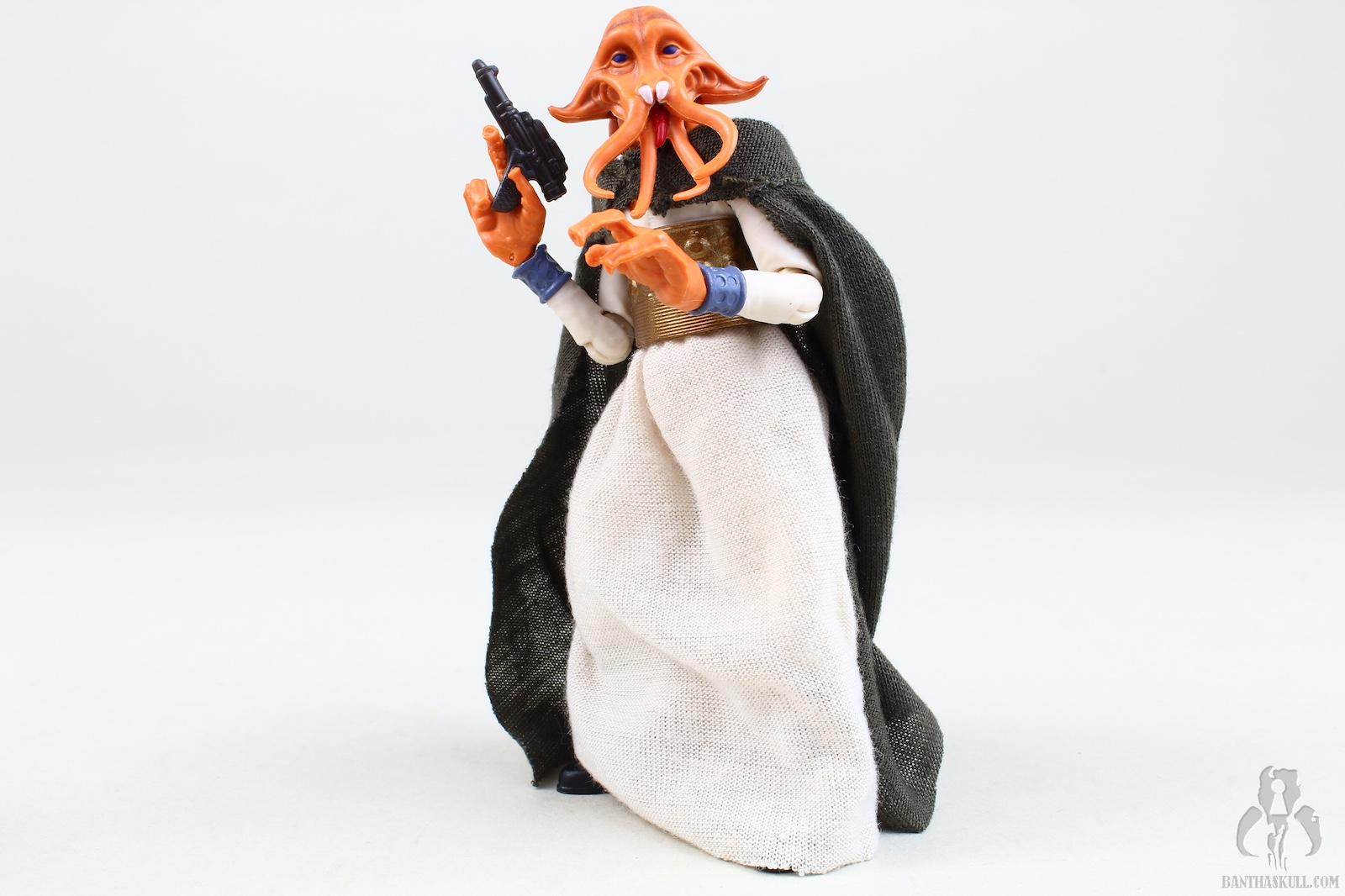The paint is well applied, with the head showing some nice details (although the coloring isn’t quite as I see on screen), and the waist band having a nice metallic sheen. The soft goods skirt is well done, leaving enough room to allow for some nice action posing. The cape is a great nod to the Kenner figure, and looks great. Tessek comes with a pistol that he grips firmly.