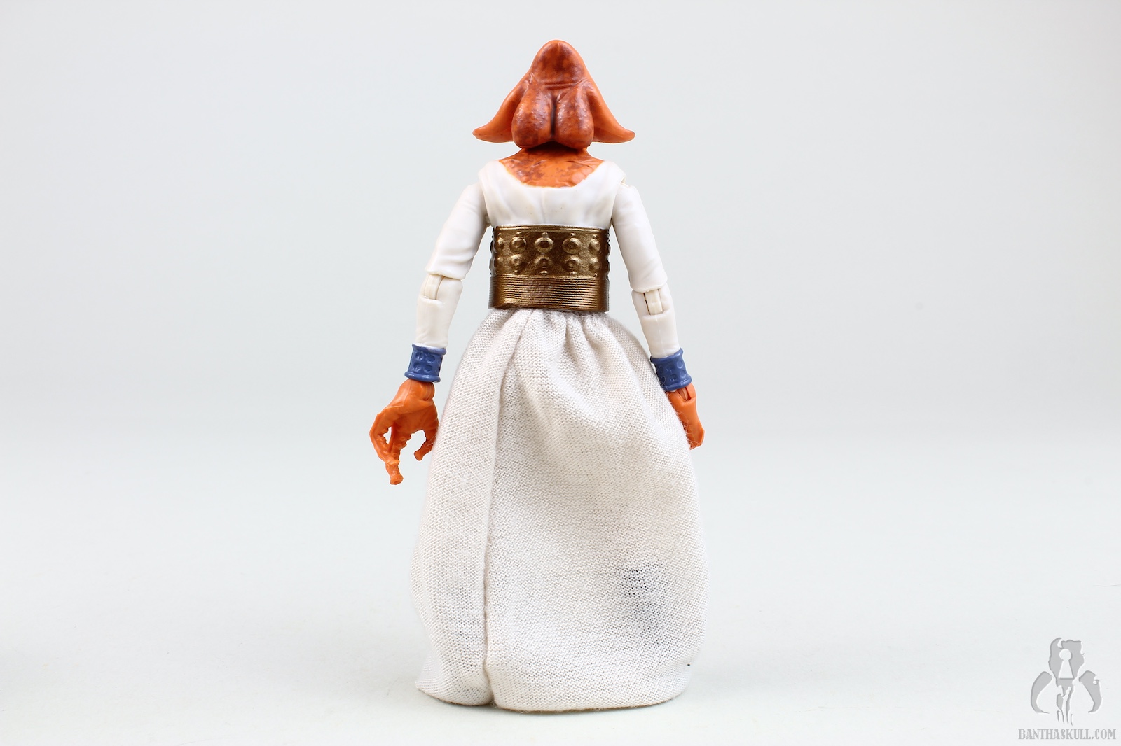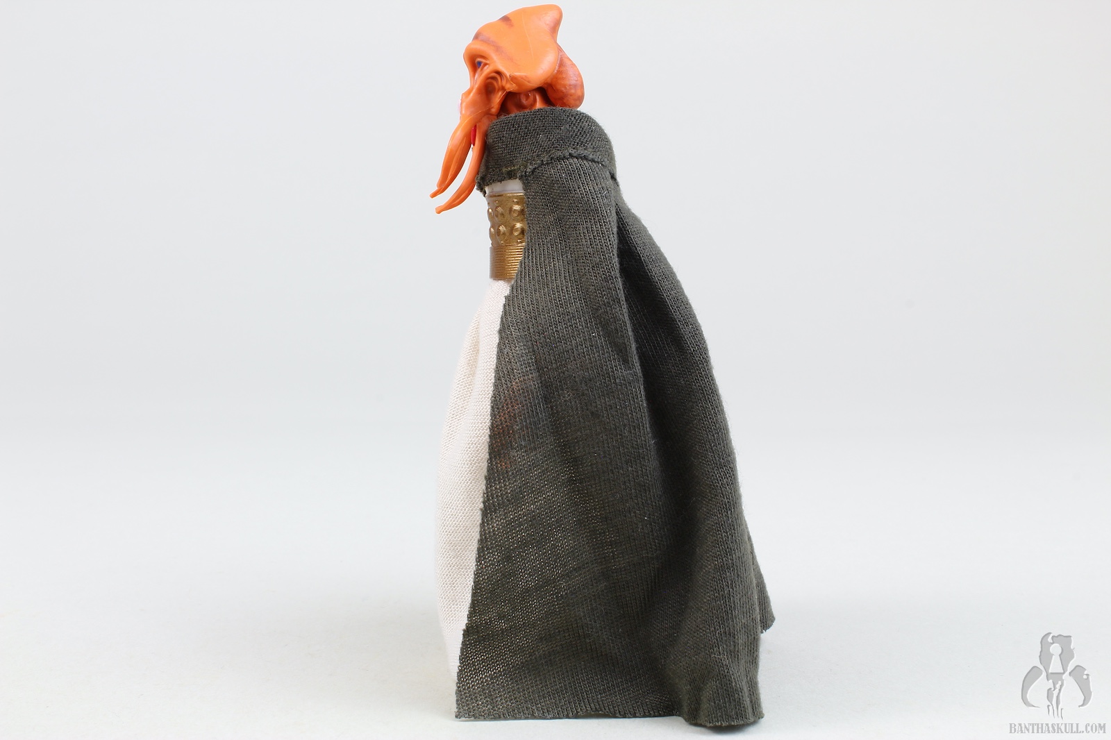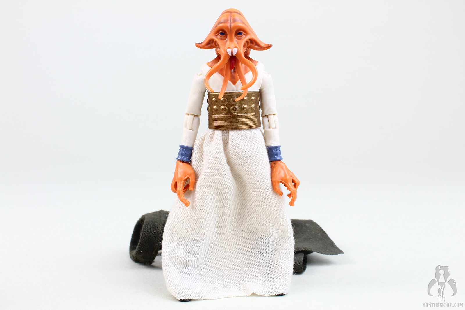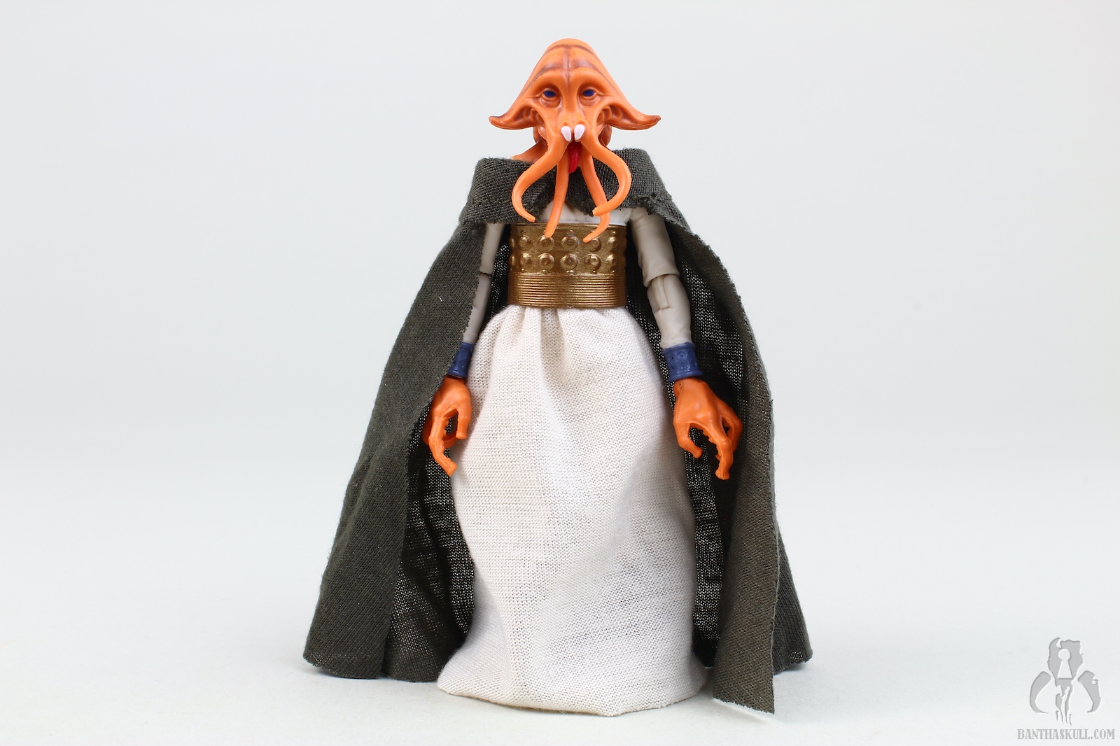 The paint is well applied, with the head showing some nice details (although the coloring isn’t quite as I see on screen), and the waist band having a nice metallic sheen. The soft goods skirt is well done, leaving enough room to allow for some nice action posing. The cape is a great nod to the Kenner figure, and looks great. Tessek comes with a pistol that he grips firmly.