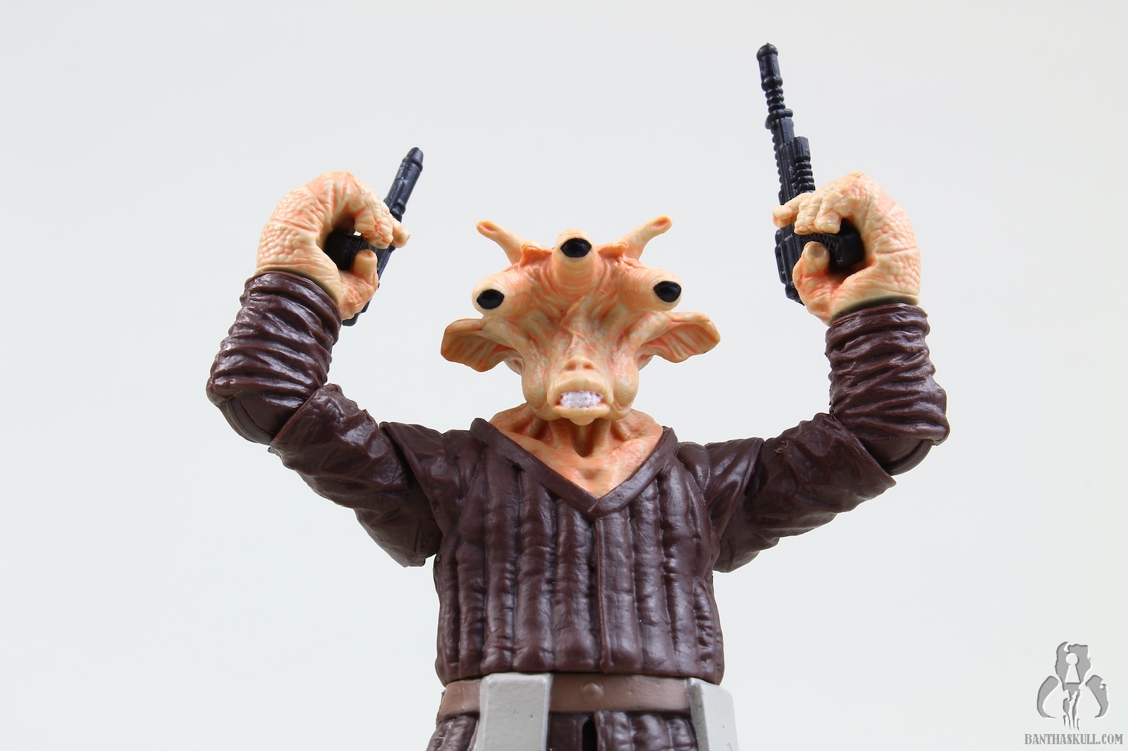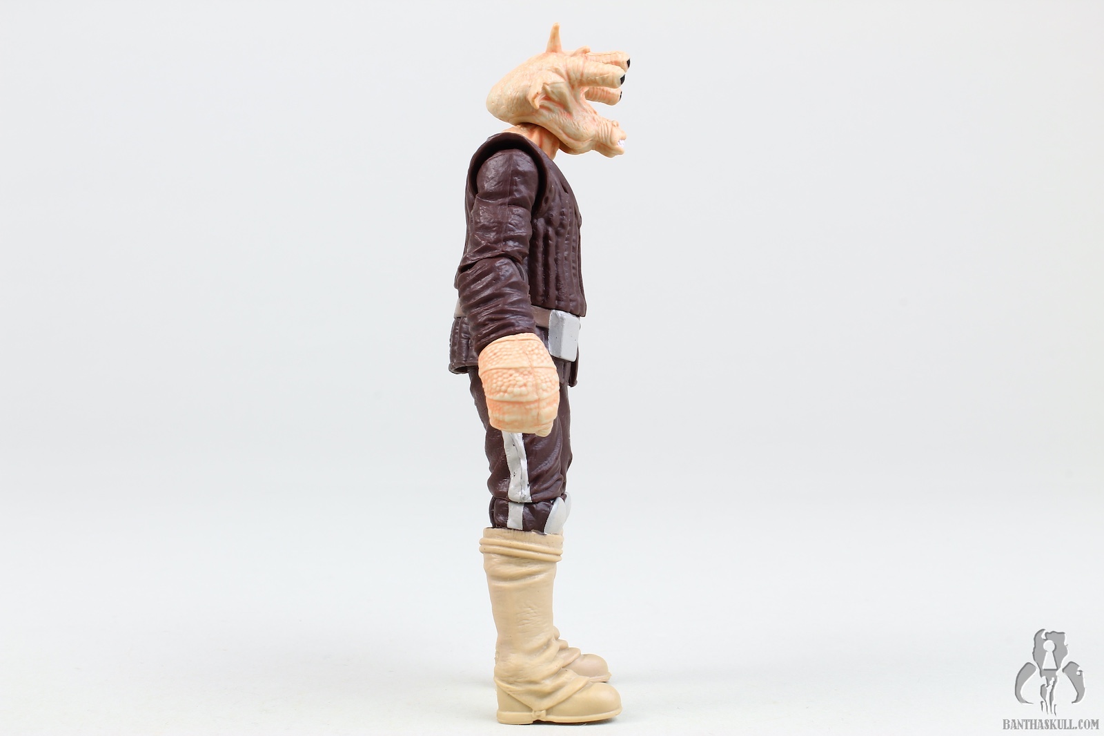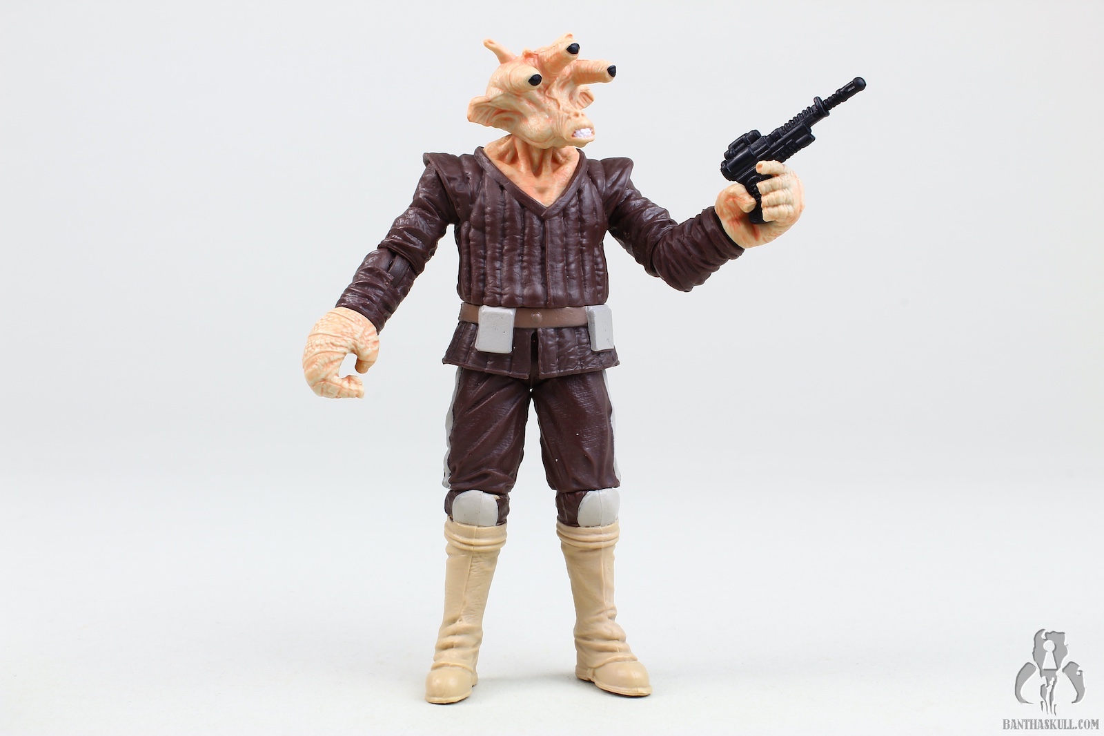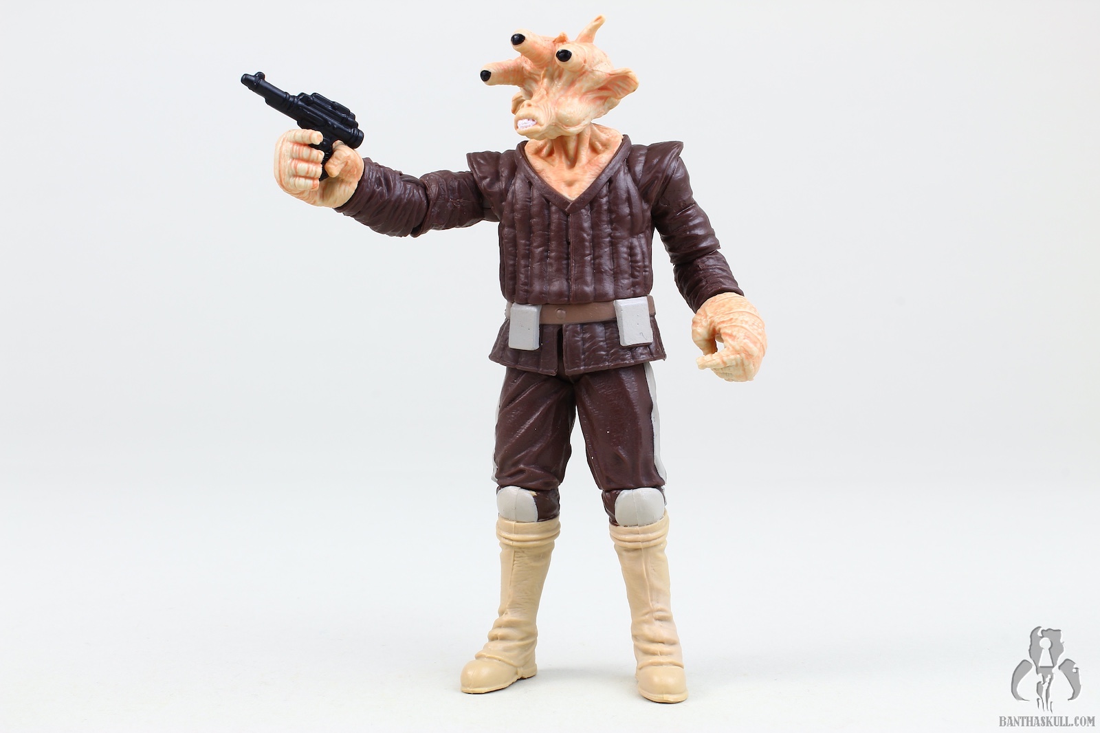 The paint is well applied, with the head showing some nice details (although the coloring isn’t quite as I see on screen), and the waist band having a nice metallic sheen. The soft goods skirt is well done, leaving enough room to allow for some nice action posing. The cape is a great nod to the Kenner figure, and looks great. Tessek comes with a pistol that he grips firmly.