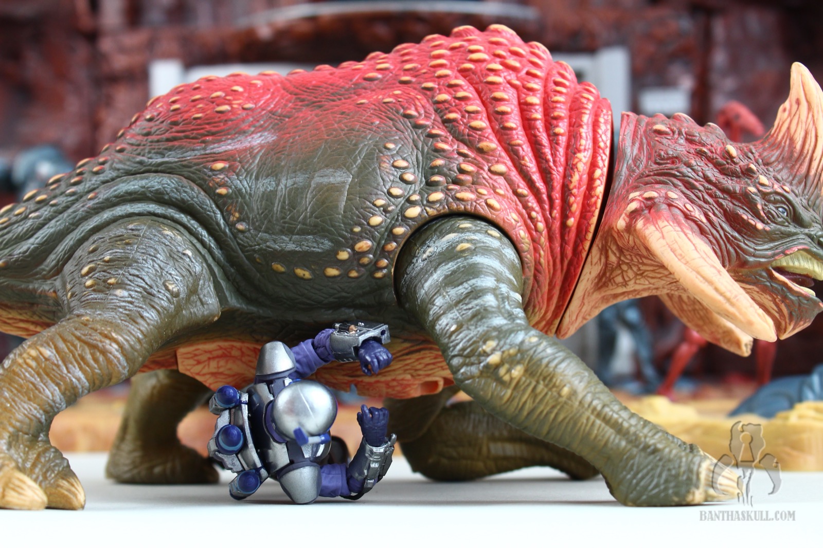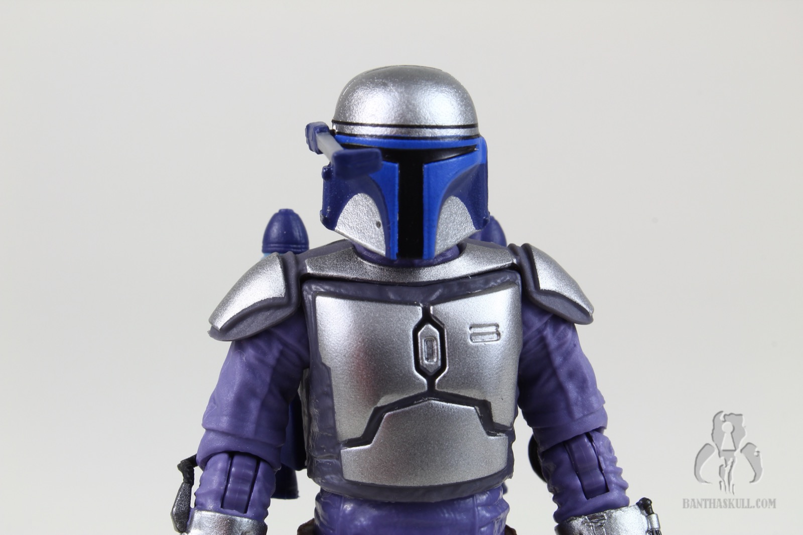 A knock on VC34 was the weird “floating” holsters. Hasbro corrected this silliness, as they lie flat on the hips, as they should. However, they do hinder the full range of motion of the hip joints. The blasters fit snugly in the holsters, as well as naturally in each of Jango’s hands. The JT-12 backpack is a little loose as it fits on the figure’s back. It falls out pretty easily, which can be frustrating. Conversely, the flame effects snap solidly into the thrusters. They’re actually a little tough to connect, and if you’re not careful, you might damage the soft plastic of the narrow base of those thrusters. And one last complaint - the feet are sculpted a bit too realistically, and have an arch near the toes that reduces the surface area of the soles. This can make the figure a bit prone to rocking forward or back as you try to pose. It’s been a common thing in figures over the years. I think Hasbro should focus more on sculpting the figures completely flat-footed, so they stand better.