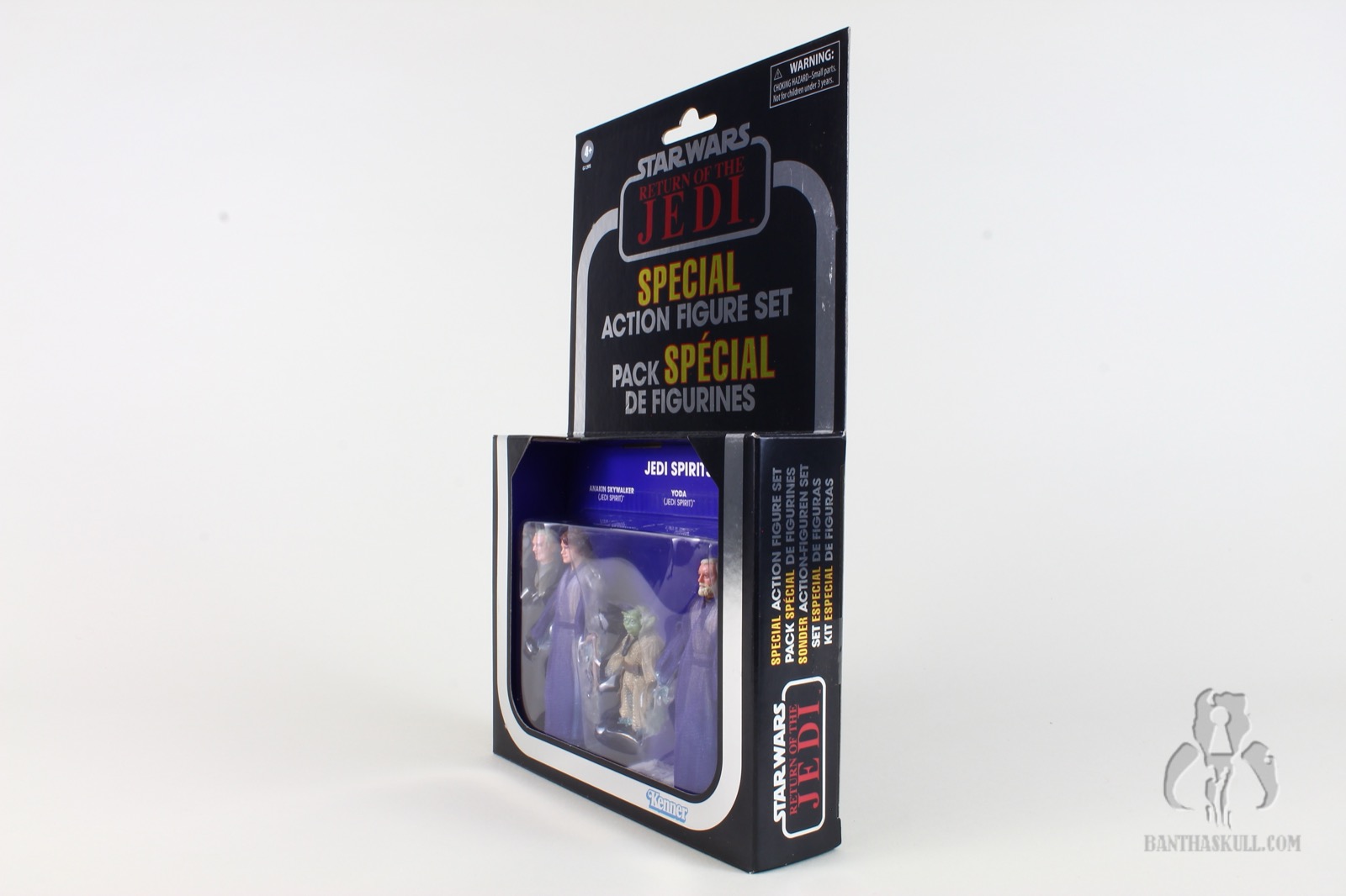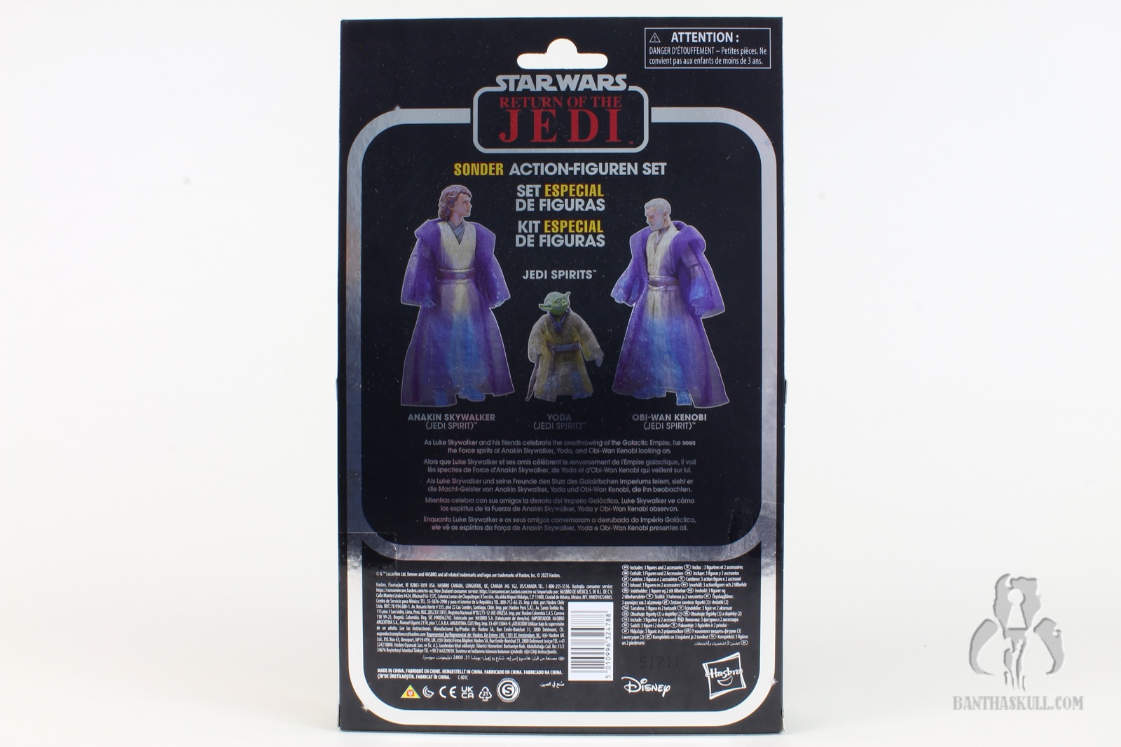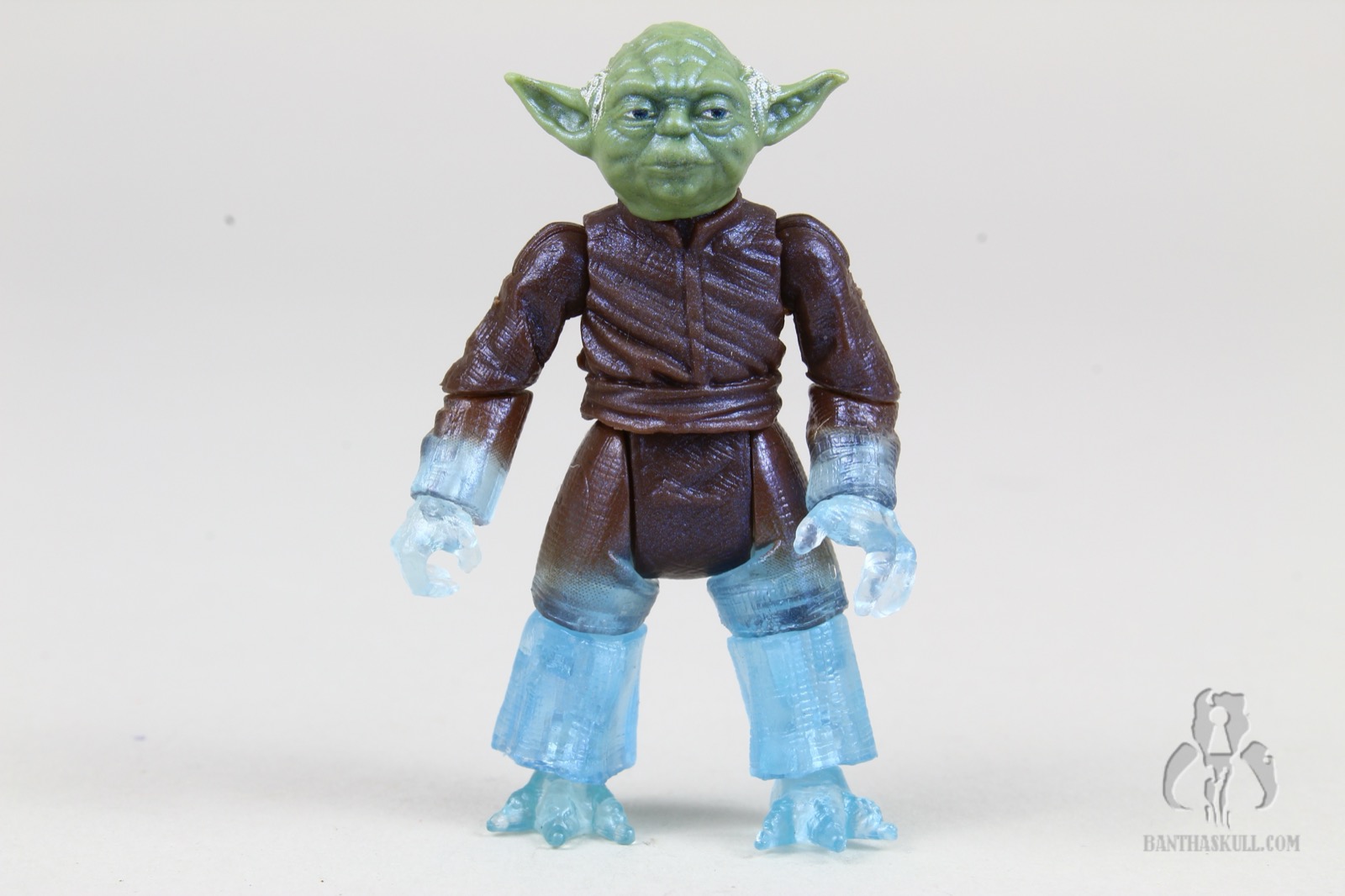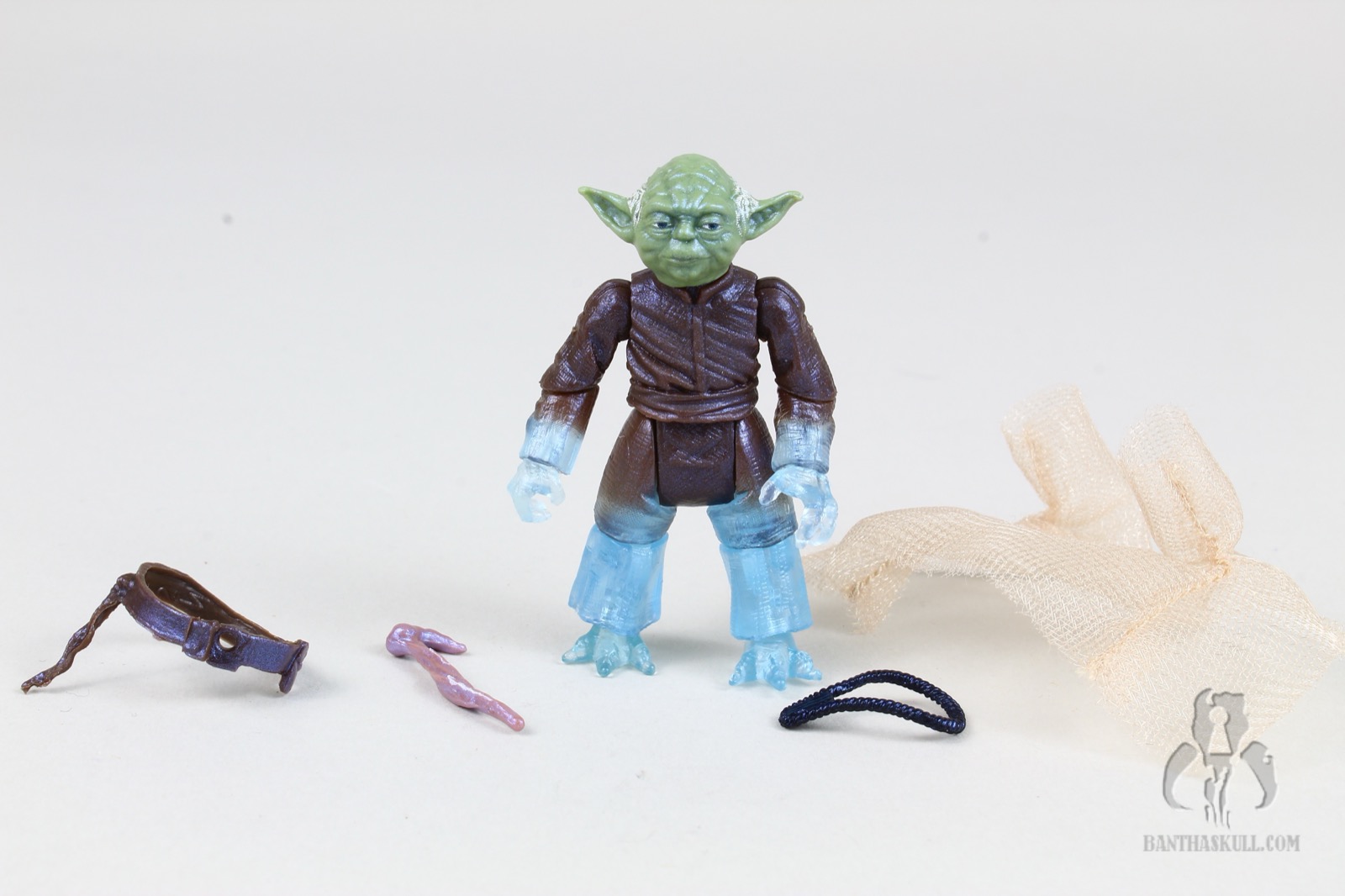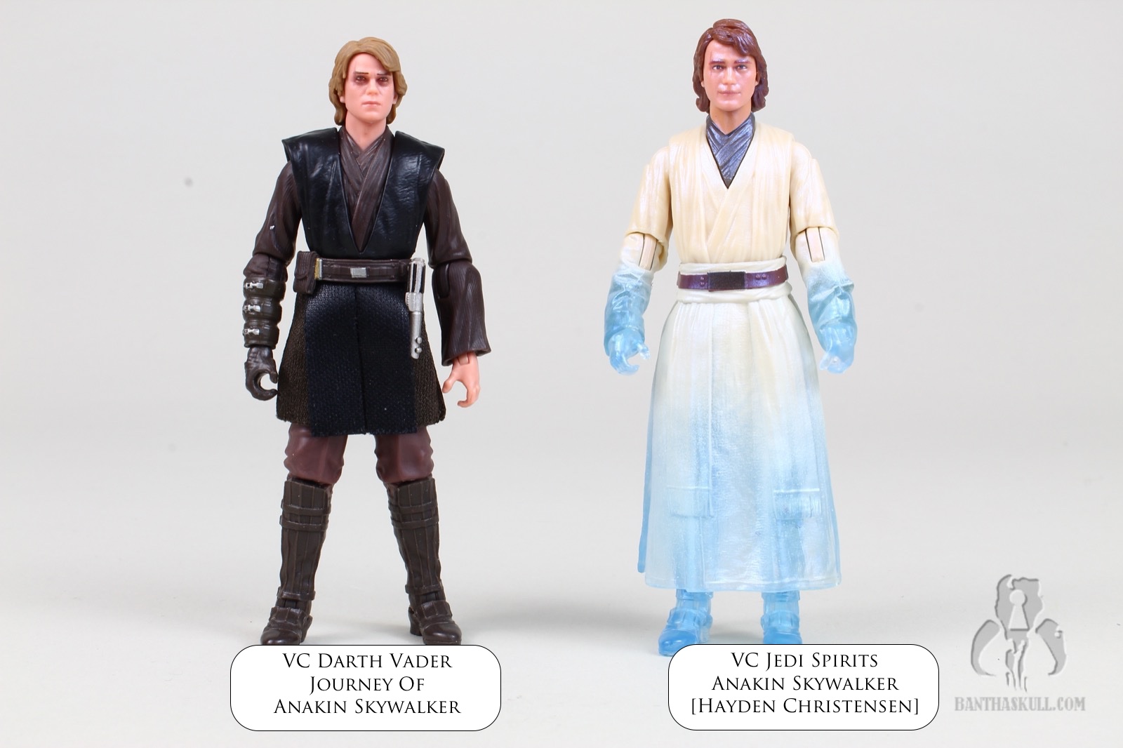 Anakin’s spirit has a convoluted history, of course. The first release was from 1998, as part of the POTF2 (Phase 3) Jedi Spirits Cinema Scene. The 3 figures were essentially statues cast in a translucent plastic and had no paint apps to speak of. My set has a “dusting” of white paint on the figures. I was never sure if this was intentional, or if I got a bad set. But otherwise, the the mini-statues are just solid, and the limited articulation (heads and arms) seem to be glued in place and I never wanted to test out potential movement for fear of breakage.