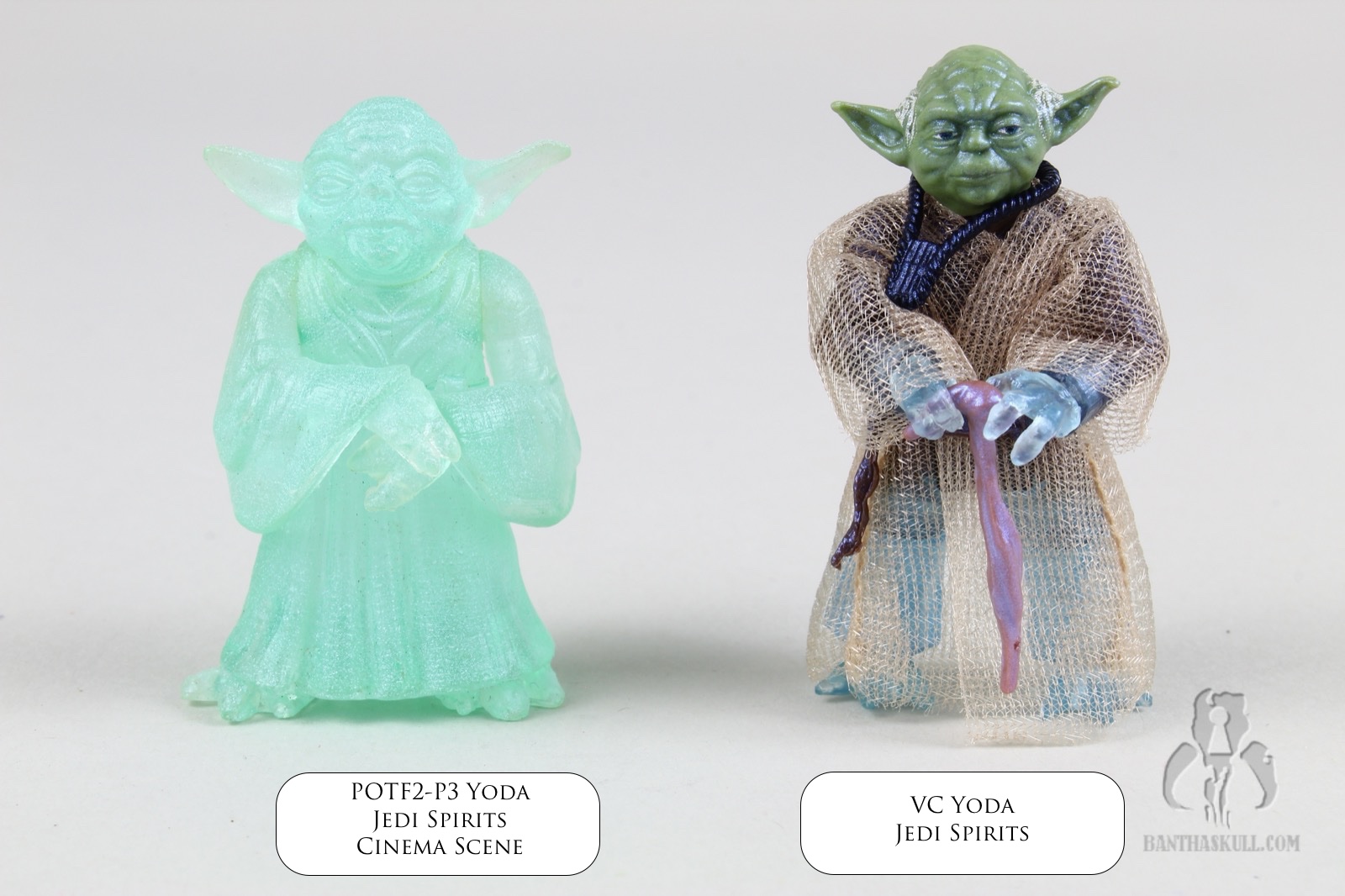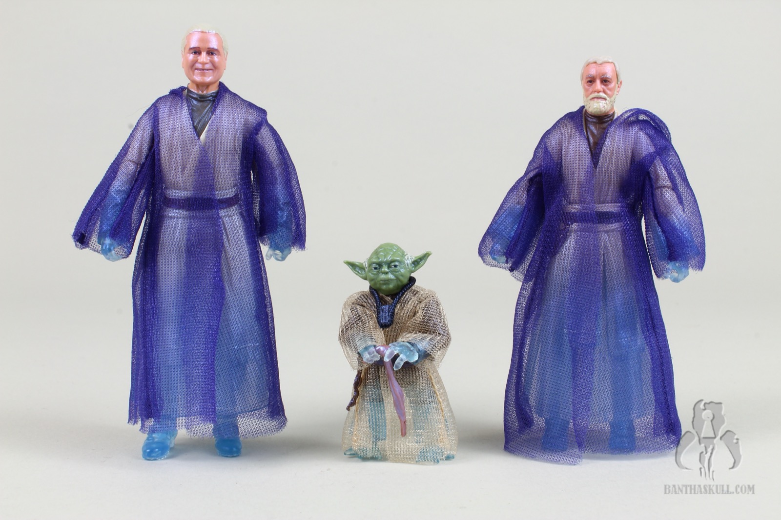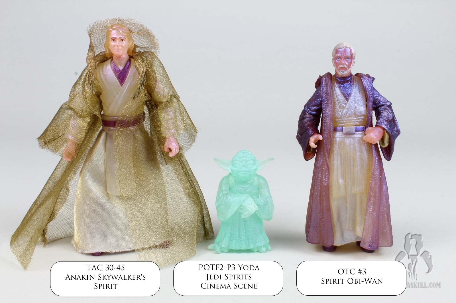 Obi-Wan as a spirit was first released as a Frito-Lay mail away figure in 1997. It’s debatable as to what the source might be, as it could be his appearance on Hoth (ESB), Dagobah (ESB/ROTJ), or Endor (ROTJ). A slightly re-tooled version was part of the 1998 Cinema Scene. In 2004, Hasbro revisited this figure, and gave us a very nice Spirit of Obi-Wan from the Original Trilogy Collection. This one was sourced to ESB Dagobah. It sported a colorful ghostly appearance, but was fully plastic. By the time the aforementioned TAC Anakin was released, the two figures were wildly different. Joined with the 1998 Yoda, the triplets were a complete mess.