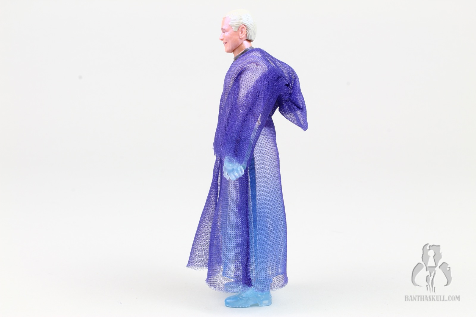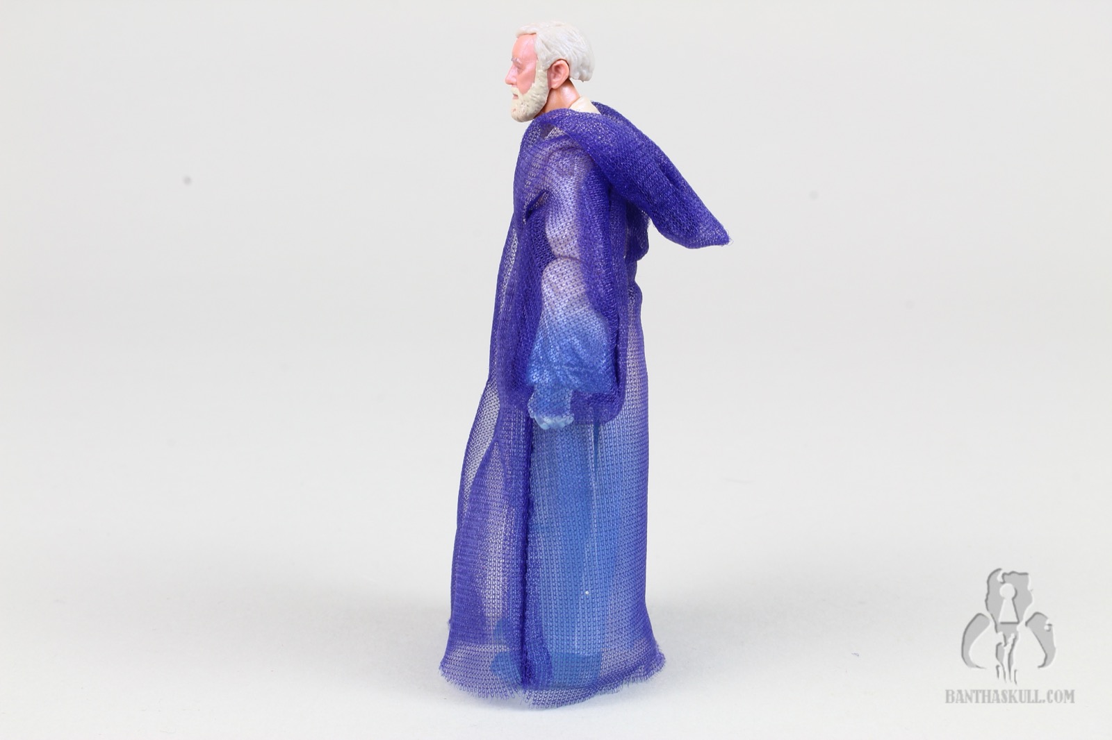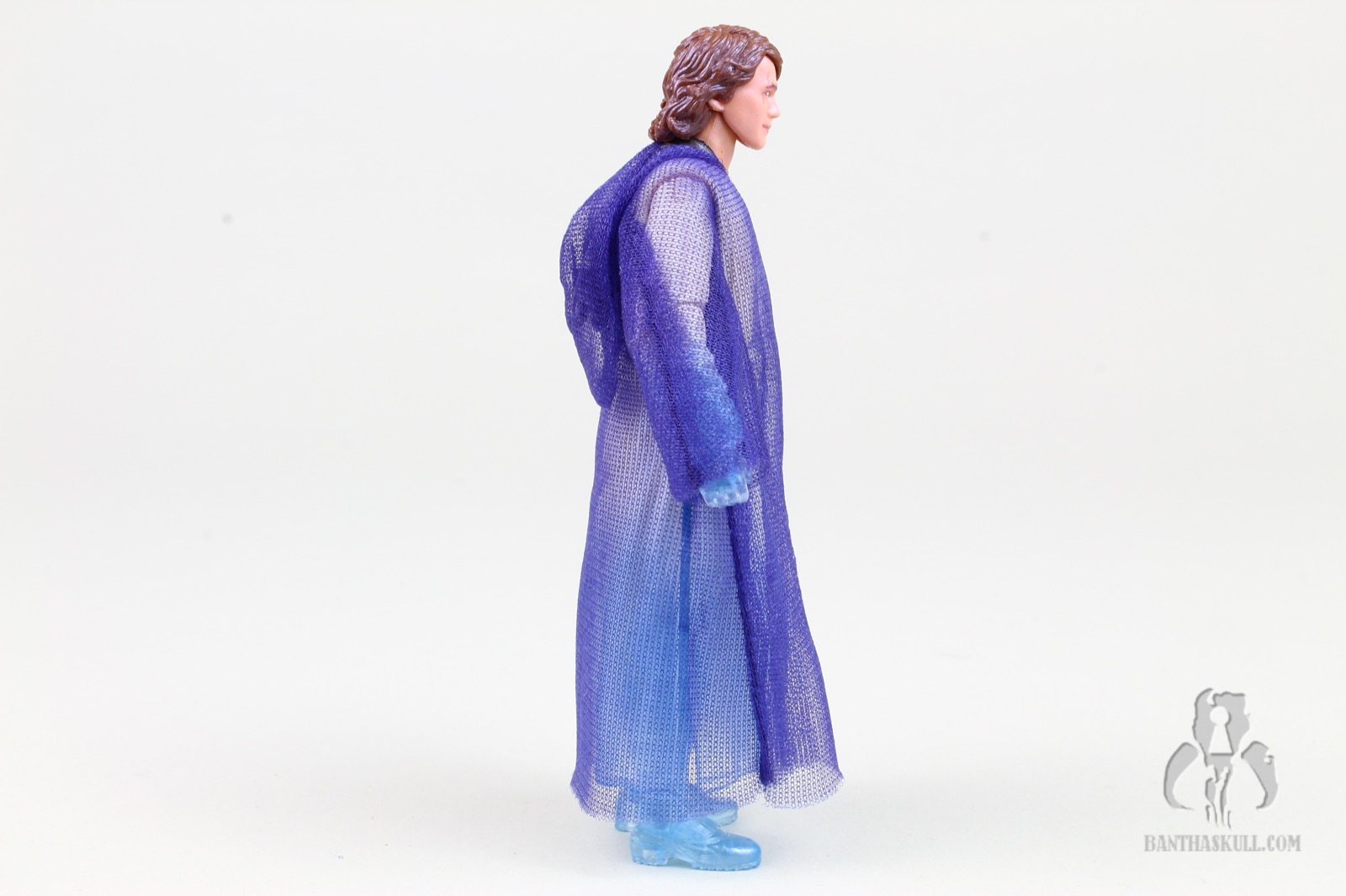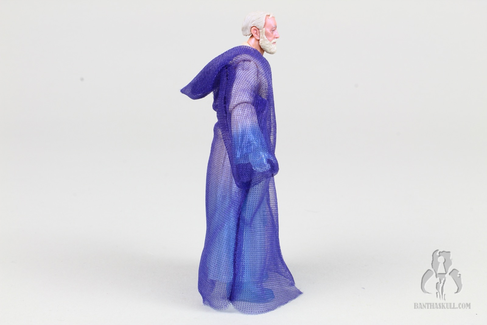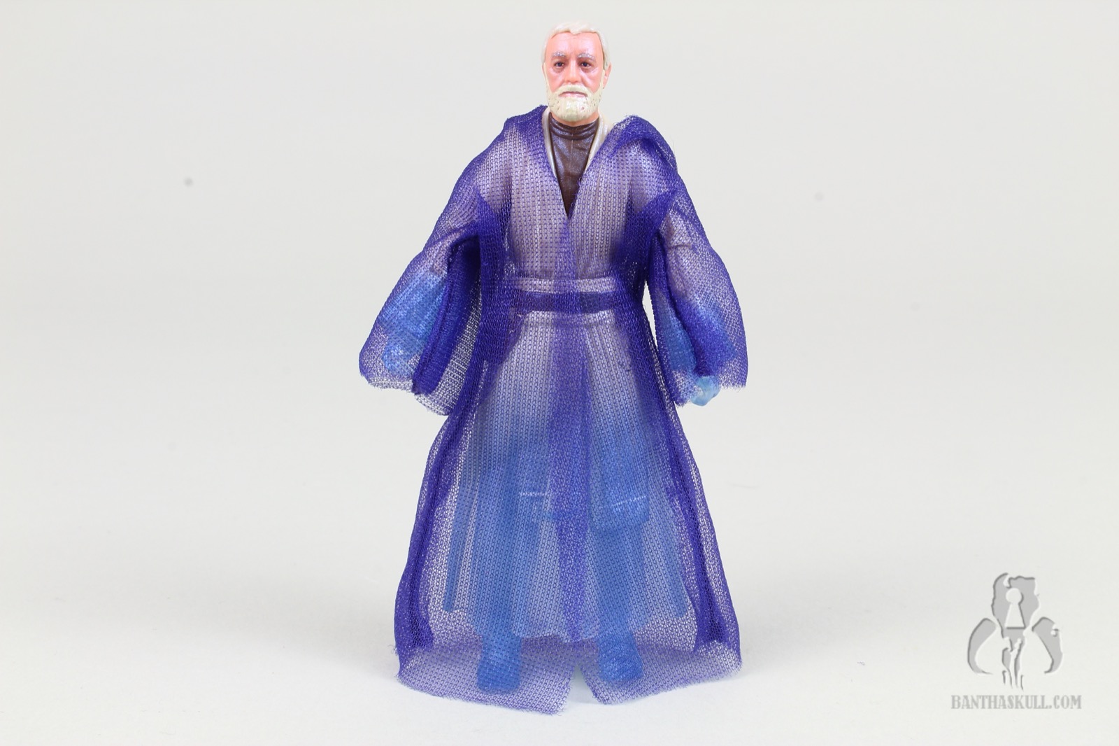 In this Special Set, Anakin is the star. First, it seems to use a partly new sculpt for the body (perhaps using a few parts from existing figures). The forearms, hands, legs, and soft plastic skirt appear to be cast in a translucent blue plastic. Those parts look to be painted in a way that fades from the blue into the light brown coloring of the robes. The rest of the parts are cast in solid colors. It’s an interesting effect, almost as if the central part of the character is more “present”, while the limbs fade into a more ghostly blue. For articulation, the figure has a wide range of JLA, and the soft plastic skirt has slits down the sides to allow the legs to move freely. The soft goods robe is of a light mesh that is quite similar to that used in the aforementioned TAC Anakin, but this time the cut is much more realistic, instead of the billowing nonsense that we used to get for Jedi robes. This time, instead of gold, the robe is a ghostly blue.