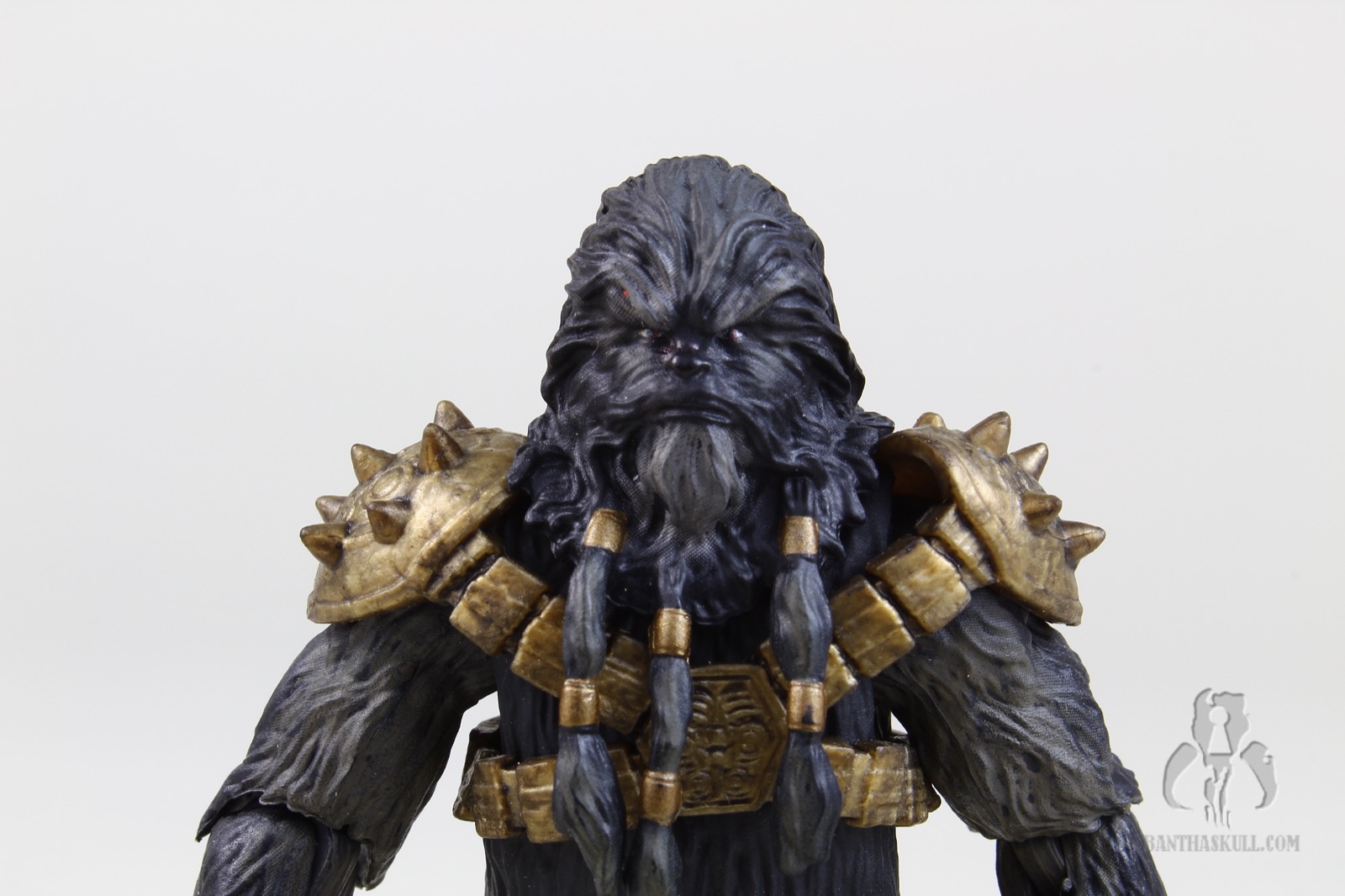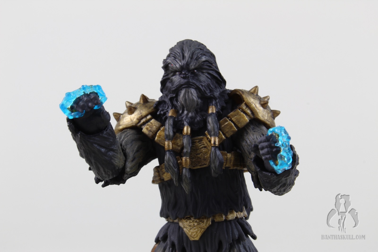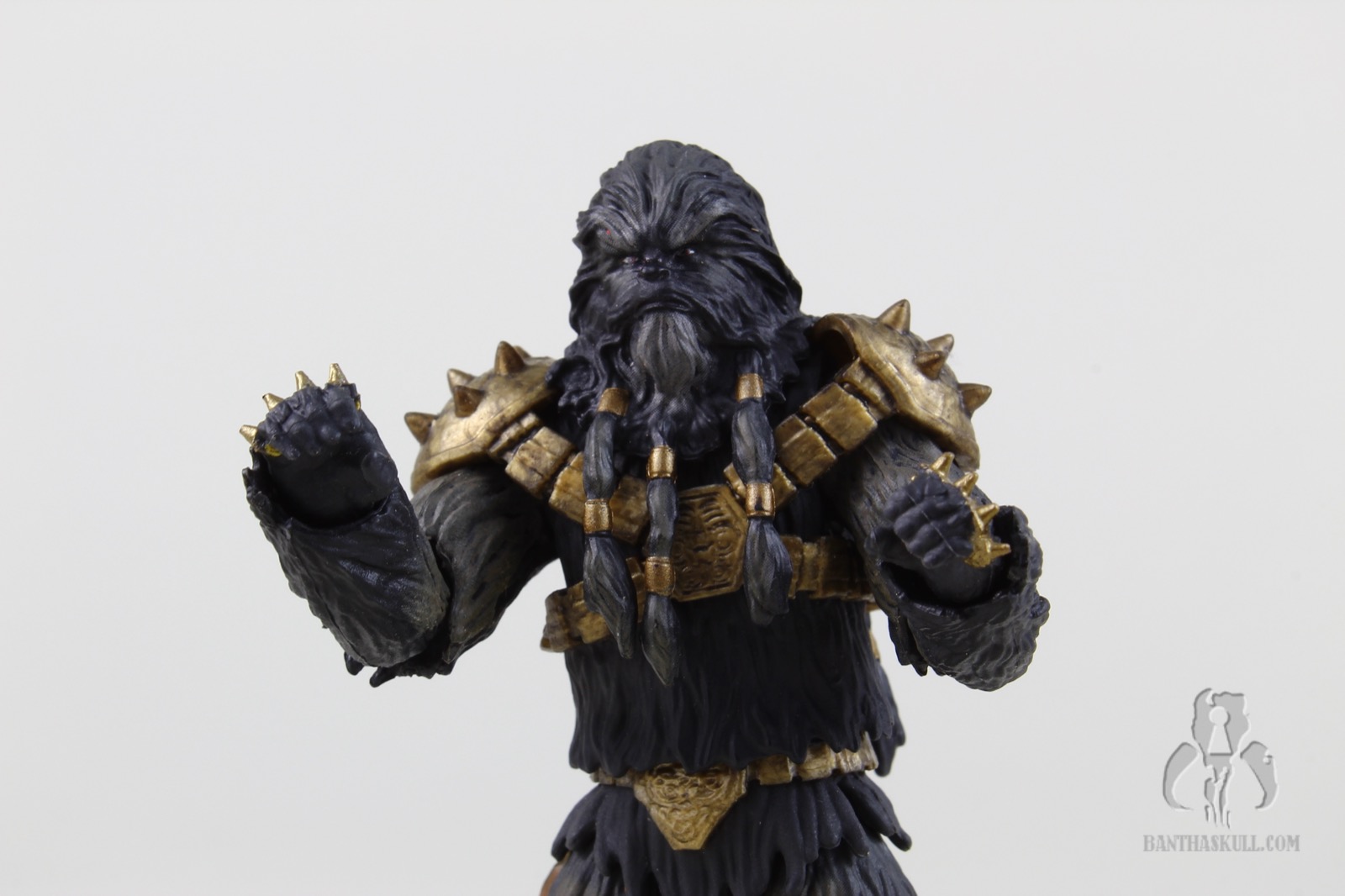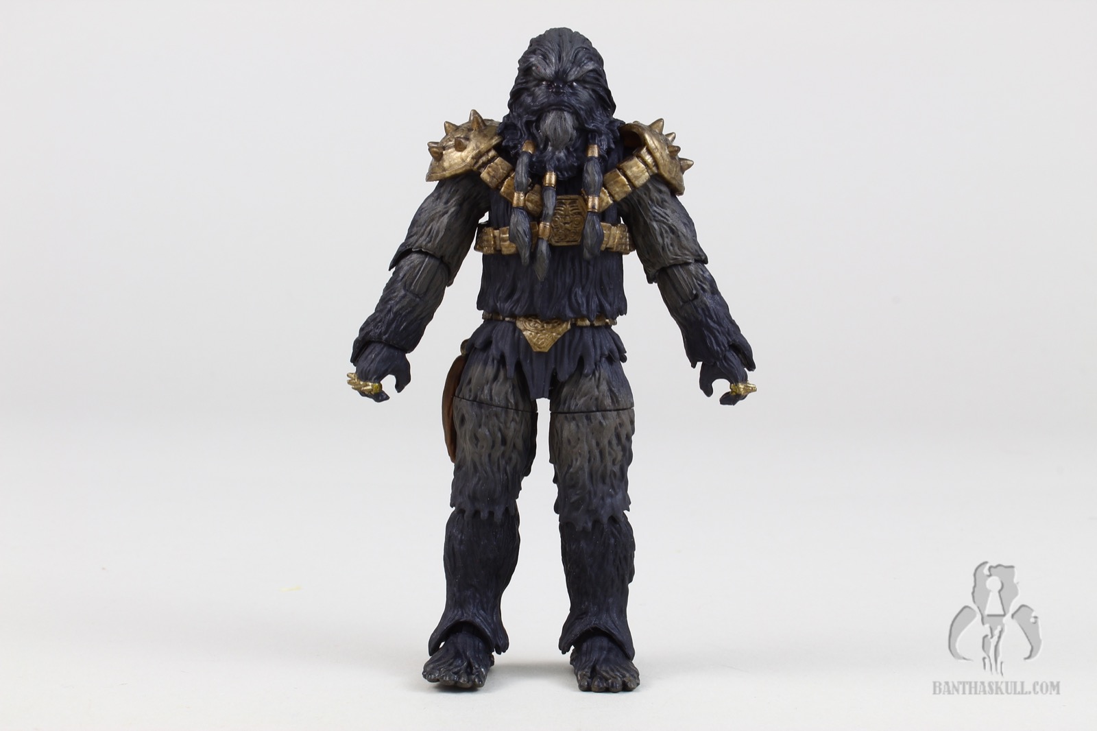 Krrsantan has nice paint ops, which various shades of fur all around. He’s got his large gold armored harness, which I assume is removable if you were adventurous enough to try (I am not). His hands come with spiked knuckles. The facial sculpt is really nice, and is complemented by the PhotoReal paint. The articulation points are all there, but the sculpting of the fur demanded a few compromises that limit the range of motion. The elbows and knees hit 90 degrees, but many of today’s figures bend further. The shoulders are hindered somewhat by the large spiked armor pieces. The fur and braids limit the ability to turn the head, or look up or down. The wrists are ball jointed and the ankles are rocker style, but again, none of them are as rangey as found in other figures. I understand the tradeoffs, and accept these limitations in favor of the great aesthetics of the figure.