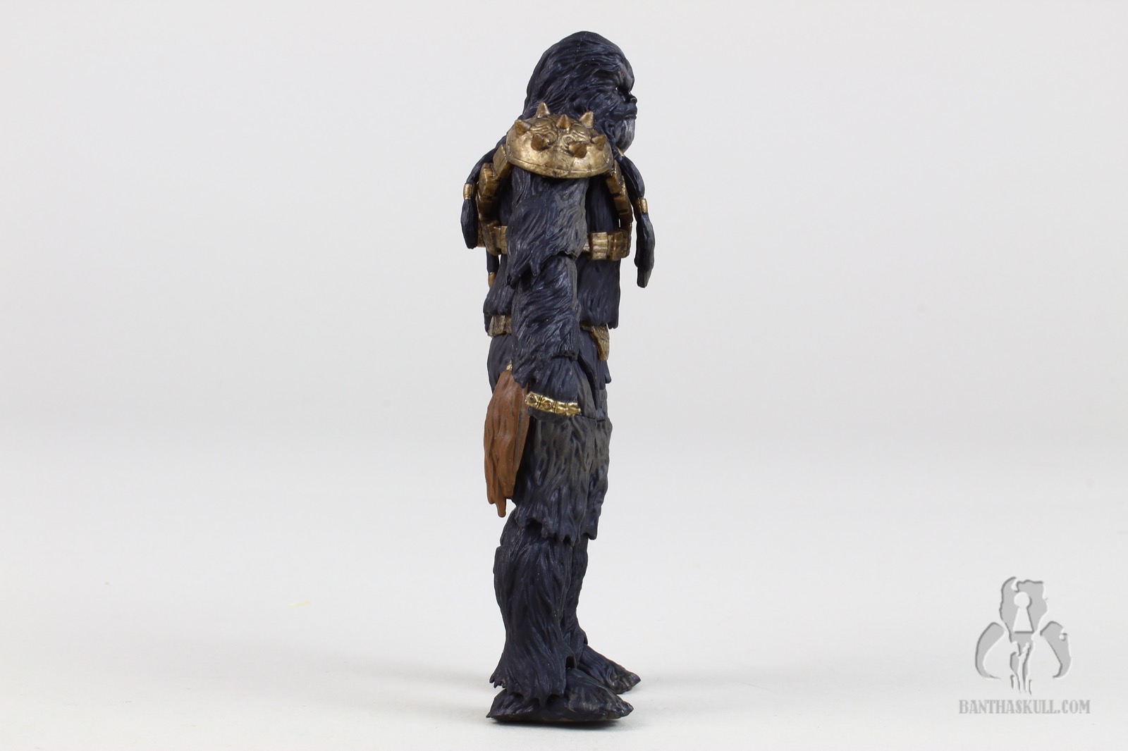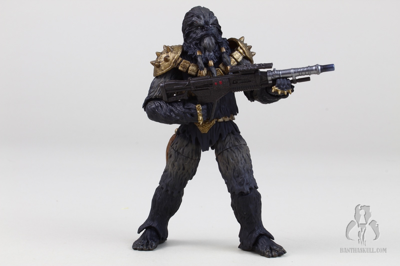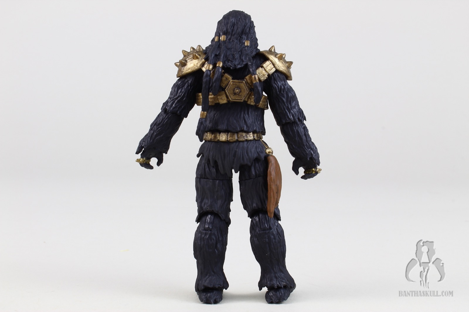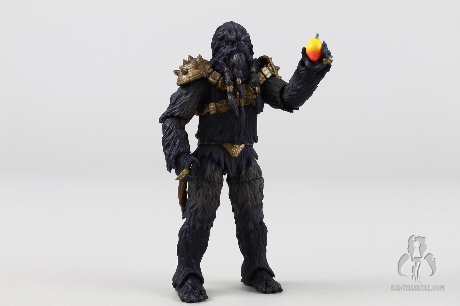 Krrsantan has nice paint ops, which various shades of fur all around. He’s got his large gold armored harness, which I assume is removable if you were adventurous enough to try (I am not). His hands come with spiked knuckles. The facial sculpt is really nice, and is complemented by the PhotoReal paint. The articulation points are all there, but the sculpting of the fur demanded a few compromises that limit the range of motion. The elbows and knees hit 90 degrees, but many of today’s figures bend further. The shoulders are hindered somewhat by the large spiked armor pieces. The fur and braids limit the ability to turn the head, or look up or down. The wrists are ball jointed and the ankles are rocker style, but again, none of them are as rangey as found in other figures. I understand the tradeoffs, and accept these limitations in favor of the great aesthetics of the figure.