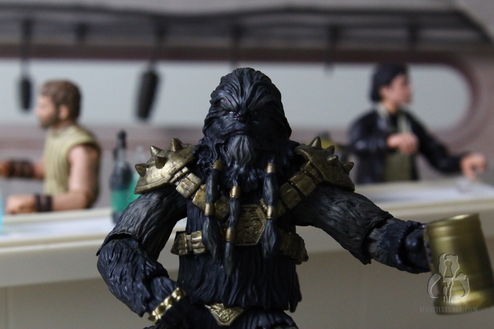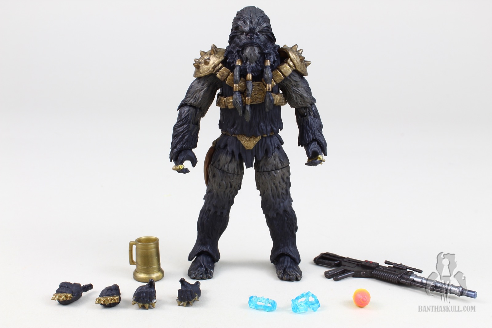 Aside from the neutral portrait, this version has fewer accessories than the SDCC release, and nothing specifically exclusive to this set. Krrsantan comes with a large shotgun, a pair of electrical effects which enhance the spiked knuckles on his hands, a beer stein, a meiloorun fruit, and 2 extra pair of hands (clenched fists and wide grips) in addition the standard mid-grip hands. The figure interacts pretty well with the accessories, although even the hands with the less wide grip don’t really hold the mug particularly well.