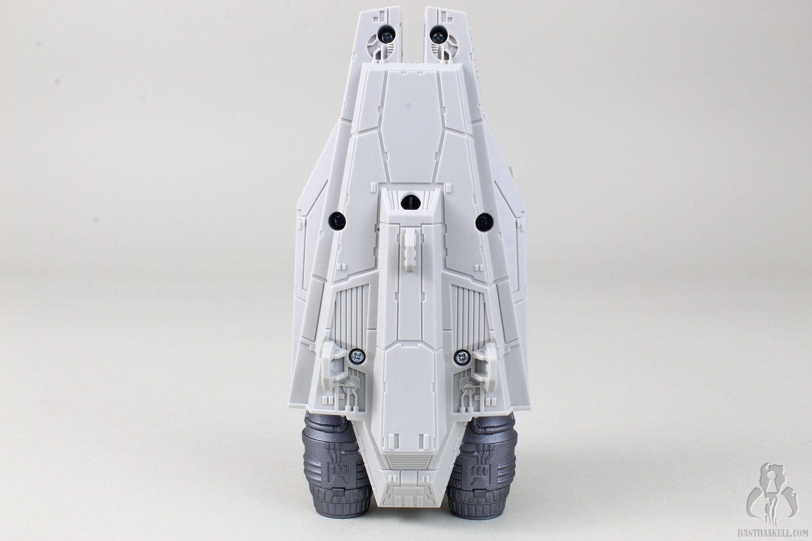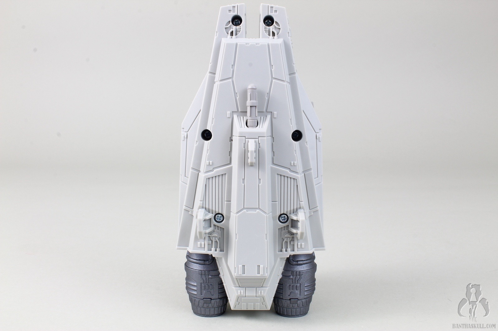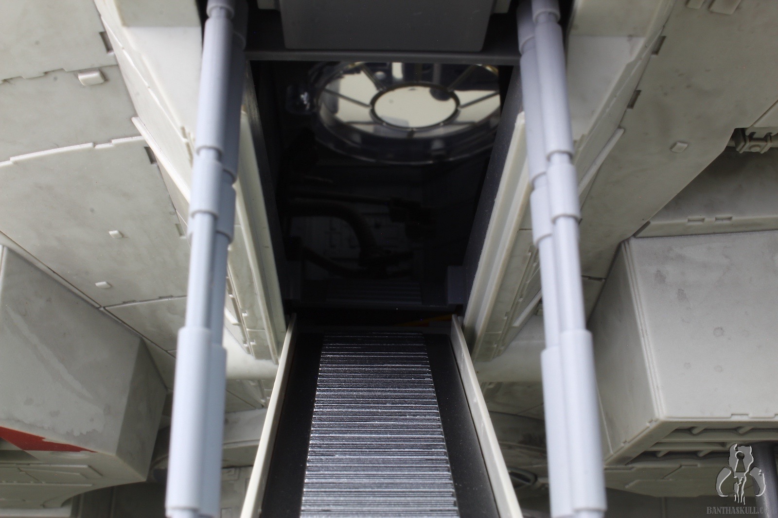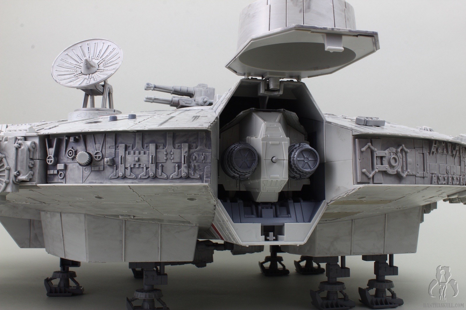 Not content with giving you just the radar dish options, Hasbro also updated the on board electronic sounds. On the previous releases, there was a main on/off switch. Now, there is no “off” option, but instead you use the same switch to toggle between OT and GE sounds. And here’s the very minor change to the sculpt I mentioned earlier. Previously, the switch was labeled with “ON” and “OFF” embossed into the plastic. These words have now been replaced with symbols. Anyway, this is excellent, as it allows fans of the OT to essentially ignore the alternative, and display/play with this ship as if it’s an upgraded OT BMF. The only thing you might want to avoid is applying the included stickers, which have a few images that feature Hondo Ohnaka.
