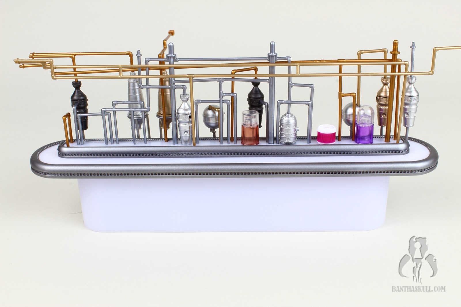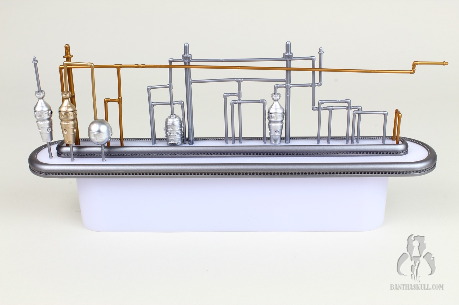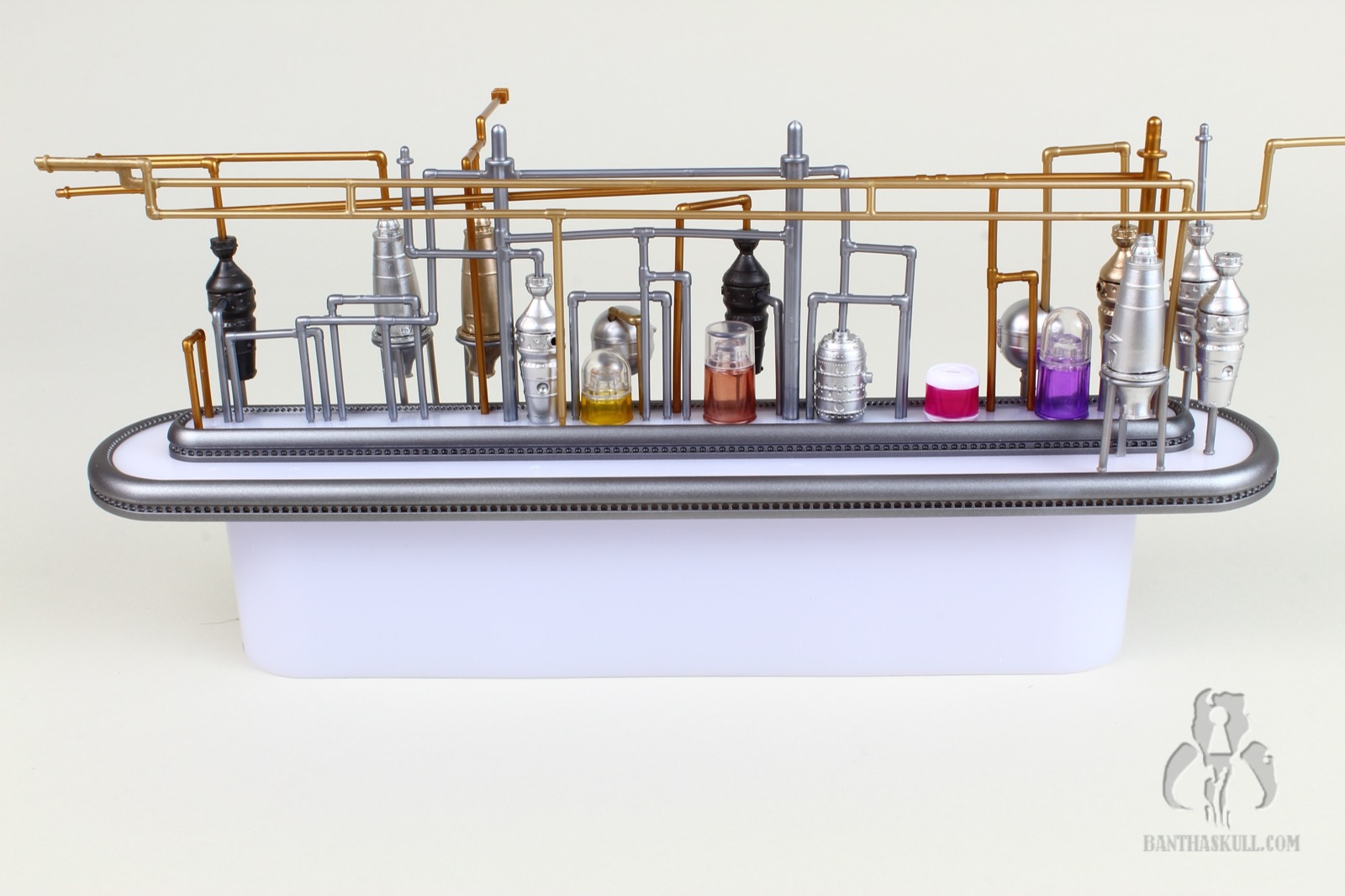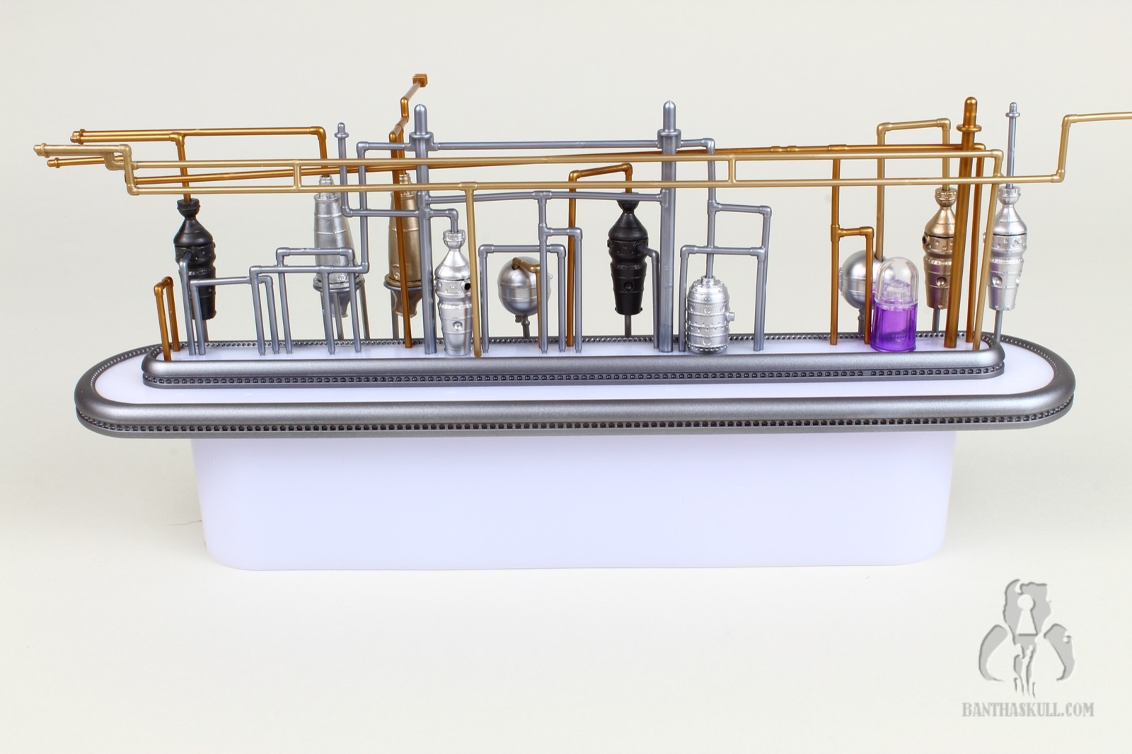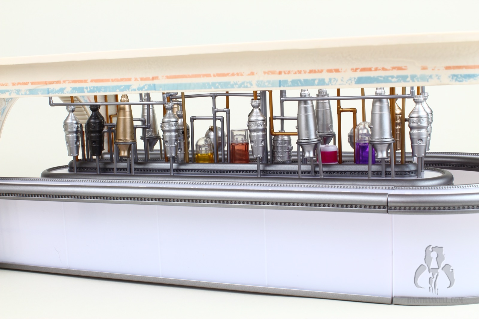 I’m almost completely gray, but assembling the distillery section of the Cantina cost me most of the remaining pigmentation in my hair. It’s an exercise that feels like you’re flirting with breakage the entire time. You have to push a series of millimeter-thick plastic pipes into peg holes, and it takes a decent amount of force to get them to stick. And here’s the best part: I got to put it together three times. Once initially, a second time when I tried to remove the roof which ended up tearing half the pipes out, and a third time when too many pieces became dislodged trying to move it from my “photo studio” to my display. I’m a pro at it now.