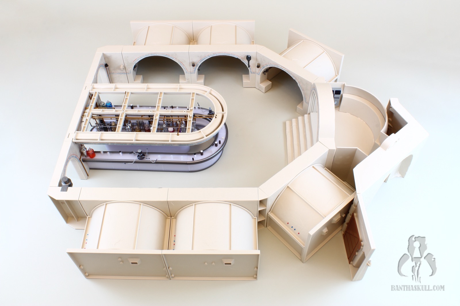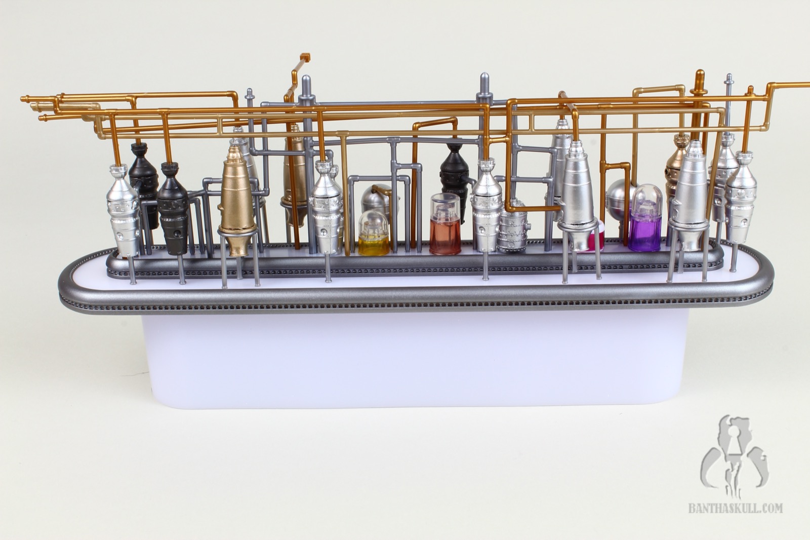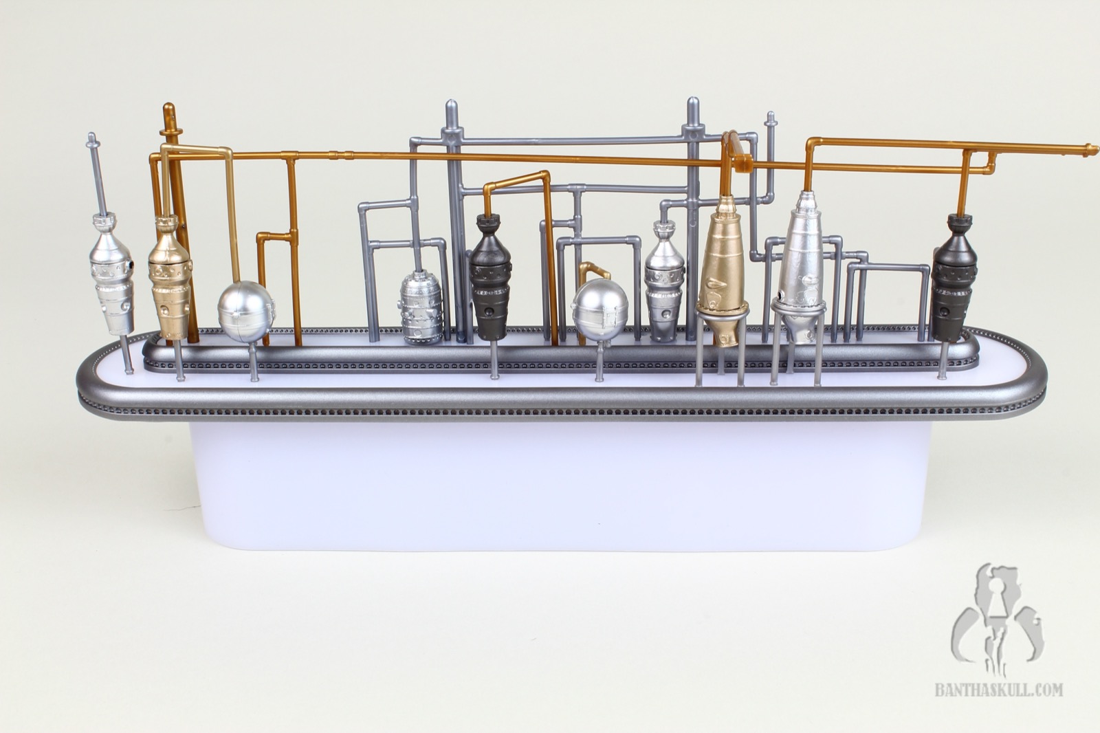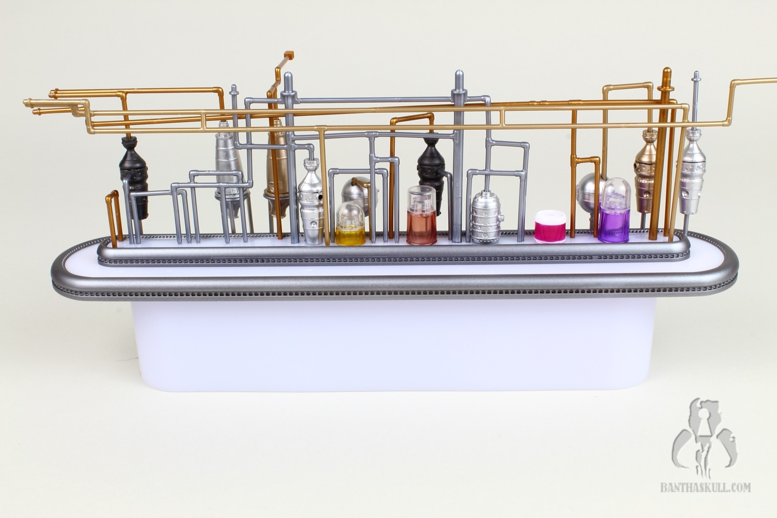 I’m almost completely gray, but assembling the distillery section of the Cantina cost me most of the remaining pigmentation in my hair. It’s an exercise that feels like you’re flirting with breakage the entire time. You have to push a series of millimeter-thick plastic pipes into peg holes, and it takes a decent amount of force to get them to stick. And here’s the best part: I got to put it together three times. Once initially, a second time when I tried to remove the roof which ended up tearing half the pipes out, and a third time when too many pieces became dislodged trying to move it from my “photo studio” to my display. I’m a pro at it now.