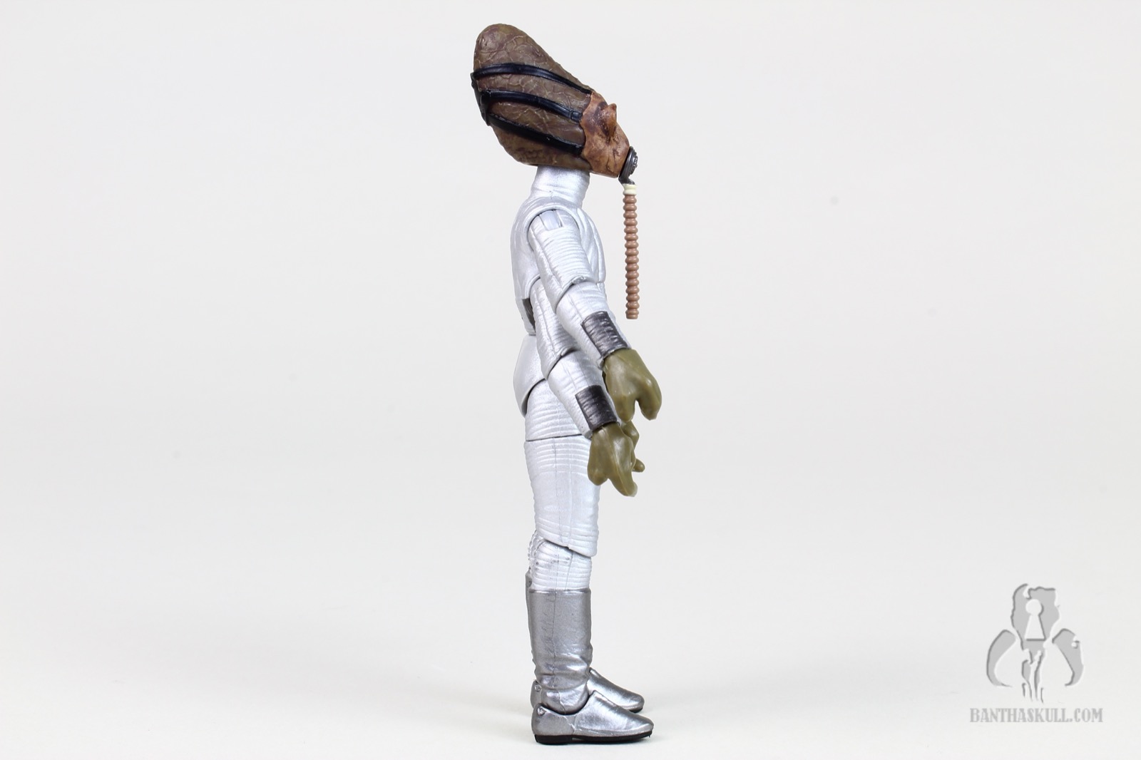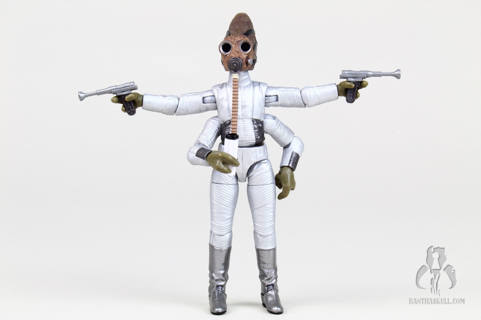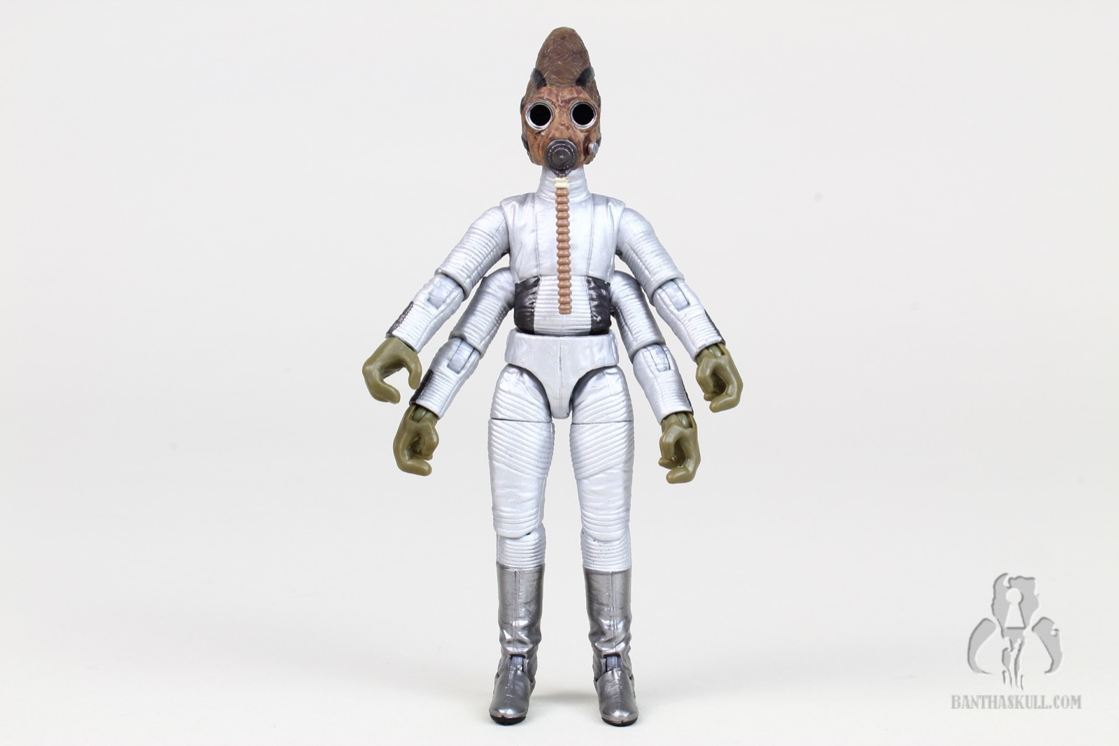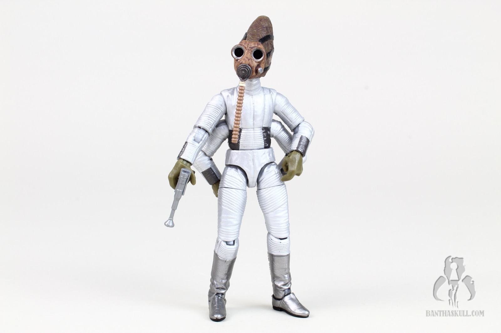Nabrun Leids just made it in before time expired, I believe within the last 20 minutes of the campaign. As with Wuher and Greedo, we already had this figure (along with a significant repaint). While it looked nice, it was definitely outdated, and his four arms being so limited in articulation made it a legit candidate for a resculpt. Hasbro did not disappoint, but I would have to admit, if pressed, that looking at the figures side by side, Mr. Leids is the least different from his predecessor - at least at first glance. I’m not suggesting for a second that the figure isn’t a quantum leap beyond the 1998 version, I’m just saying that if you hold them side by side, the original (well, at least the 2006 silver repaint) ain’t too bad looking. But in the end, you’d be crazy to pass this guy up. He’s got a whopping 22 points of articulation, which of course is necessary since he’s got 2 extra arms. He’s up there among some of the most articulated figures in the history of the line, although he’s a far cry from POTJ FX-7. It’s probably the most “fun” figure, because of his interesting physiology. He’s got one swappable left hand, which you can use for either of his left arms. He also comes with two blasters and a bar glass, which he can wield in any number of ways with his 4 arms. He also has a swappable hose for his gas mask. One hangs straight down, while the other has an “s” shape. You can unplug and swap them, so that either one can be used to “drink” from the included glass. Despite me being briefly and mildly underwhelmed, I got over it and he still gets a 10/10.