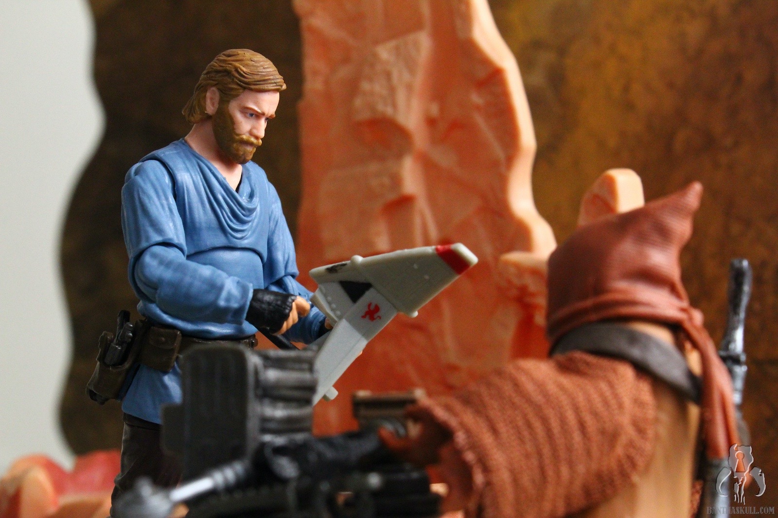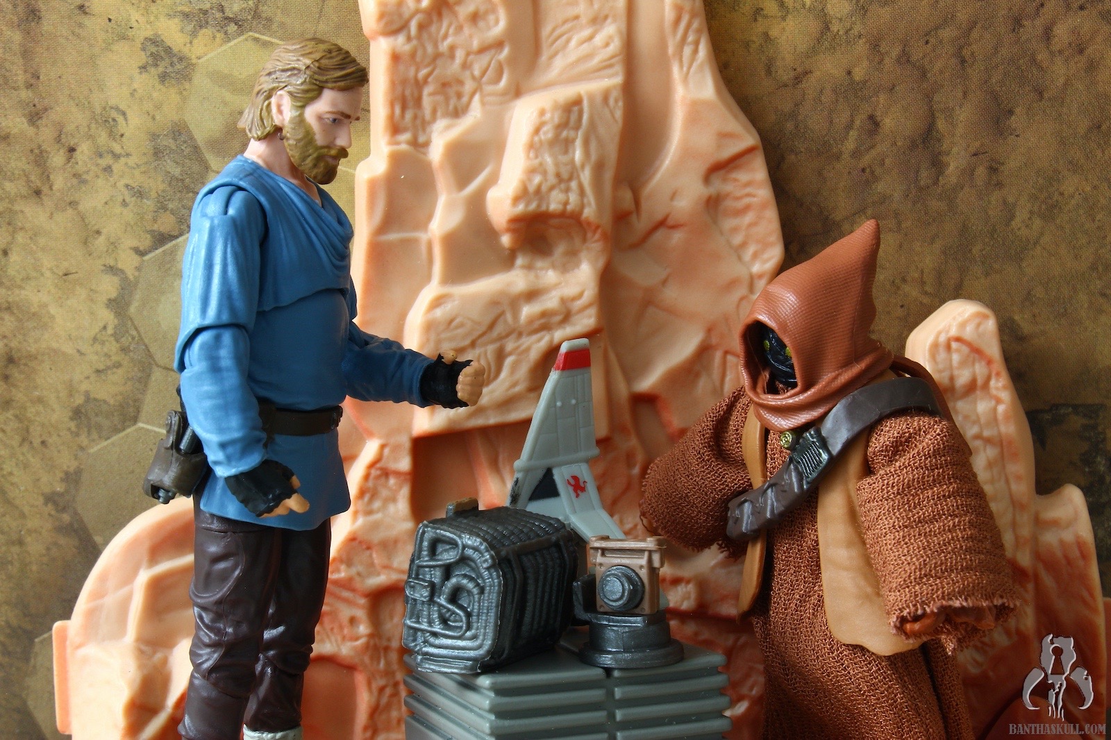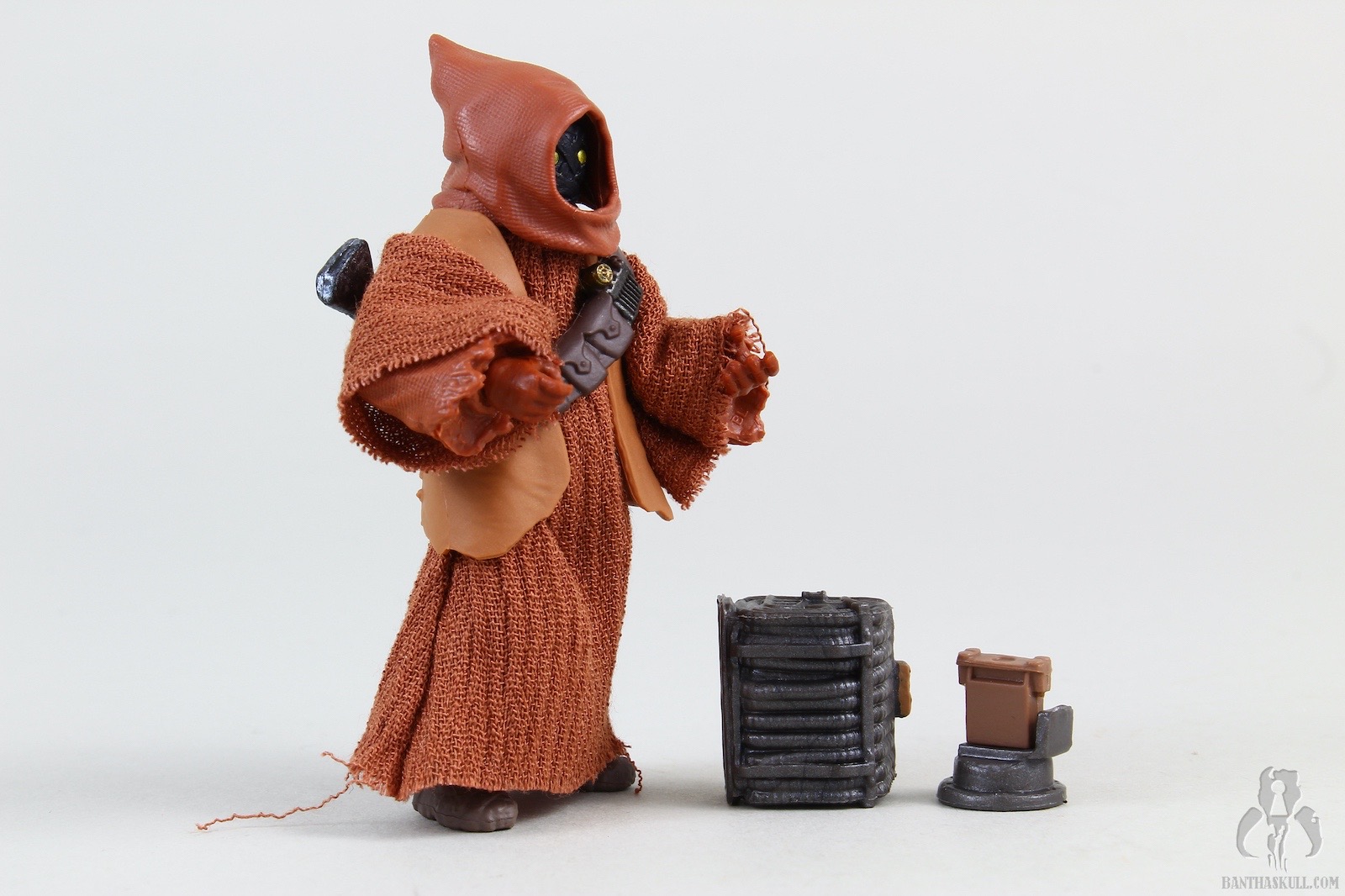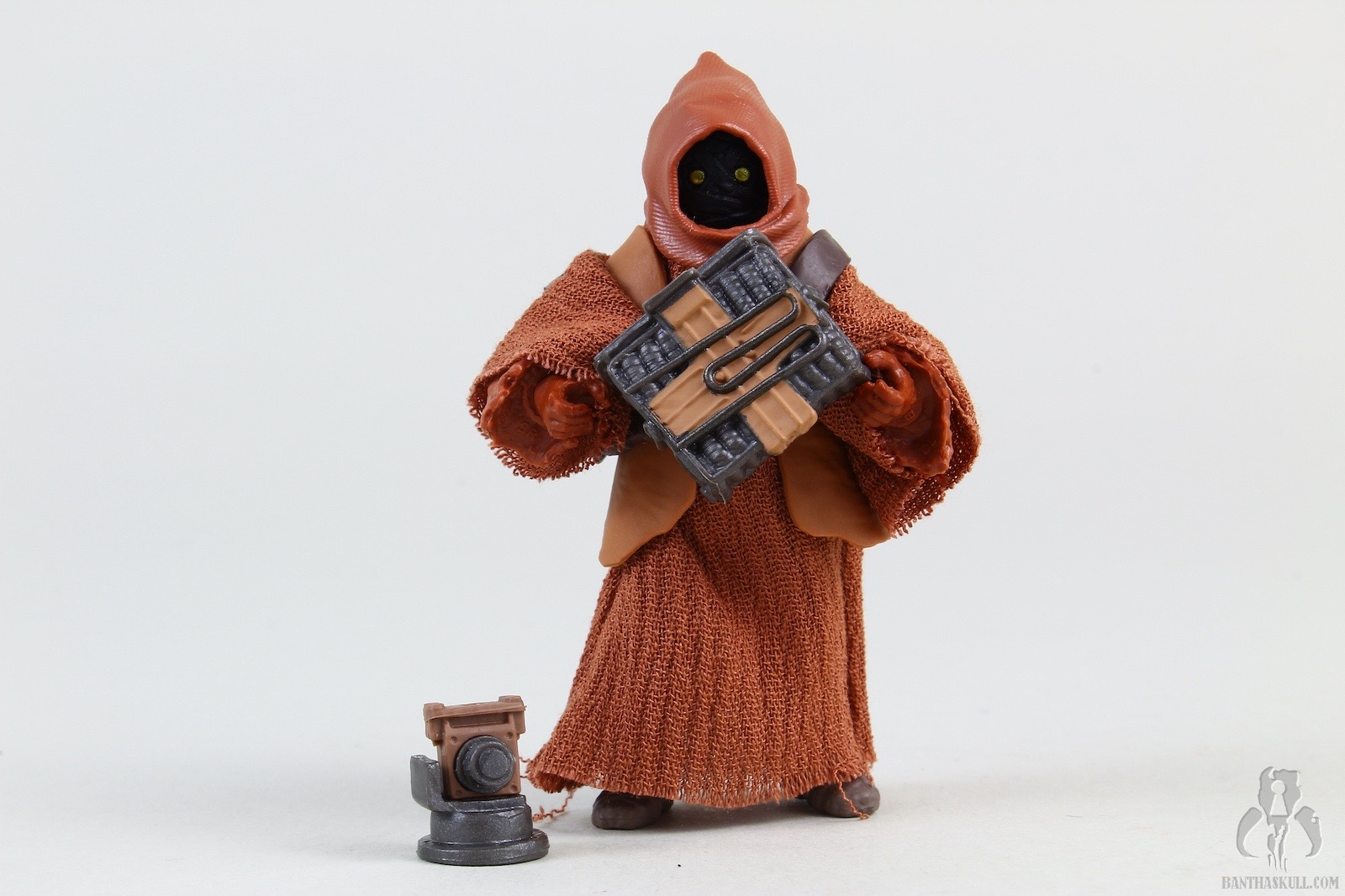 The second figure is a more dramatic change, and we get Teeka, the first named Jawa in the history of the line (I think?). Again, Hasbro started with VC203 Offworld Jawa (Arvala-7) as the base figure, and gave it a completely new paint job to represent the more familiar brown tones of the Tatooine clans. robe seems to be a slightly different material, and is also sewn differently. This time there is no opening in the front, so instated of a robe, it actually is more like a big hoodie. To complete the outfit, Teeka gets a new bandolier that differs from the Arvala-7 Jawa, and also a removable vest. Although the coloring is a little bit lighter than we might be used to, you could take off the vest, and basically have a generic Tatooine Jawa. Even keeping the vest, you could also have one of the “Purchase of the Droids” Jawa variants. Teeka comes with the typical ion blaster, but Hasbro also sculpted two new junk sculpts. I think I would have liked a new T-16 model, but these 2 pieces are nice little environmental pieces. I actually struggled to find the exact inspirations on screen, but eventually I saw the larger box in the very last scene of the series when Obi-Wan meets Luke. Young Luke has the box accessory, for some reason. I couldn’t find the cylindrical item, but in any case, it makes a nice figure with terrific accessories.