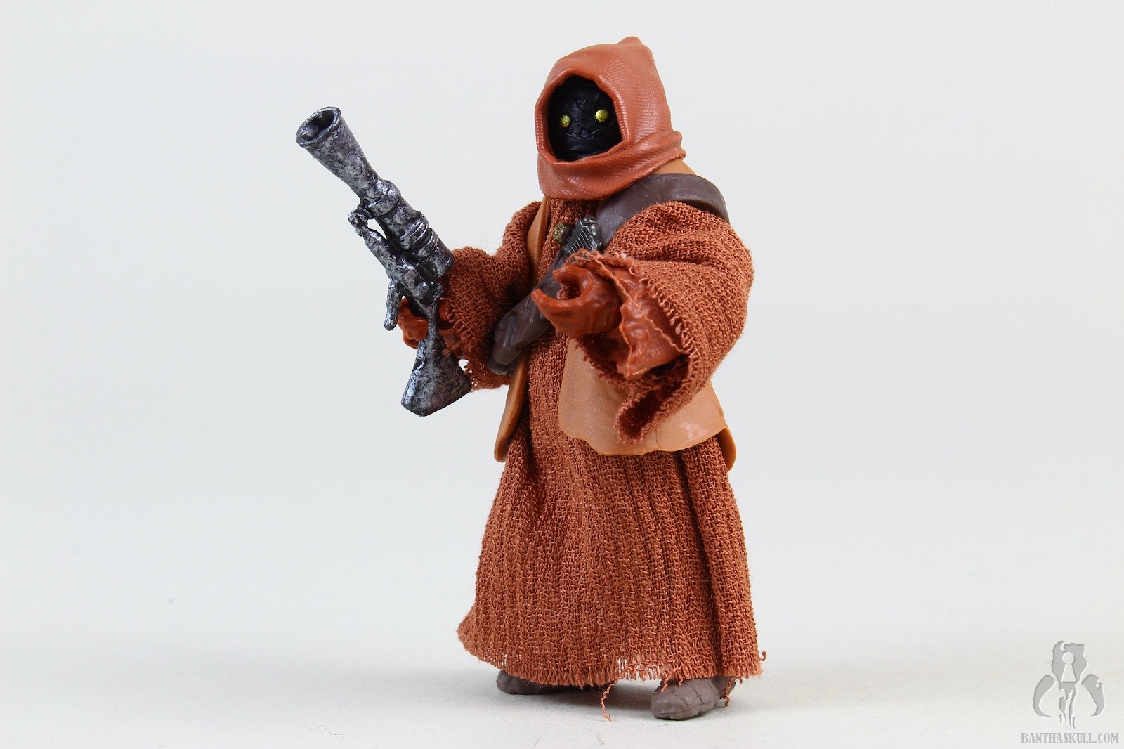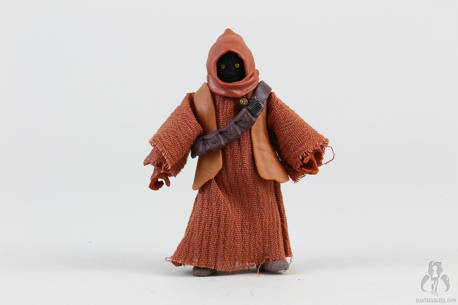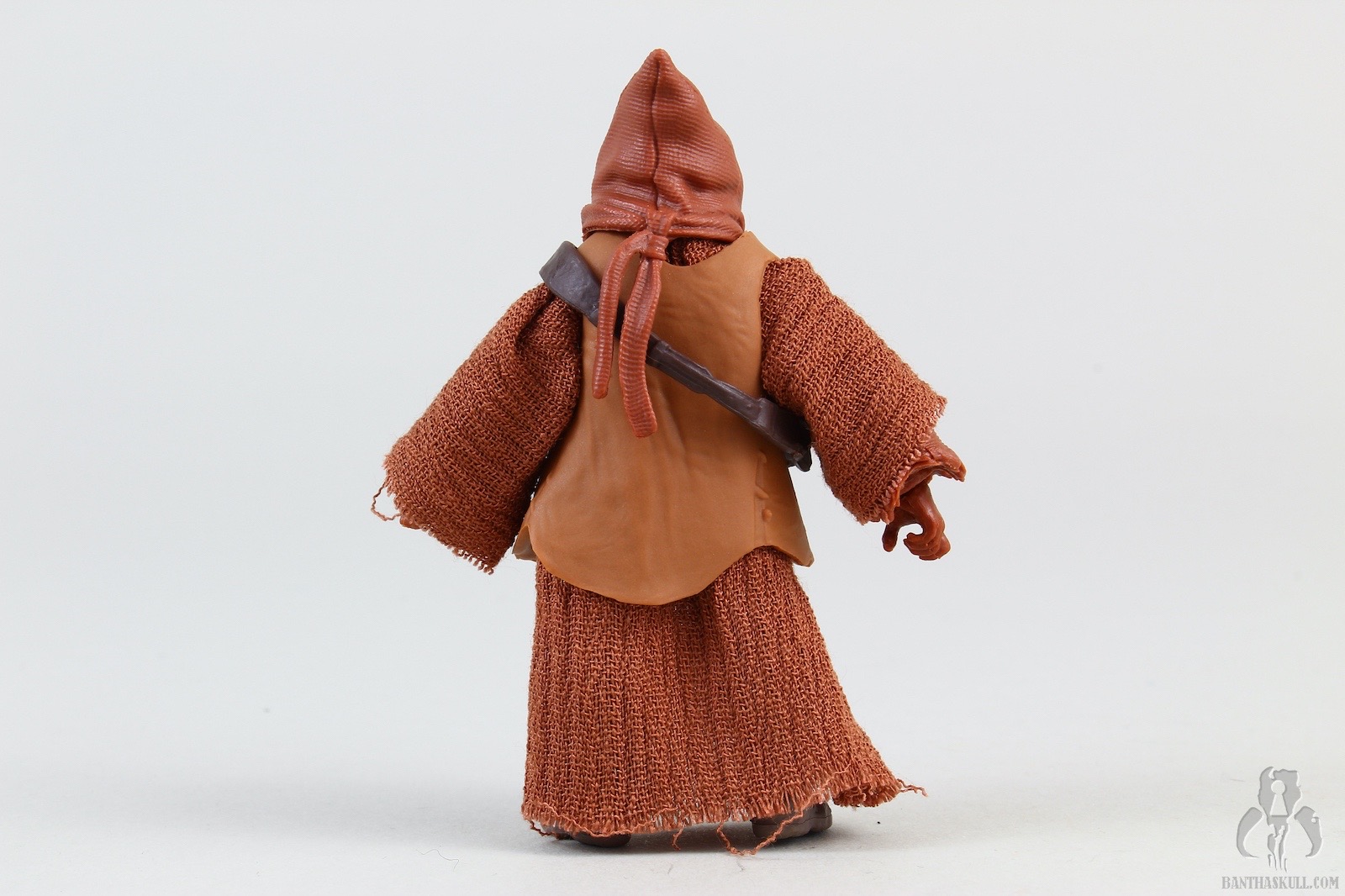 The second figure is a more dramatic change, and we get Teeka, the first named Jawa in the history of the line (I think?). Again, Hasbro started with VC203 Offworld Jawa (Arvala-7) as the base figure, and gave it a completely new paint job to represent the more familiar brown tones of the Tatooine clans. robe seems to be a slightly different material, and is also sewn differently. This time there is no opening in the front, so instated of a robe, it actually is more like a big hoodie. To complete the outfit, Teeka gets a new bandolier that differs from the Arvala-7 Jawa, and also a removable vest. Although the coloring is a little bit lighter than we might be used to, you could take off the vest, and basically have a generic Tatooine Jawa. Even keeping the vest, you could also have one of the “Purchase of the Droids” Jawa variants. Teeka comes with the typical ion blaster, but Hasbro also sculpted two new junk sculpts. I think I would have liked a new T-16 model, but these 2 pieces are nice little environmental pieces. I actually struggled to find the exact inspirations on screen, but eventually I saw the larger box in the very last scene of the series when Obi-Wan meets Luke. Young Luke has the box accessory, for some reason. I couldn’t find the cylindrical item, but in any case, it makes a nice figure with terrific accessories.