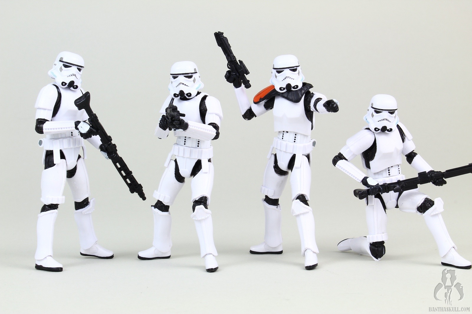 So what do you get for $42? Four VC140 stormtroopers, 4 E-12 blasters, 2 DLT-19 heavy rifles, and an orange pauldron to make one of the figures into an officer. The figure is identical to VC140 in sculpt, however, collectors had varying degrees of success when it came to the paint applications. Some images on social media showed samples with paint apps that badly missed the mark. Some samples were much better, but it was definitely hit or miss. Looking at my samples alone, they don’t look bad, although I can see they’re not perfect. But there is definitely a difference when comparing these side by side with a VC140 example. I’m not the biggest stickler for such things, so the dip in quality paint doesn’t bother me personally, but hardcore collectors definitely weren’t thrilled in general. It remains to be seen if yellowing becomes an issue over time. It may be difficult to see in one of the comparison images in the gallery above, but some of my VC140’s have slight yellowing already, while others are still bright white.