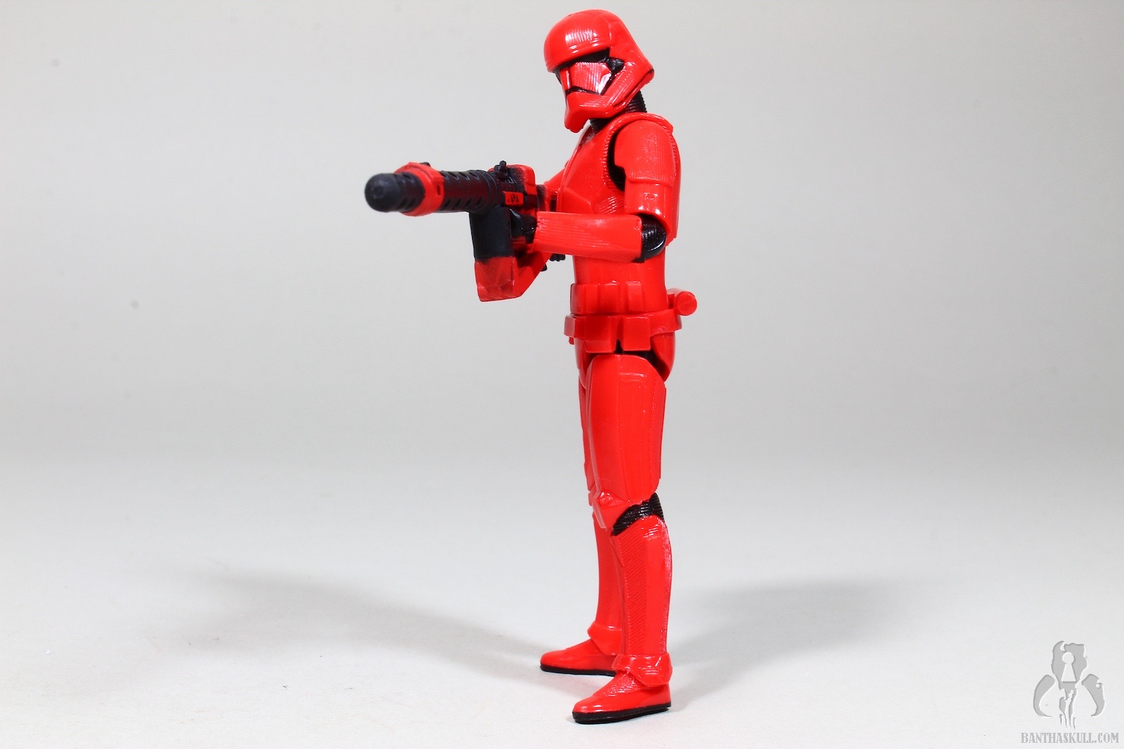 Where this does have a slight advantage over the OT stormtrooper is that it comes with 2 weapons. Sadly, the hands don’t work as well with the included accessories as one would hope. The smaller blaster, besides not being able to be held perfectly by the figure, also fails to fit snugly into the hip slot. It fits, but doesn’t stay well. It was good enough for the picture in the gallery here, but it fell out all too easily. The larger hand cannon isn’t conducive to being aimed in a firing position in any way that I could figure out. You might tease the cannon to kind of rest in the figures arms as a cheat, but he by no means is able to grip it properly. Interestingly, I had the same problem when I reviewed the Sixer version of the character. It came with the same giant cannon, which did not interact well with that scale either.