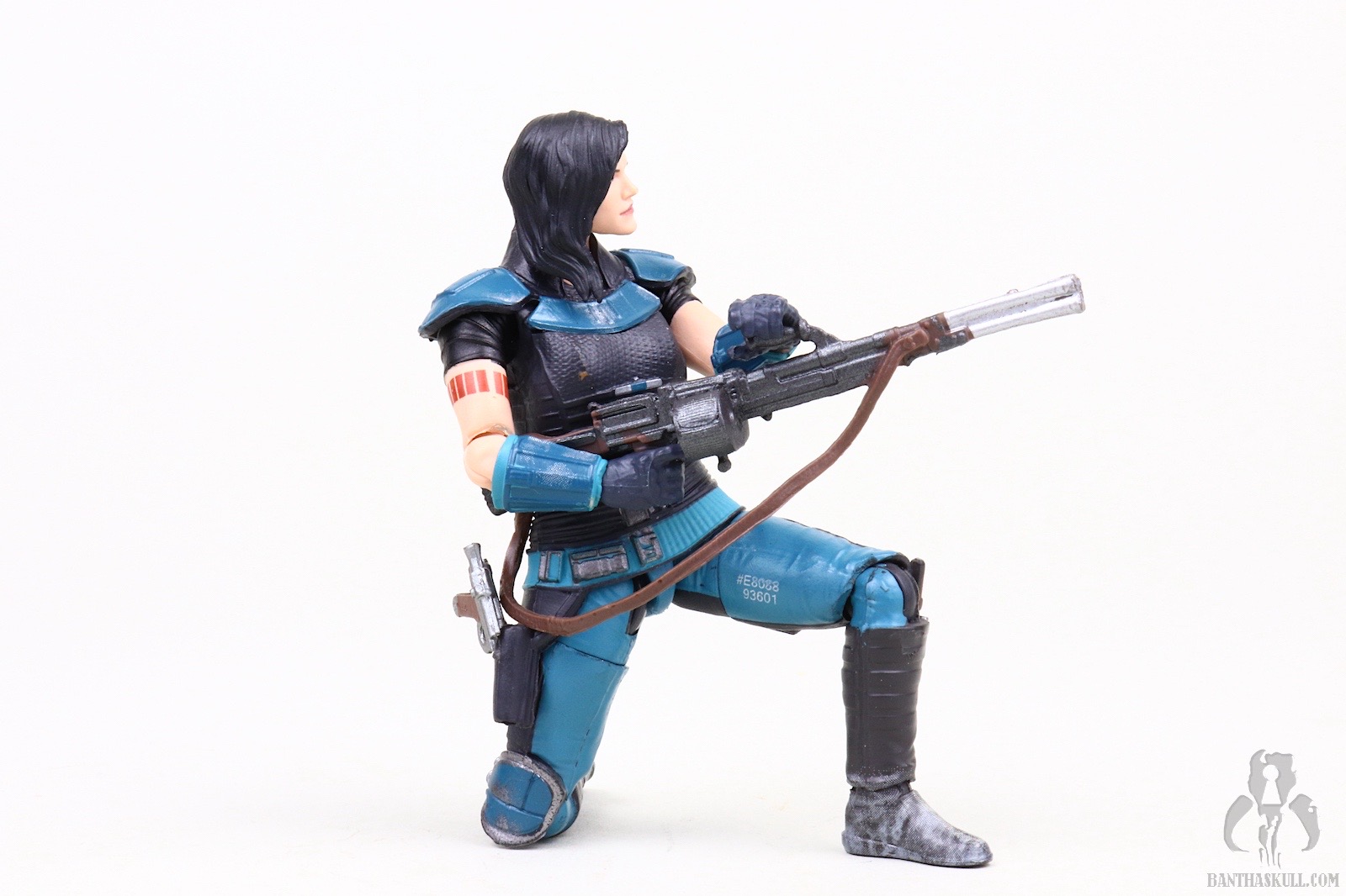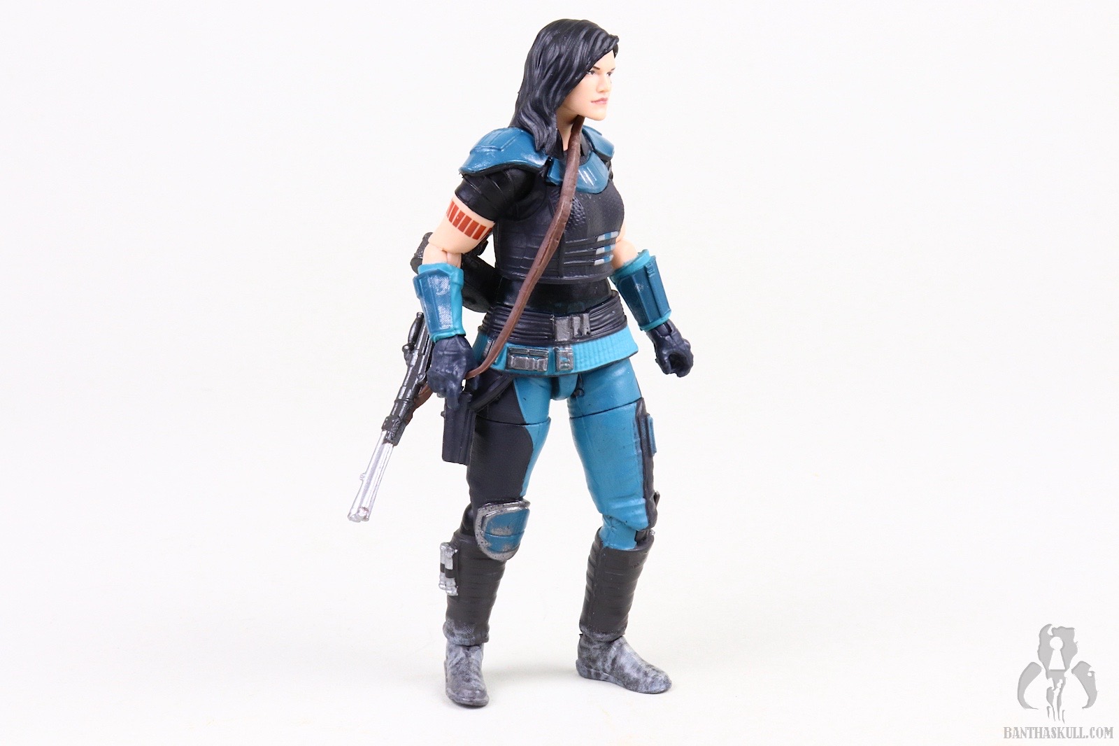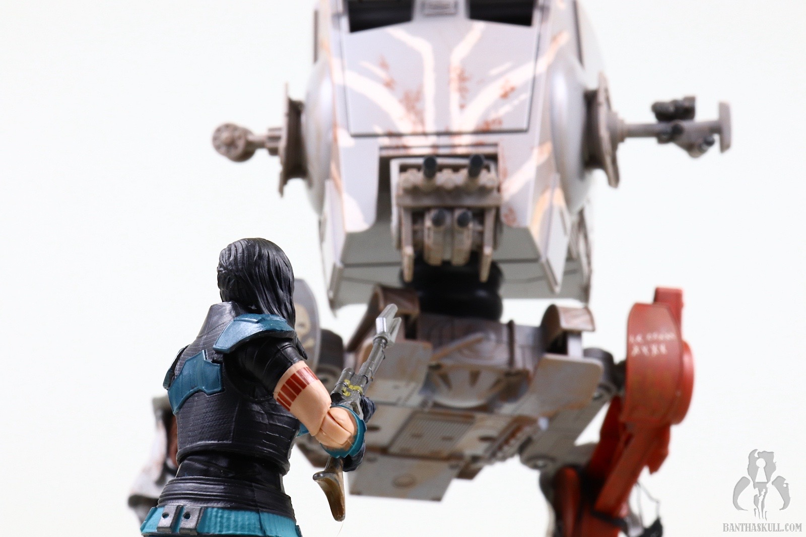 So that is a frustration, but Cara Dune can still achieve all those poses, which puts her in the upper echelon of Star Wars action figures. The fact that the upper body can achieve the exact on-screen pose with the heavy blaster is a delight. This is particularly facilitated by the ball jointed wrists. Whereas the awkward lower body poses serve to “break the fantasy” a bit, the perfectly natural looking way the figure interacts with the heavy blaster rifle earns back some realism points. The included sidearm pistol is tiny, as is the actual prop. It doesn’t store very securely in the aforementioned holster and has high potential for becoming lost if you’re not careful. I had the pistol fall out four times during the photography process which resulted in extended “hands and knees” flashlight searches on the floor. [Editor’s note: You’ve been Hrcheked!]. This is another reason for the one point deduction. The same articulation which allows the figure to interact well with the heavy blaster also facilitates posing her with Din Djarin’s sniper rifle so you can recreate Cara Dune taking on the AT-ST Raider. This is another nice bonus.