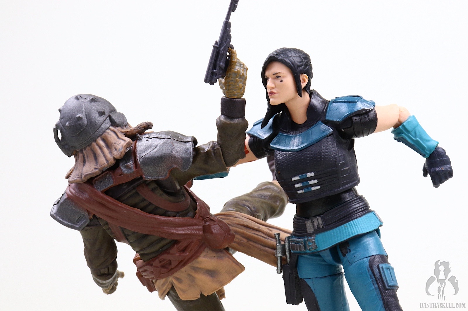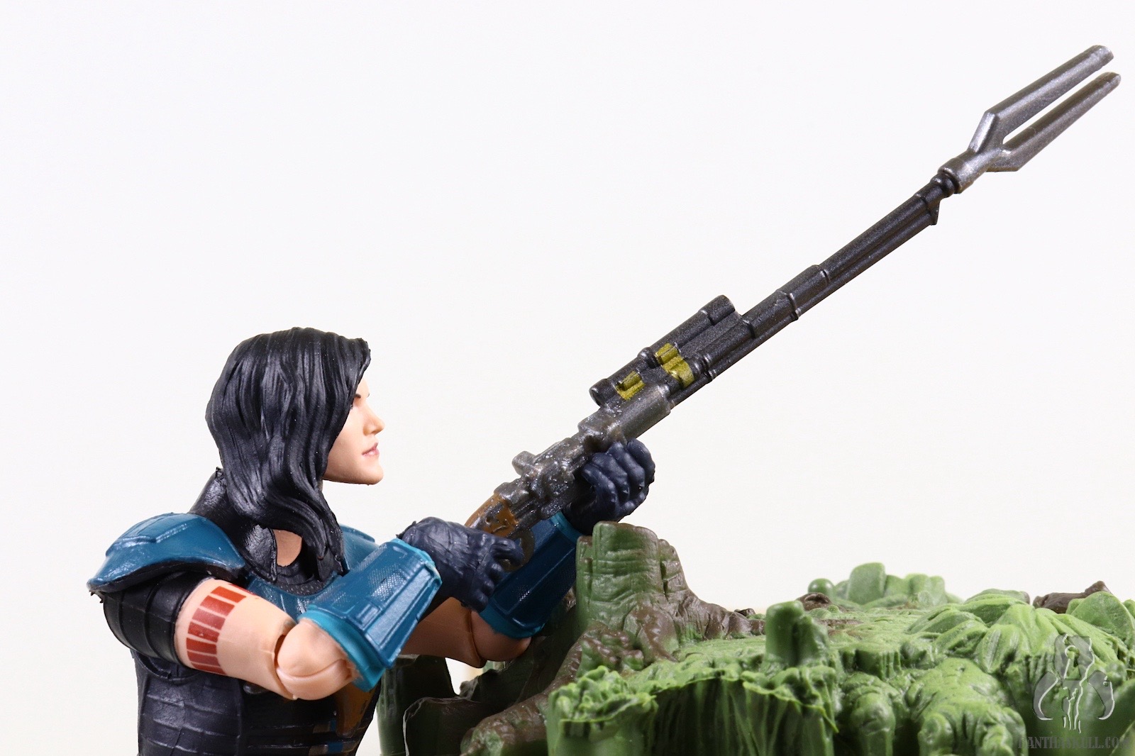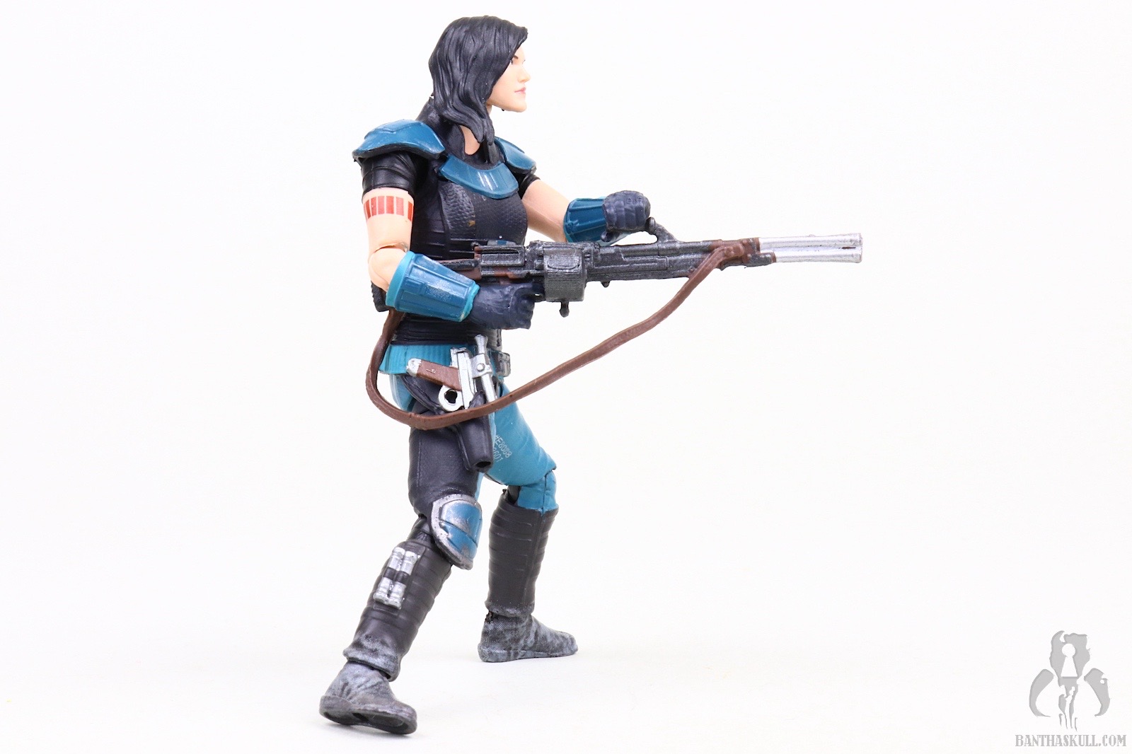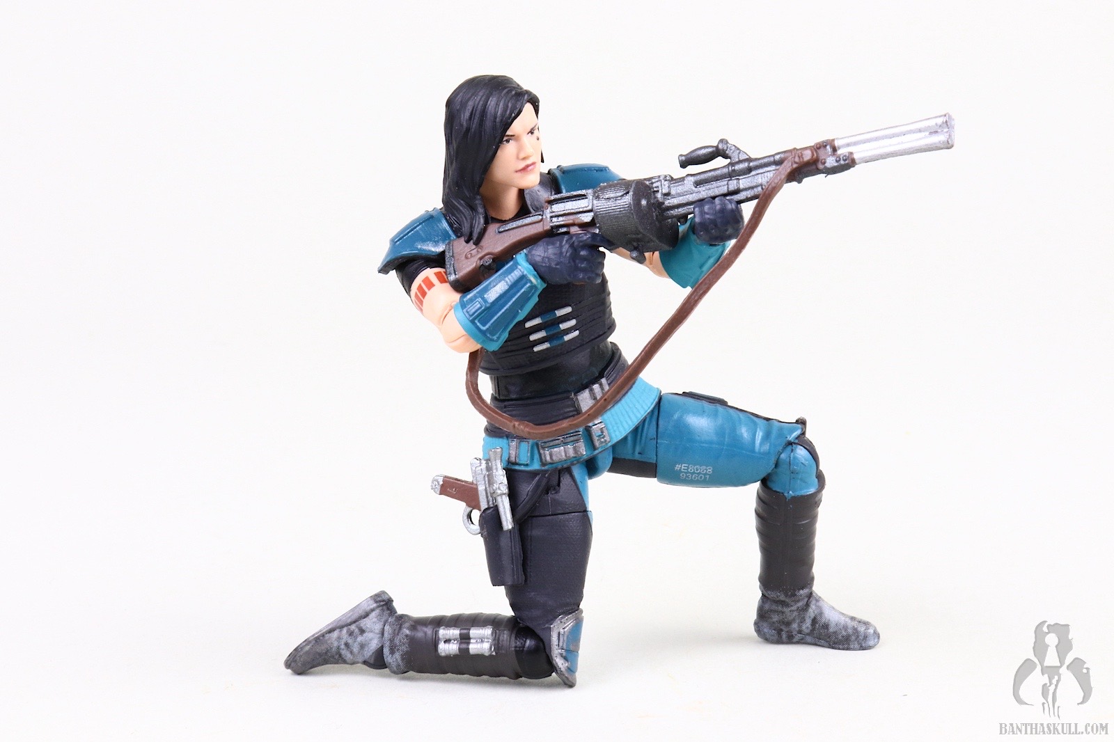 So that is a frustration, but Cara Dune can still achieve all those poses, which puts her in the upper echelon of Star Wars action figures. The fact that the upper body can achieve the exact on-screen pose with the heavy blaster is a delight. This is particularly facilitated by the ball jointed wrists. Whereas the awkward lower body poses serve to “break the fantasy” a bit, the perfectly natural looking way the figure interacts with the heavy blaster rifle earns back some realism points. The included sidearm pistol is tiny, as is the actual prop. It doesn’t store very securely in the aforementioned holster and has high potential for becoming lost if you’re not careful. I had the pistol fall out four times during the photography process which resulted in extended “hands and knees” flashlight searches on the floor. [Editor’s note: You’ve been Hrcheked!]. This is another reason for the one point deduction. The same articulation which allows the figure to interact well with the heavy blaster also facilitates posing her with Din Djarin’s sniper rifle so you can recreate Cara Dune taking on the AT-ST Raider. This is another nice bonus.