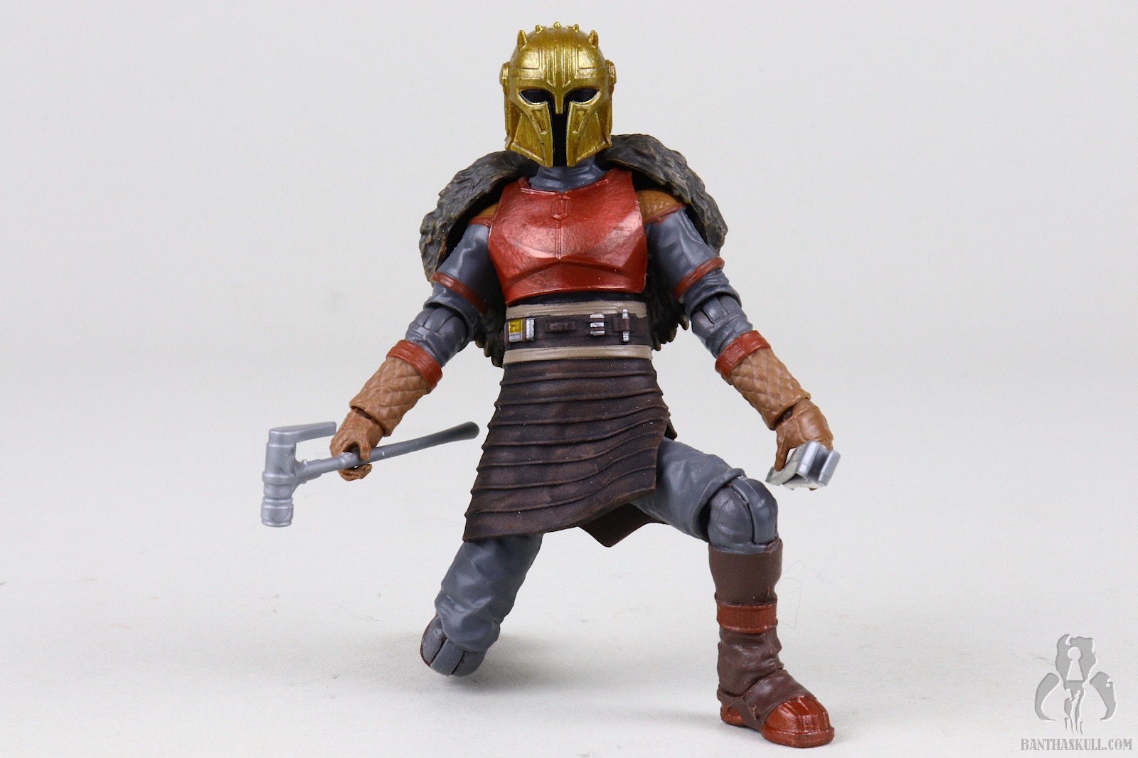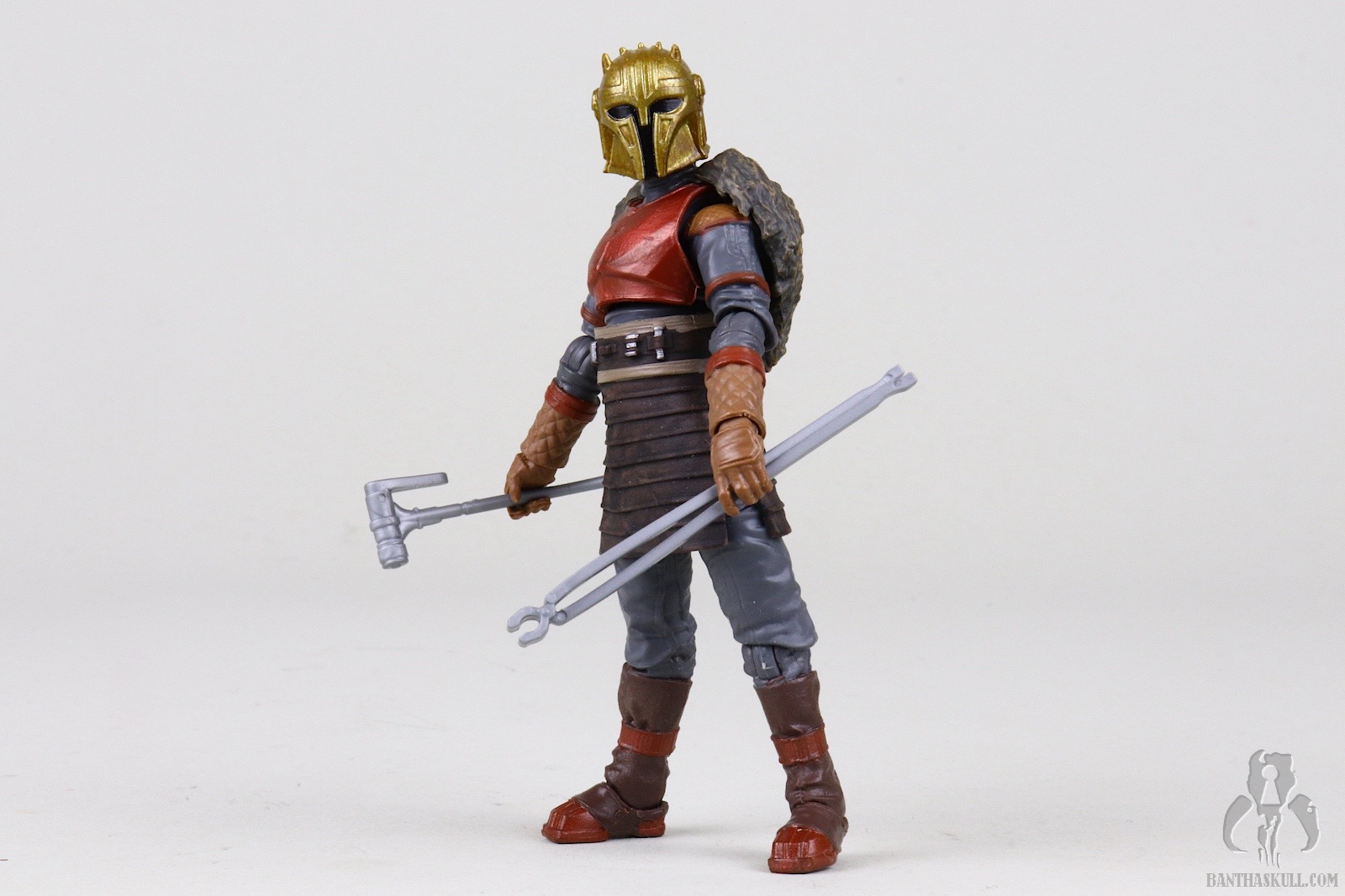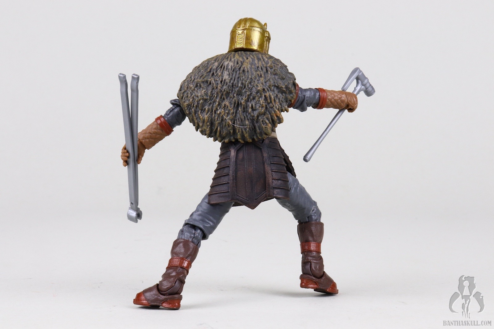 Once you get past those issues, you’re left with a fairly outstanding figure. It looks amazing, though the angle of the helmet’s jawline might be a little too shallow. The chin of the on-screen helmet seems pointier. The plastic molded blacksmith’s apron is highly malleable and barely impacts the lower leg articulation, which is generous. The ball-jointed hips are easy to engage, which isn’t always the case at this scale. The legs terminate in our beloved rocker ankles. The only issue I have with the ankle articulation is that they don’t flex upward as much as I’d like. The neck has fantastic range of motion up and down which greatly adds expression to how the figure is posed.