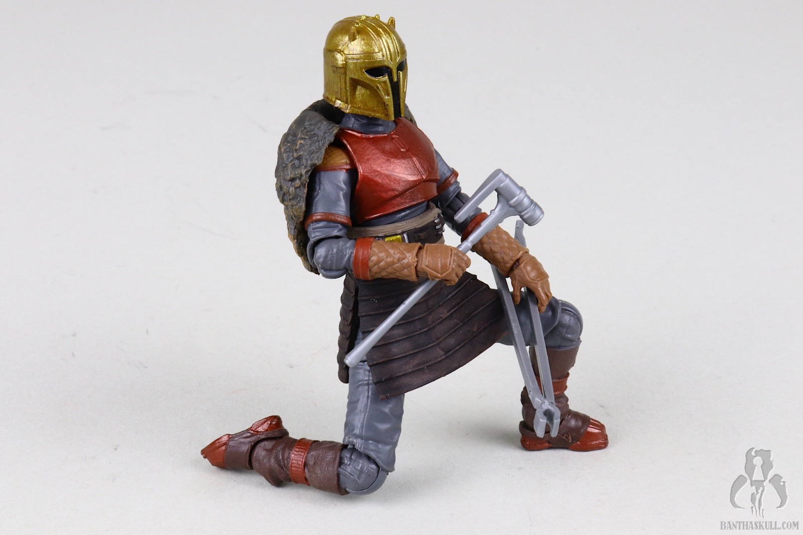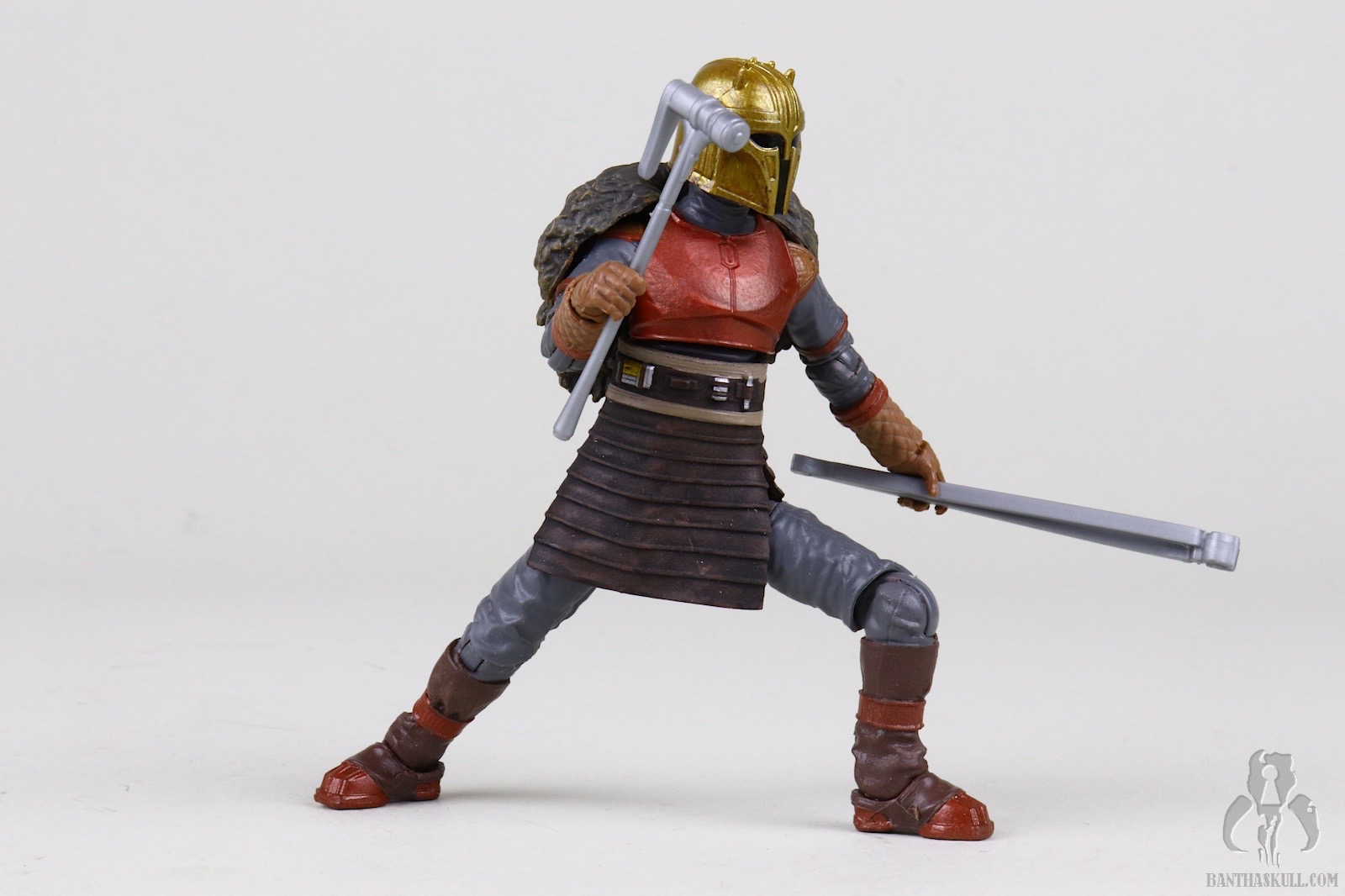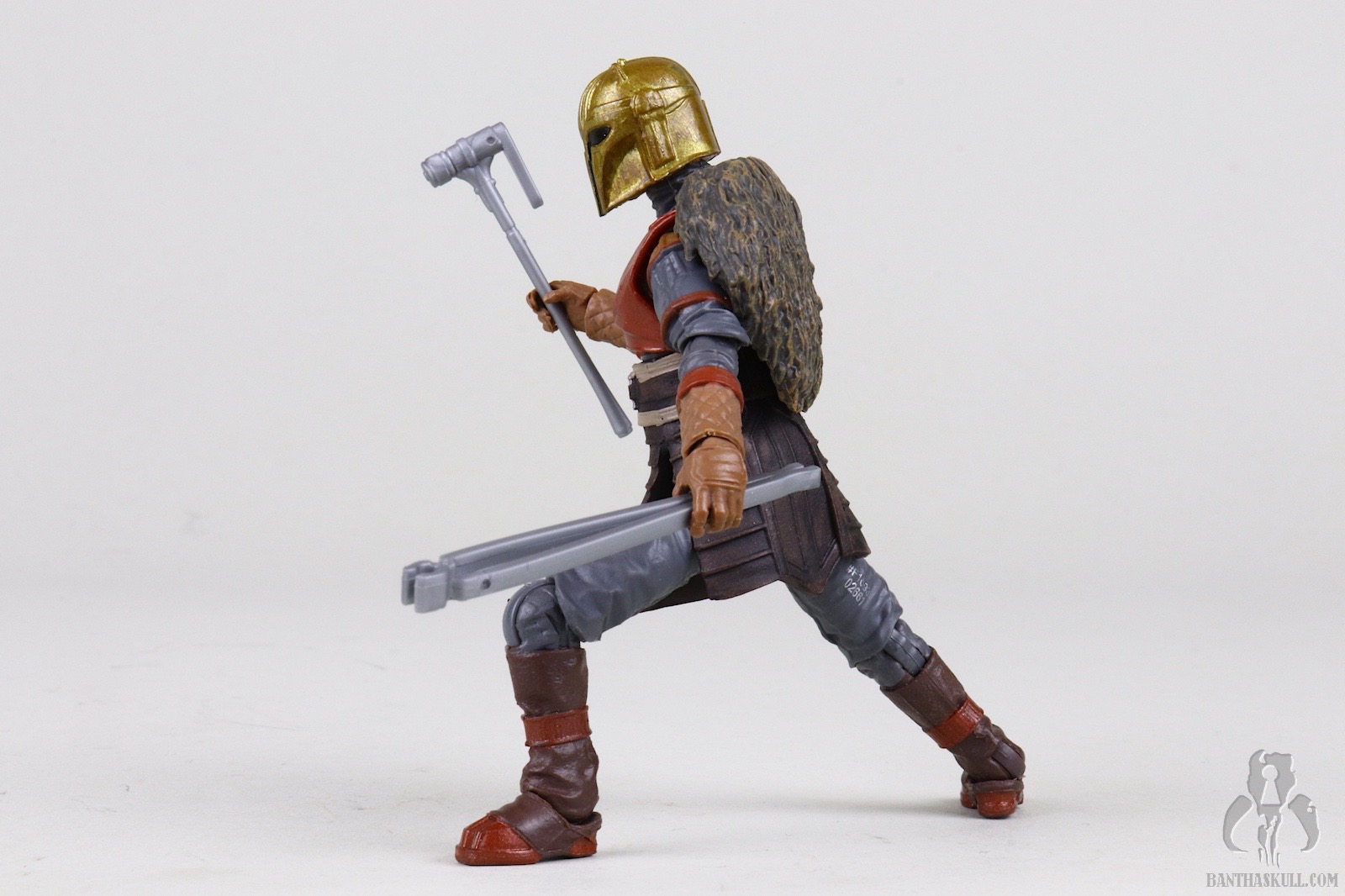 Once you get past those issues, you’re left with a fairly outstanding figure. It looks amazing, though the angle of the helmet’s jawline might be a little too shallow. The chin of the on-screen helmet seems pointier. The plastic molded blacksmith’s apron is highly malleable and barely impacts the lower leg articulation, which is generous. The ball-jointed hips are easy to engage, which isn’t always the case at this scale. The legs terminate in our beloved rocker ankles. The only issue I have with the ankle articulation is that they don’t flex upward as much as I’d like. The neck has fantastic range of motion up and down which greatly adds expression to how the figure is posed.