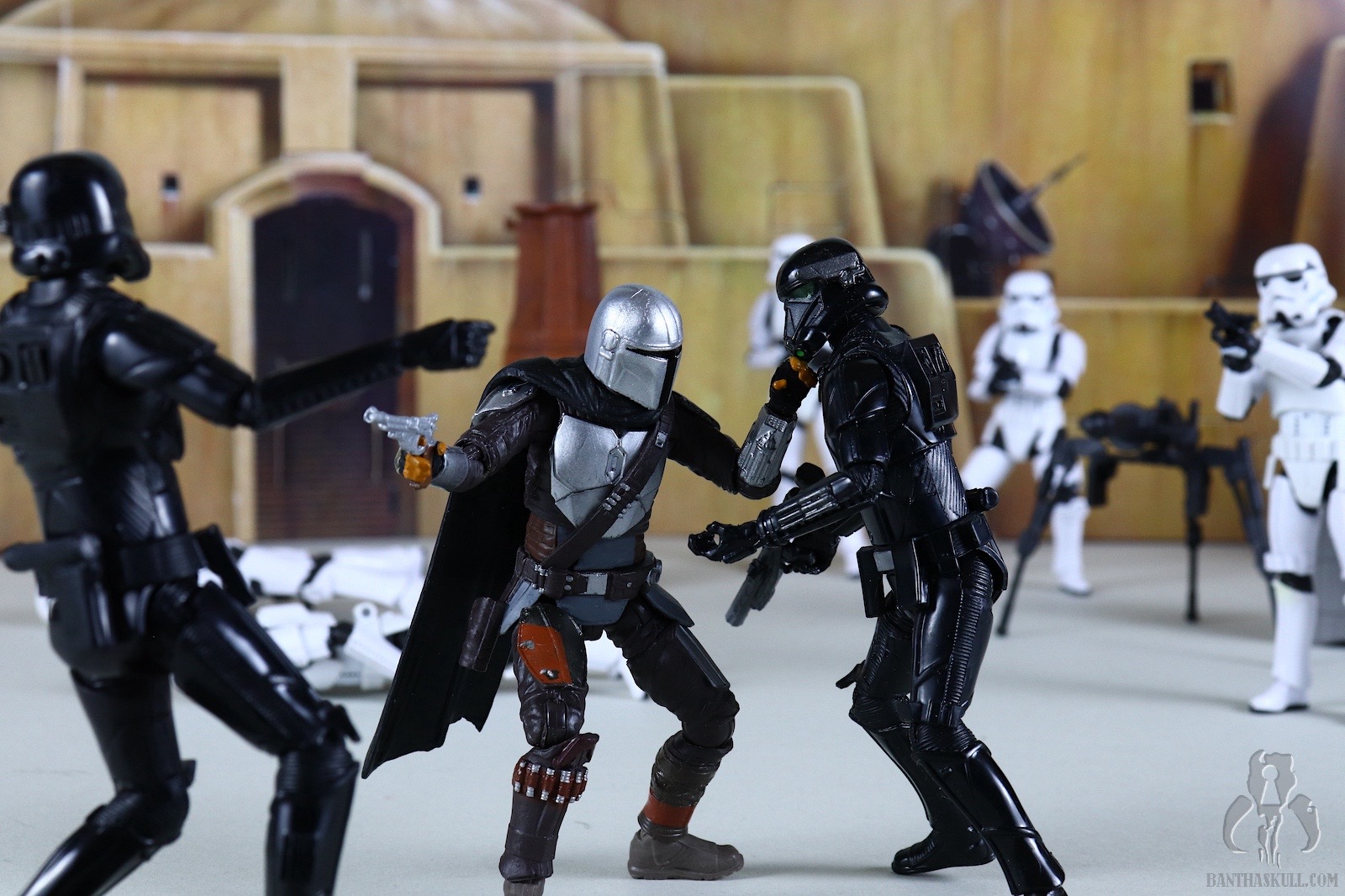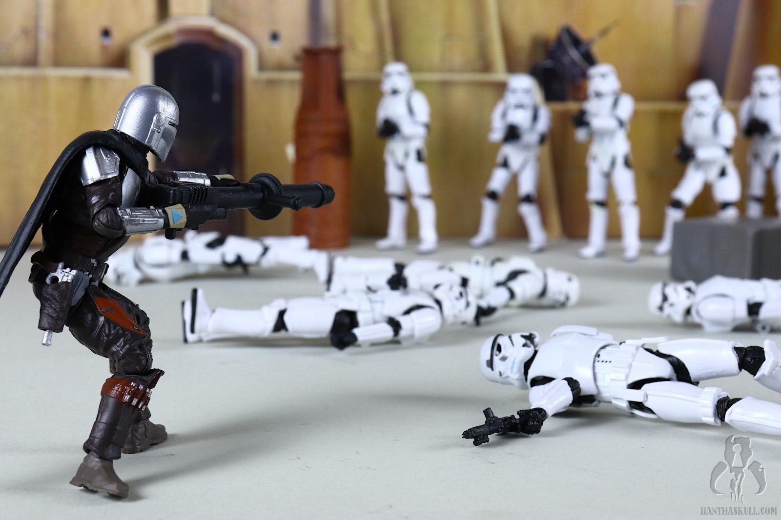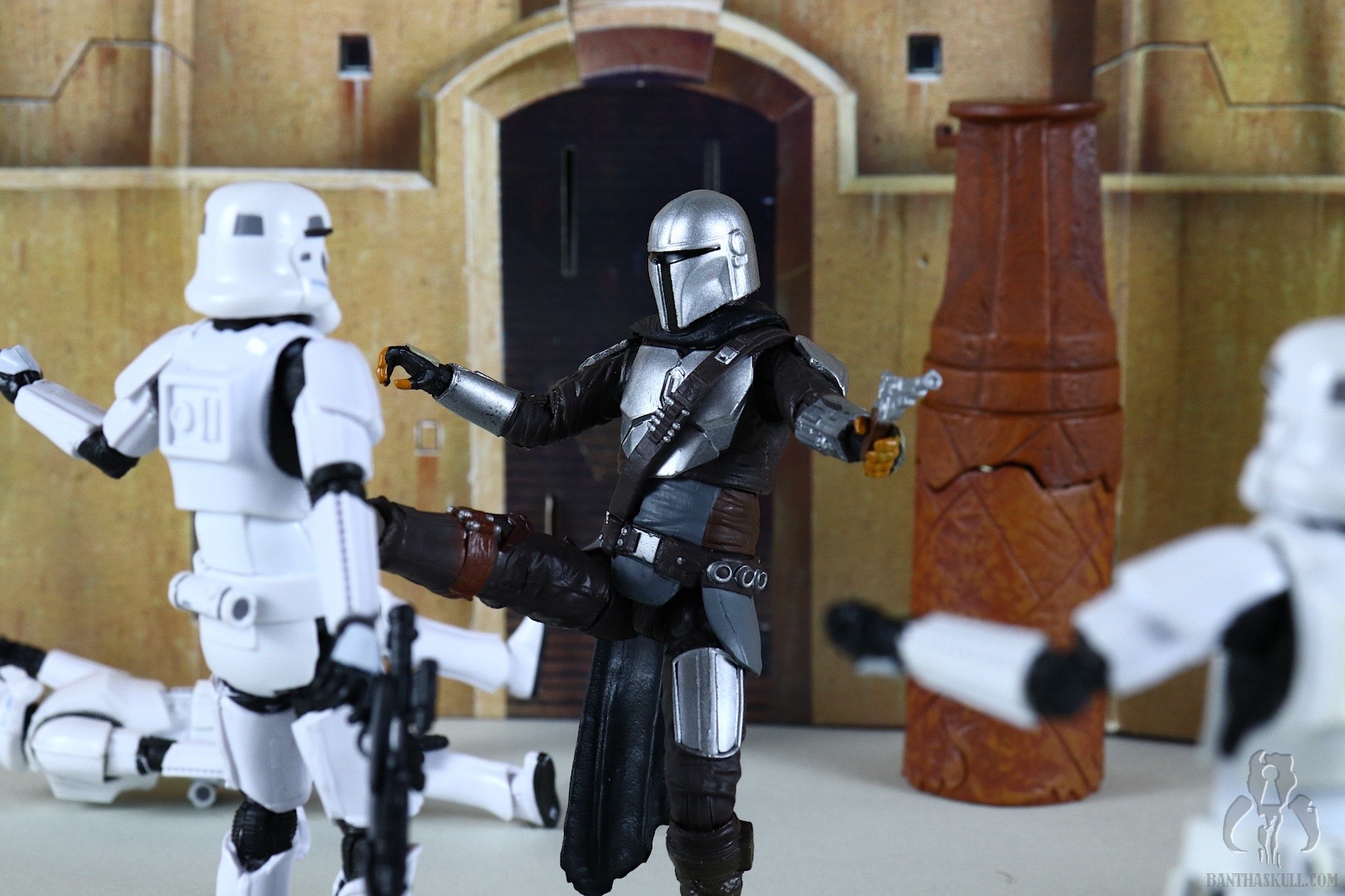 We need to discuss a couple of notes about this figure. First, the right shoulder sports the Mudhorn signet. The Armorer doesn’t tack it on until two thirds of the way through the season one finale. This means that for the majority of season one, Mando is rocking a slick shoulder. A Beskar Mando without the Mudhorn emblem is a minor tooling variation that fans would actually welcome. In the good old days, it would have been released before we even realized we wanted it. It would have been stealthily released as a pack-in figure with a speeder bike or a blurgg. Things used to be so much cooler. The other note is that you’ll notice the diorama photos are from season one. The reason is that we simply don’t have any of the figures Mando interacts with from season two (aside from more other Stormtroopers). No Boba Fett. No Fennec Shand. No Ahsoka, Bo-Katan, Koska Reeves, Cobb Vanth or Mayfeld. Things used to be so much cooler. Mando does interact with Moff Gideon, but….no Beskar spear.