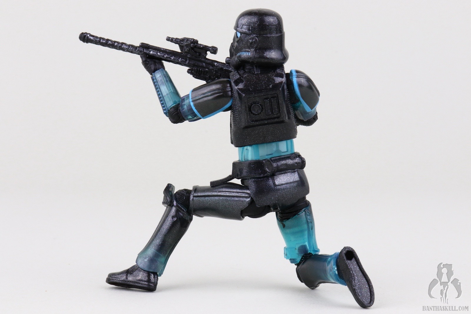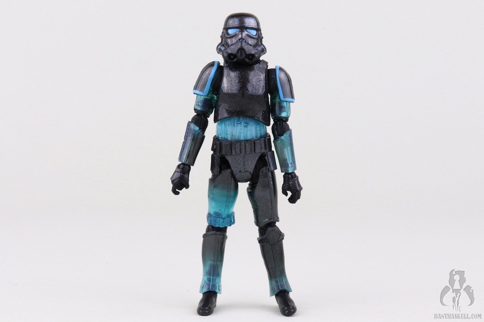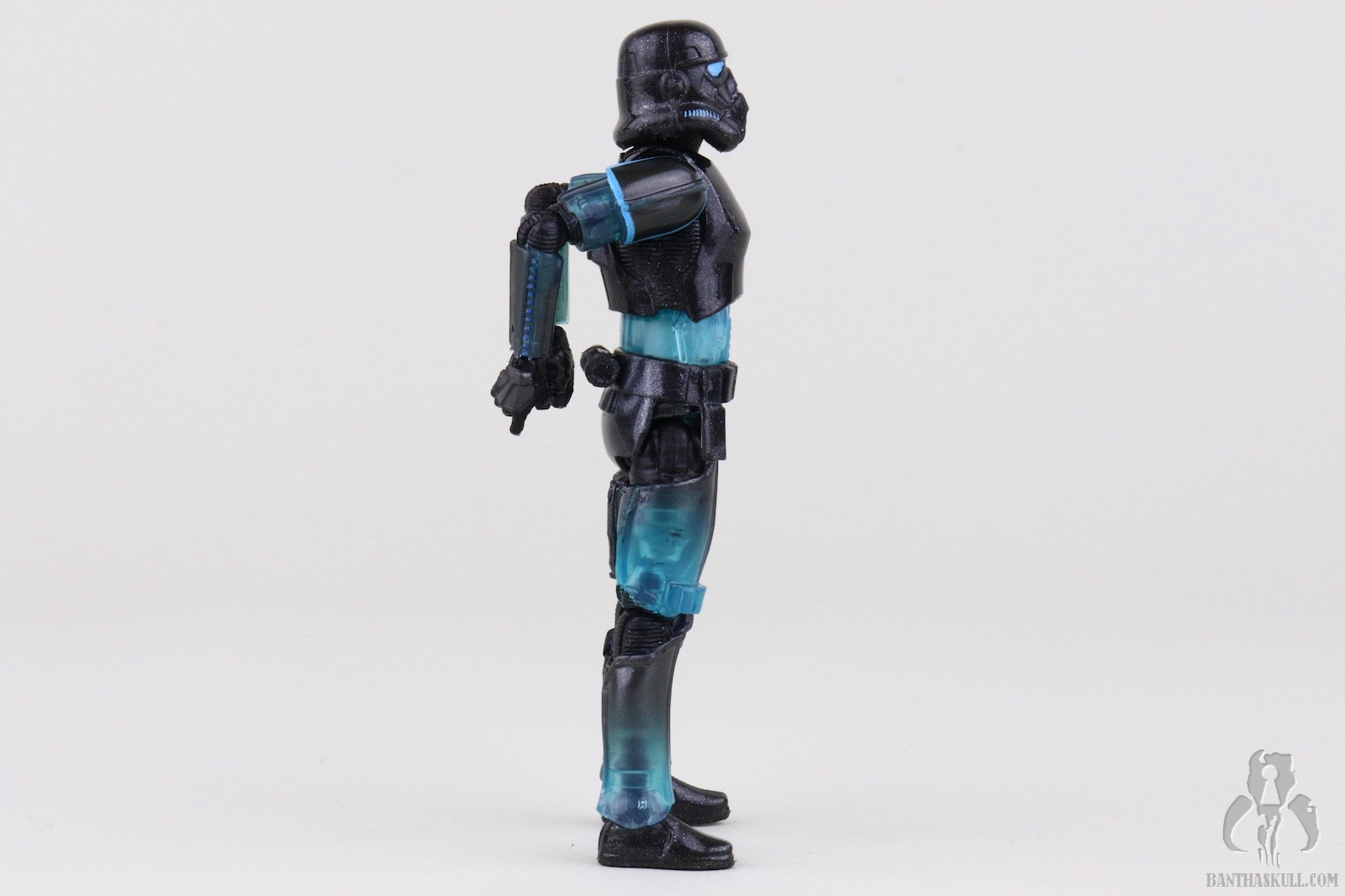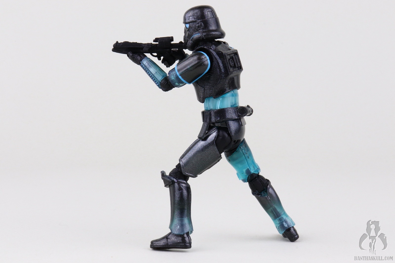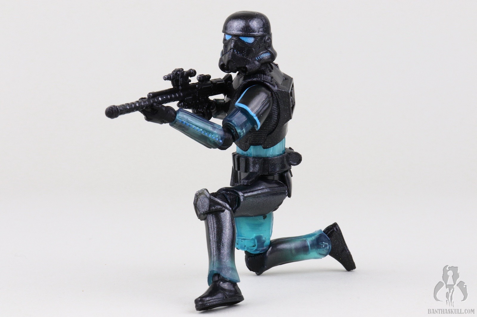 The reason I’m not deducting a point is to reward Hasbro for going above and beyond with the deco. This figure easily could have been accomplished with minimal paint applications. Most of the deco could have been achieved via the color casting of the plastic plus replacing the customary black paint applications on the helmet with blue. No one would have complained, or probably noticed had Hasbro chosen that path, but they didn’t. First of all, the eye lenses are not a solid blue. It looks like they utilized the Photo Real “pointillism” technique with varying shades of blue which give an electrified effect. Next, the entire figure is covered in a subtle silver spray. Under magnification it looks like the Shadow Stormtrooper was the victim of a glitter bomb, but with the naked eye it gives a shimmering appearance. I also took off my pants, and it still looked shimmery. I wanted to test it against varying manners of nakedness.