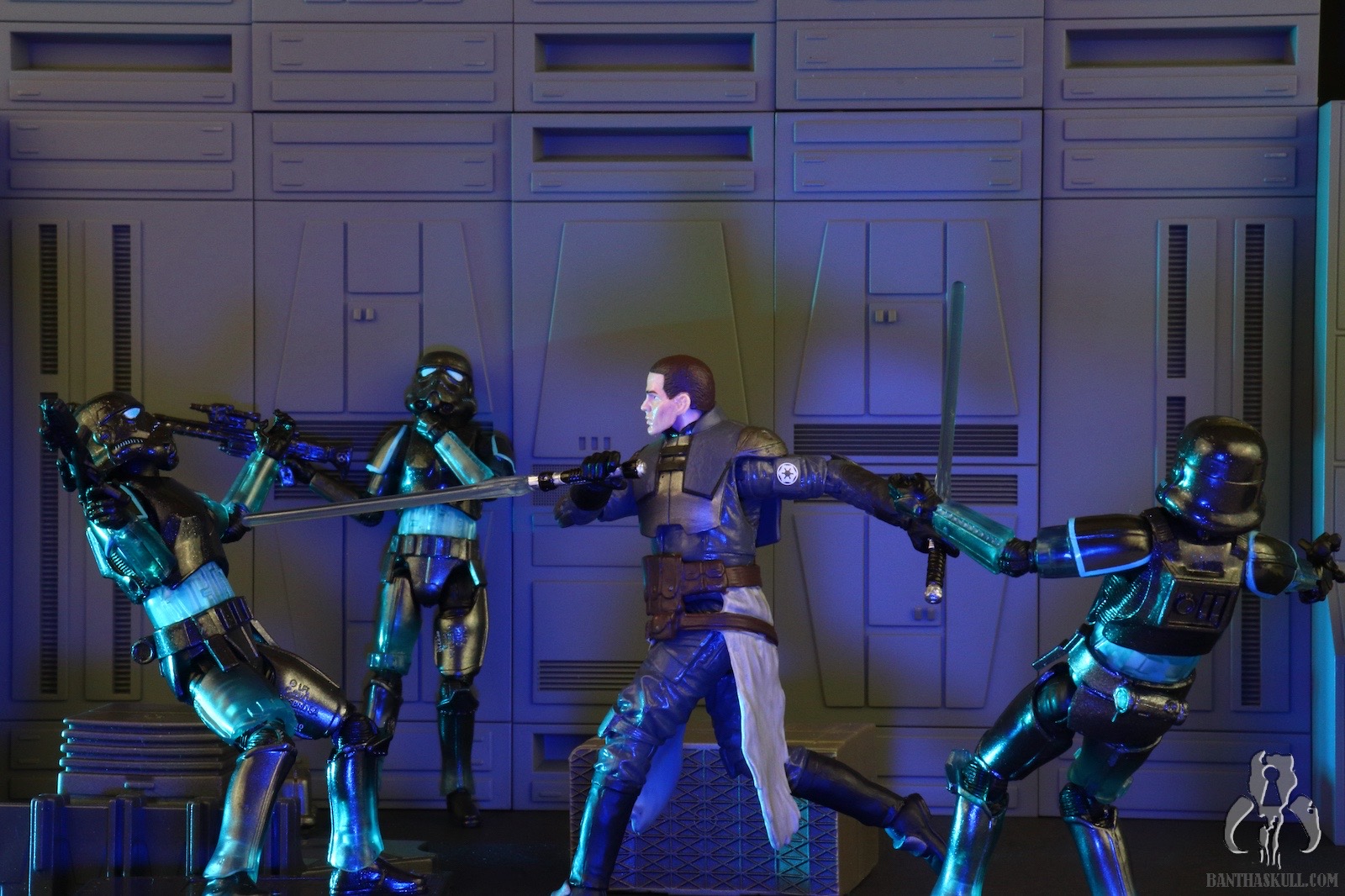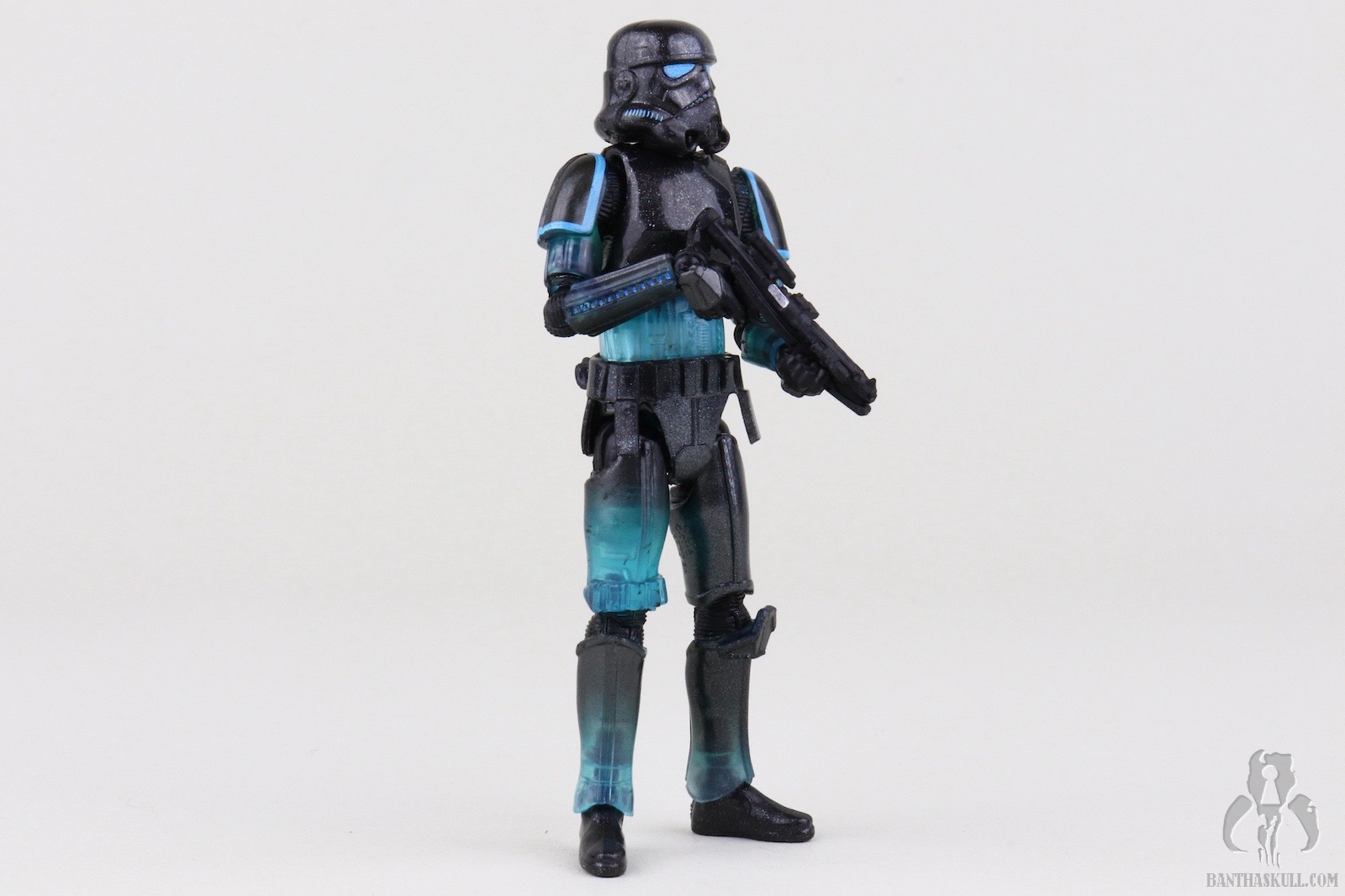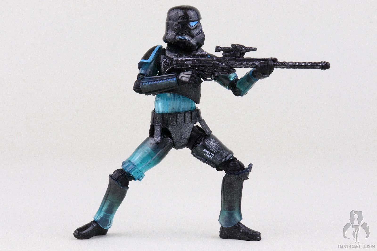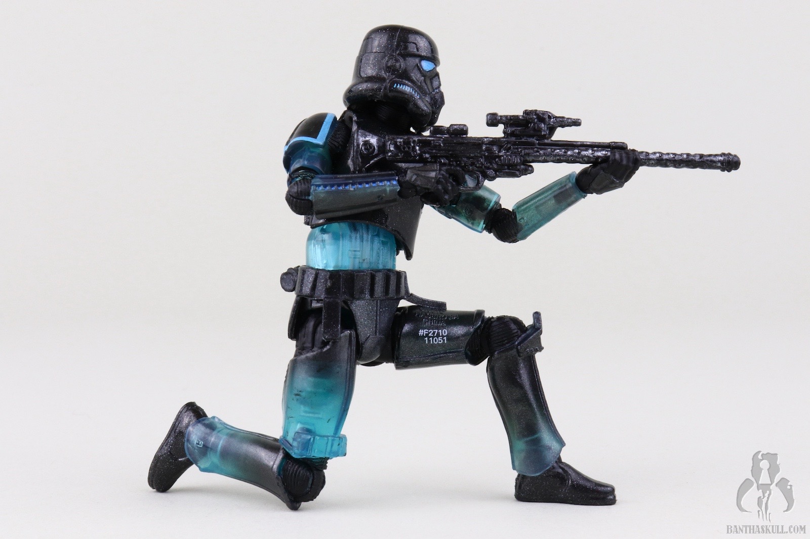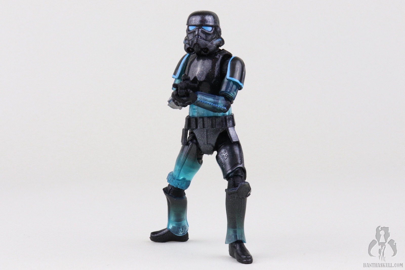 The reason I’m not deducting a point is to reward Hasbro for going above and beyond with the deco. This figure easily could have been accomplished with minimal paint applications. Most of the deco could have been achieved via the color casting of the plastic plus replacing the customary black paint applications on the helmet with blue. No one would have complained, or probably noticed had Hasbro chosen that path, but they didn’t. First of all, the eye lenses are not a solid blue. It looks like they utilized the Photo Real “pointillism” technique with varying shades of blue which give an electrified effect. Next, the entire figure is covered in a subtle silver spray. Under magnification it looks like the Shadow Stormtrooper was the victim of a glitter bomb, but with the naked eye it gives a shimmering appearance. I also took off my pants, and it still looked shimmery. I wanted to test it against varying manners of nakedness.