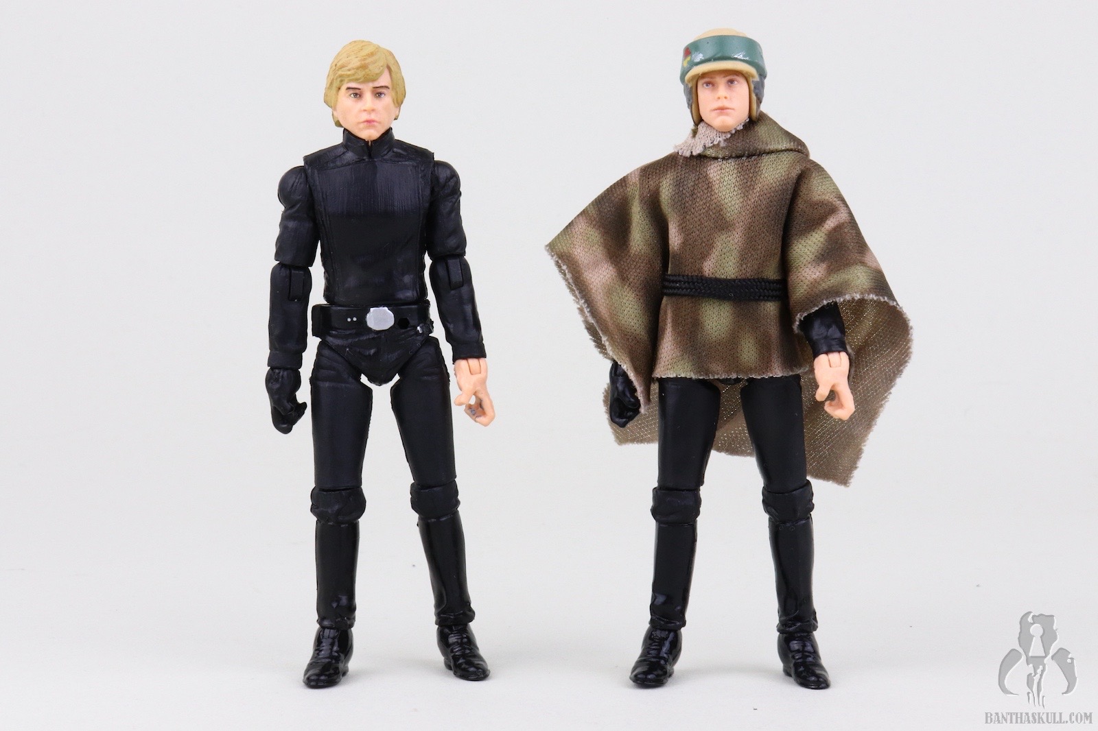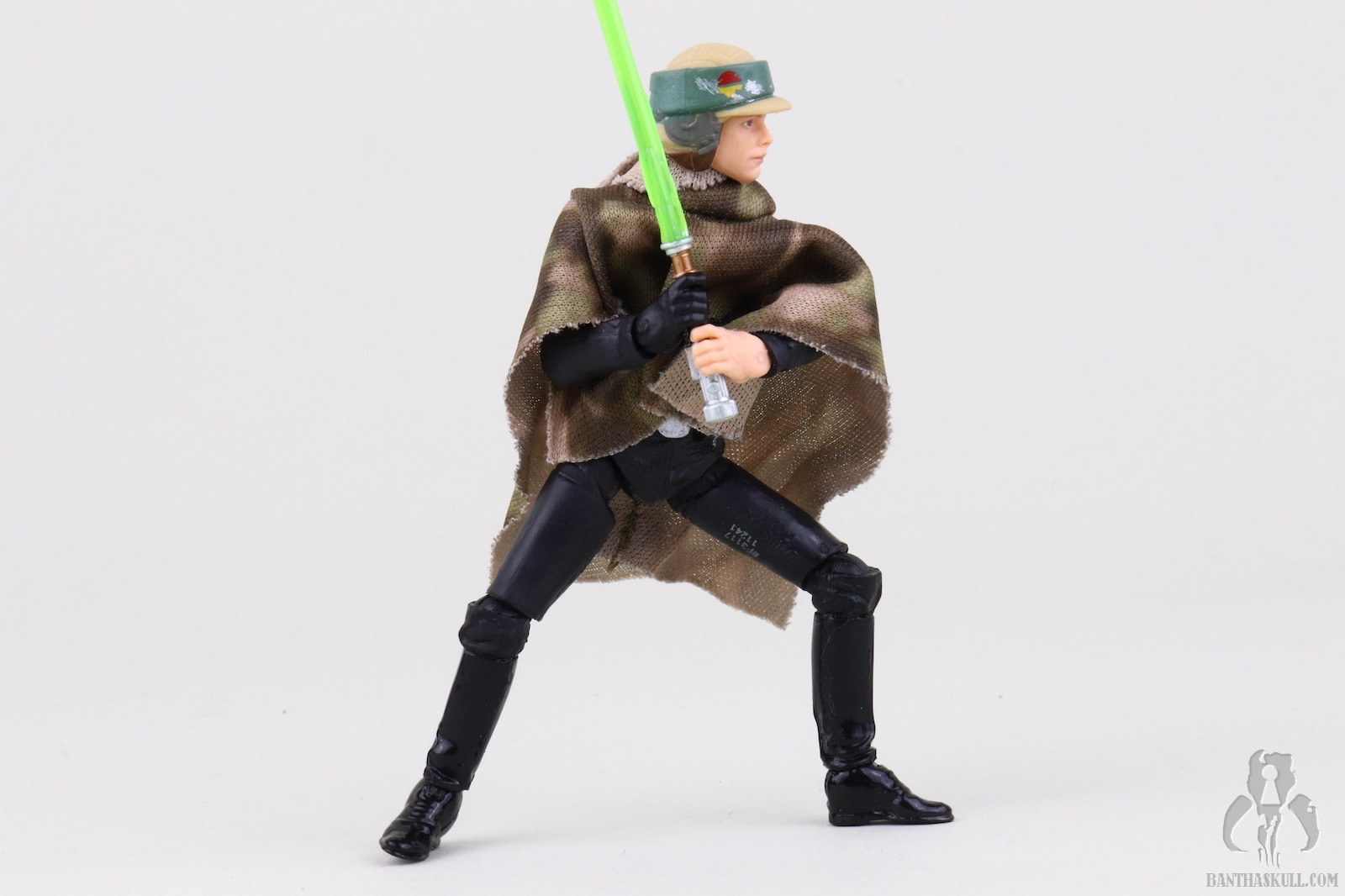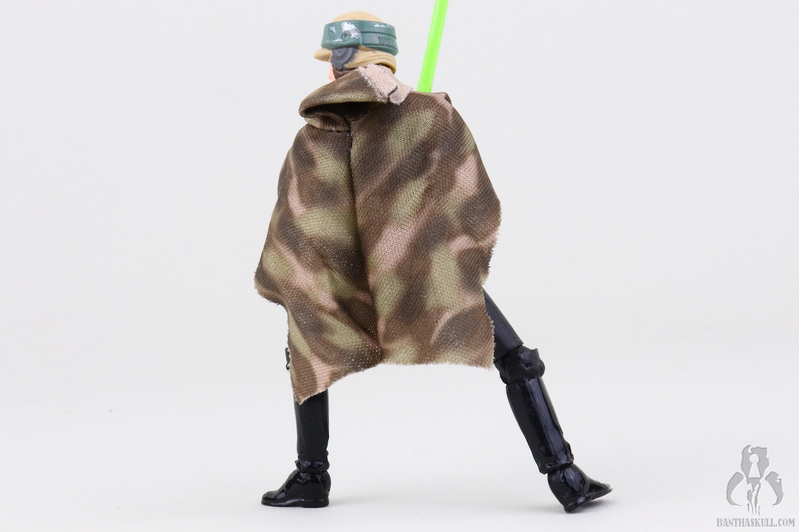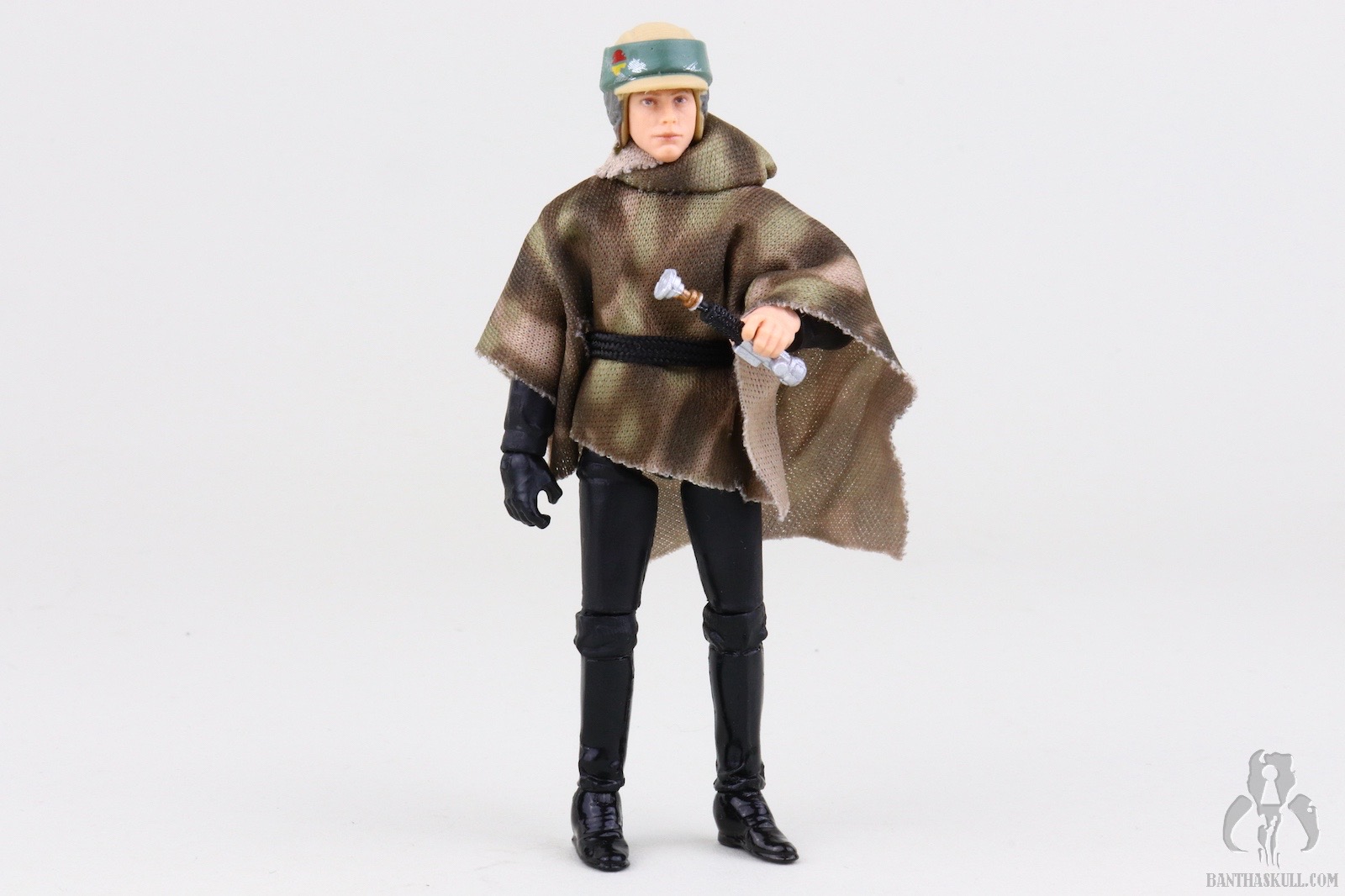 The poncho itself is an upgrade from previous releases. The camo patten is much clearer and better defined than the muddled appearance from the predecessors. The belt is a black fabric strip to mimc the web belt of the actual on-screen costume. Previous releases featured a brown holster belt which is wholly inaccurate. The new camo pattern and belt increase the overall accuracy of the figure. Oddly, despite ditching the inaccurate holster, the figure still includes the DL-18 blaster. This is likely a wink to the original Kenner POTF ‘85 release which also included the accessory. Unfortunately the base VC23 figure was sculpted to interact with a lightsaber, as it should have, and not a blaster. This means it lacks a floating trigger finger, so this Endor Luke is a bit of a throwback to POTF “2” figures in that it doesn’t really grasp the blaster. It more rests in the hand. This is hardly a serious concern, however, because Luke didn’t have this sidearm on Endor.