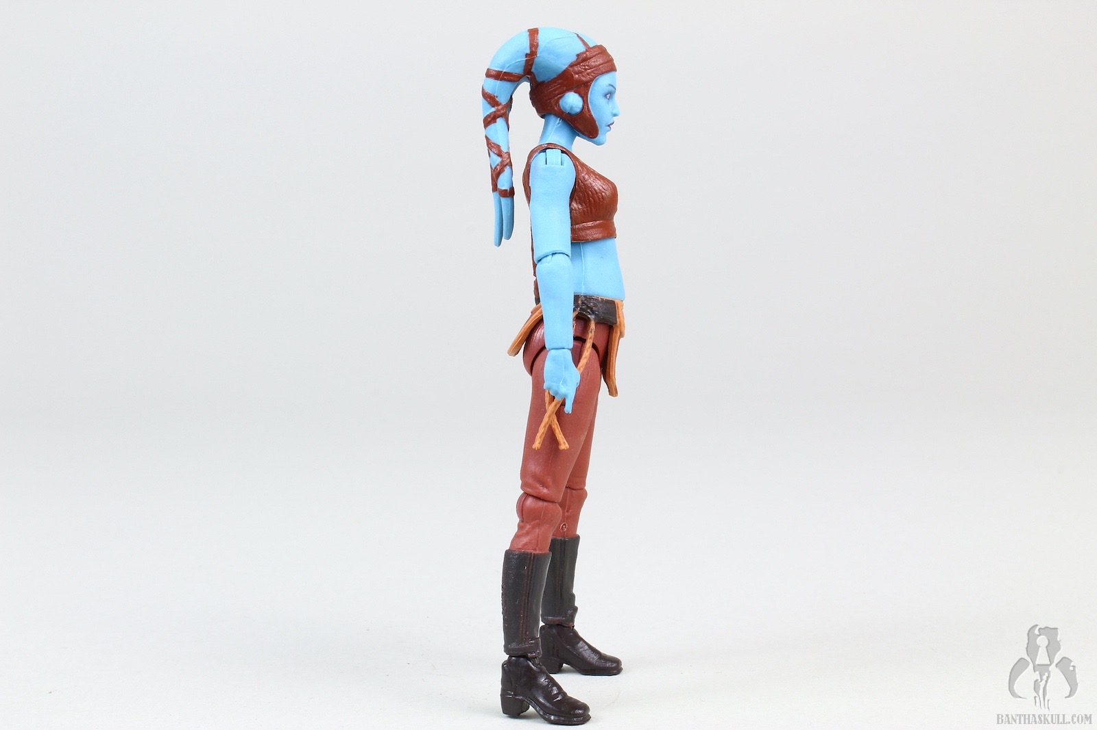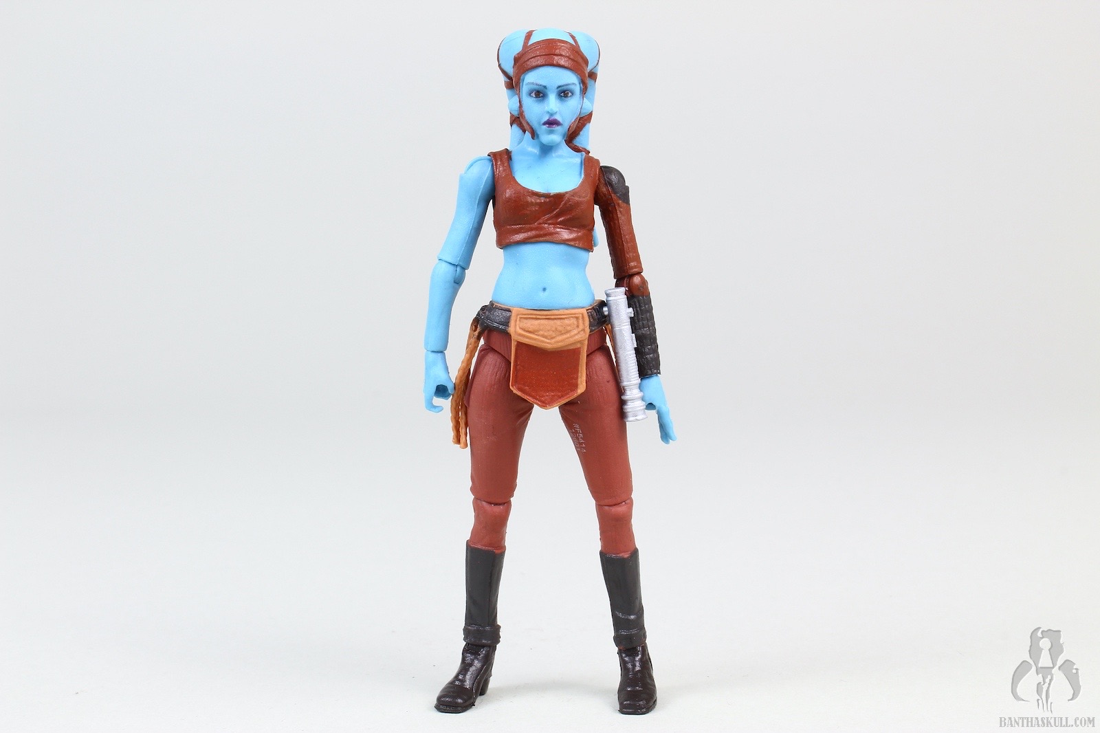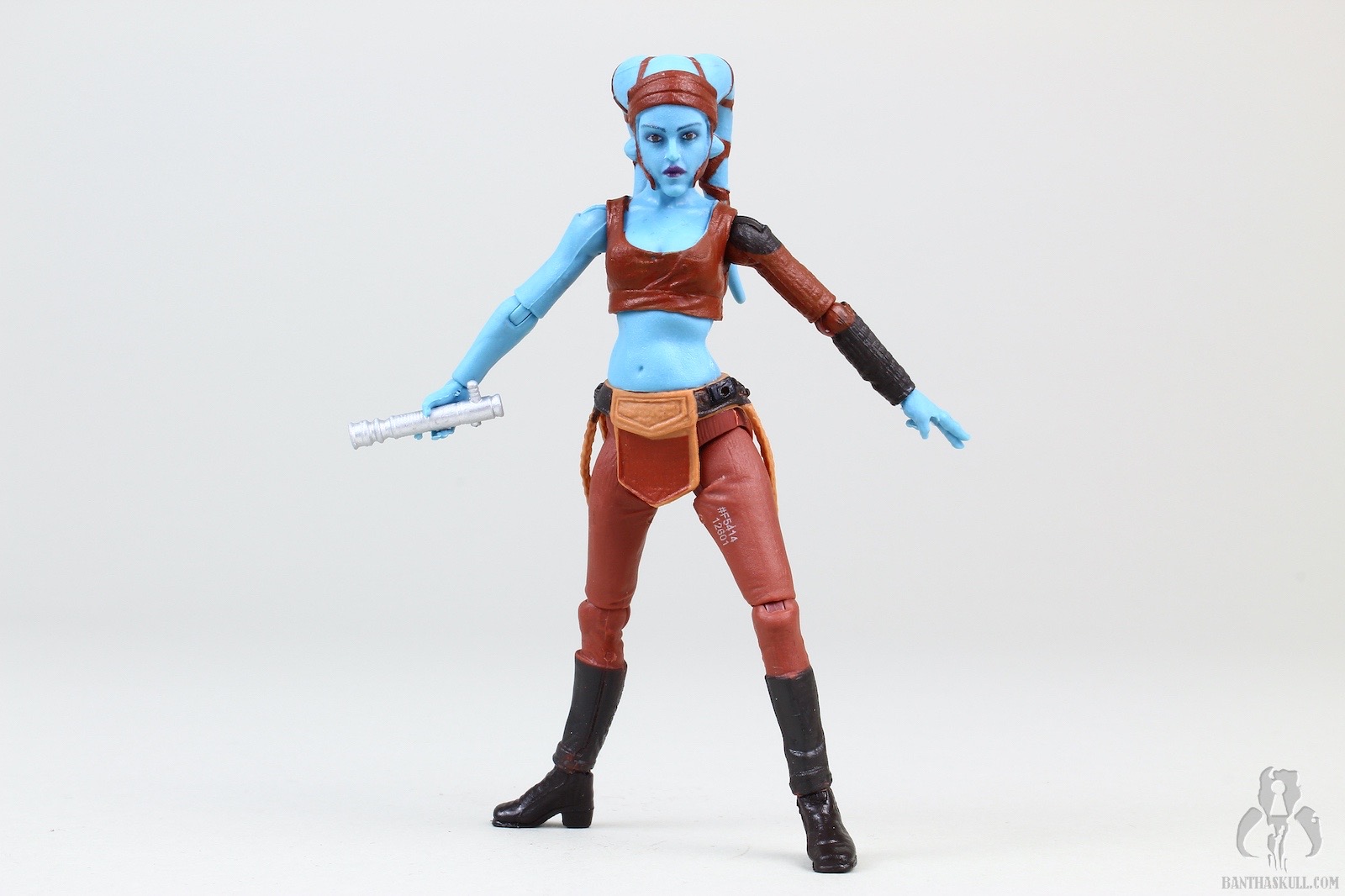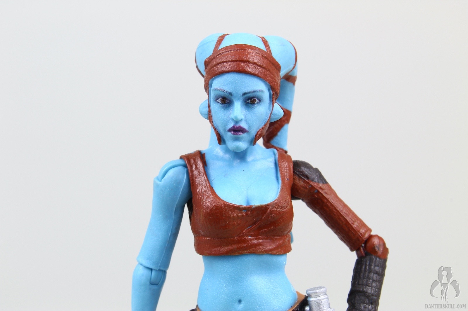 I’ve written often about my disdain for 3.75” figures that are not realistically styled, in both sculpt and paint, as if they were based on a live-action character. So I was not all that excited when Hasbro opted to repaint 6 existing realistically-styled figures in colors/schemes that more closely resemble their respective appearances in the cartoon. I’m really not a fan of this. While I respect the thought process, I’m basically buying figures that don’t really go with my collection. Each figure ranges in “severity” as to how far away from live-action they appear, and whether or not they are worth rebuying if you have the original releases. Fortunately, after getting a closer look at them, I’m not put off too much. As someone I used to follow closely in the toy community used to say, these may be different enough to make you mad. In the case of Aayla, maybe not.
