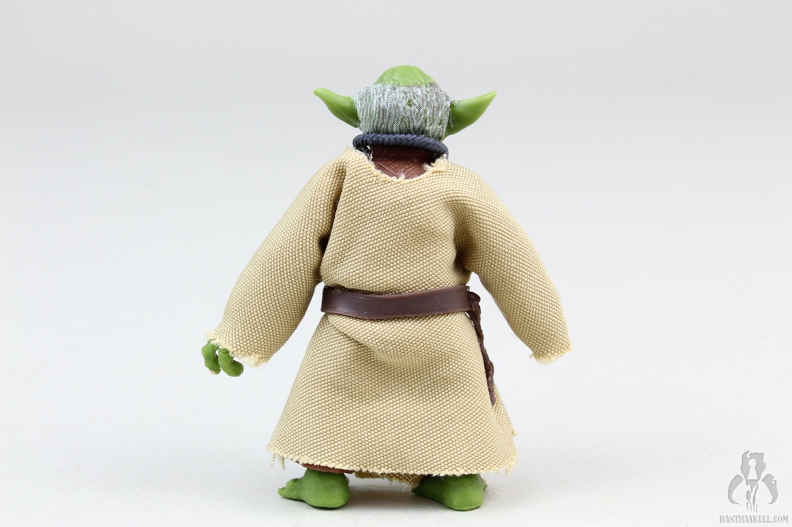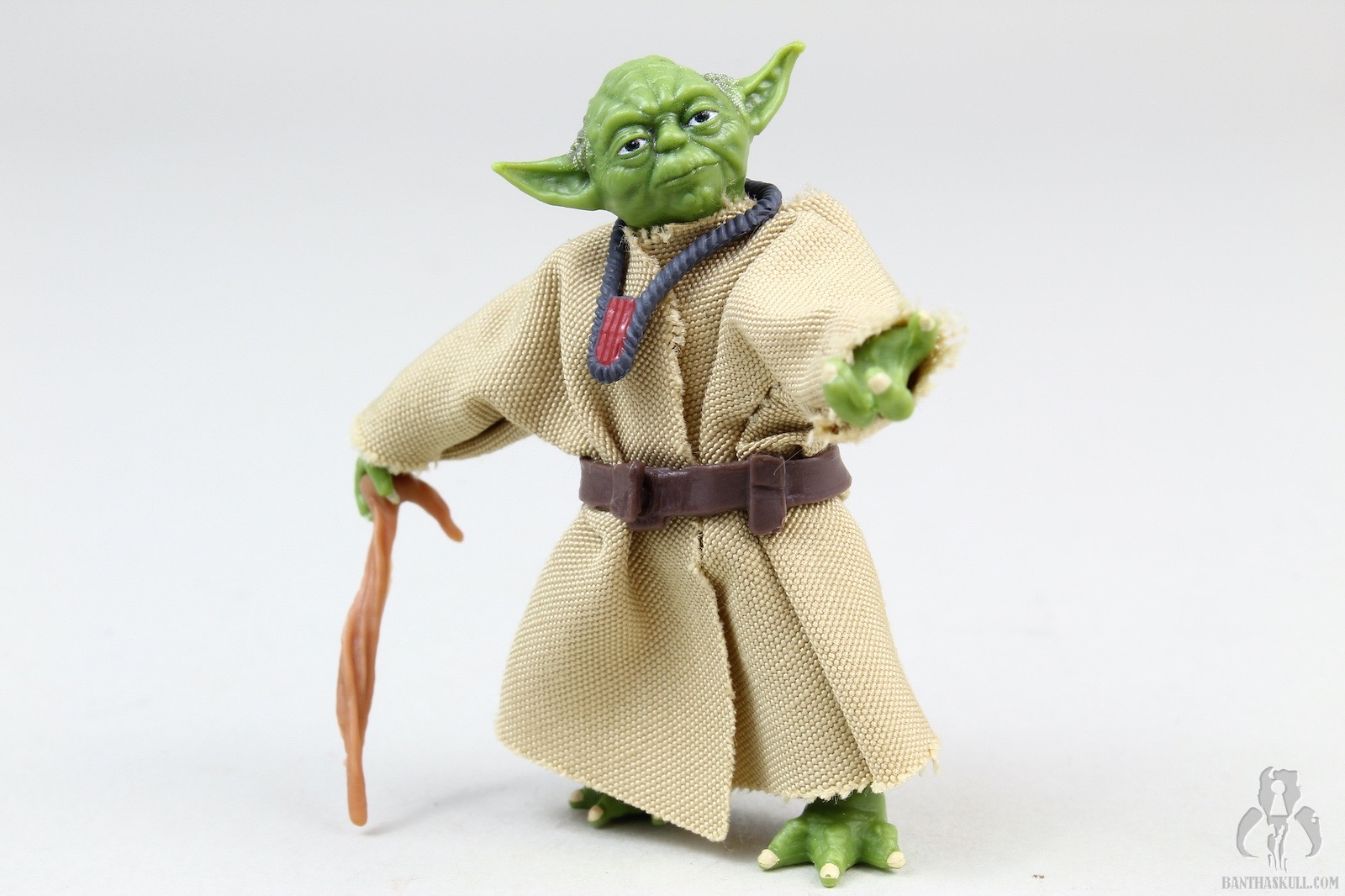 We finally have a super articulated Original Trilogy Yoda. True the elbows are the dreaded swivel elbows, but super articulation is defined by the amount of articulation and not the type. The body is borrowed form the VC20 Episode III based Yoda. It is married to a new, and frankly outstanding, head sculpt. Its right hand can securely grab the included gimer stick. Placing the open left hand on top of the right hand while the figure leans on the gimer stick allows the figure to achieve the iconic OT pose.