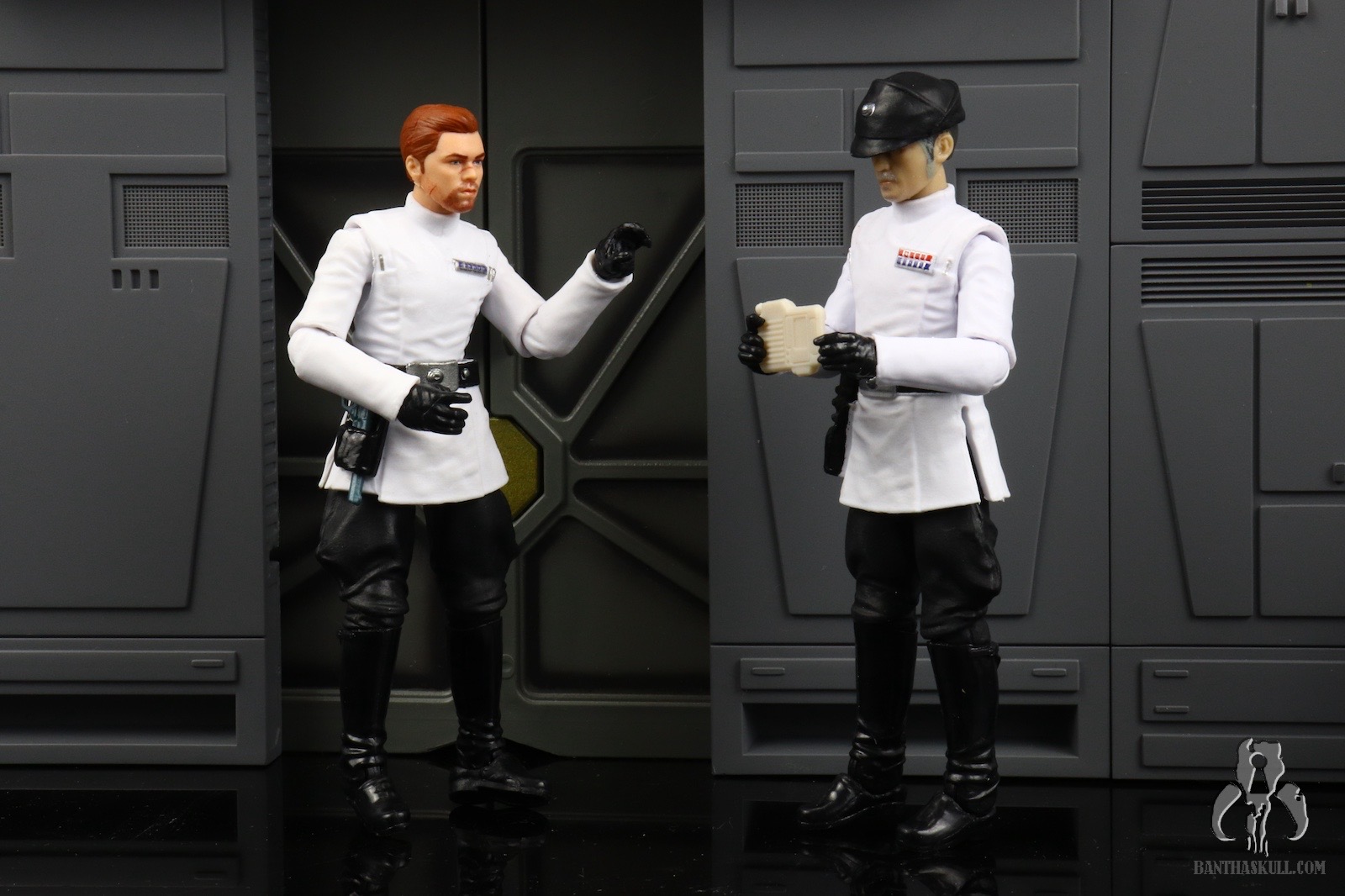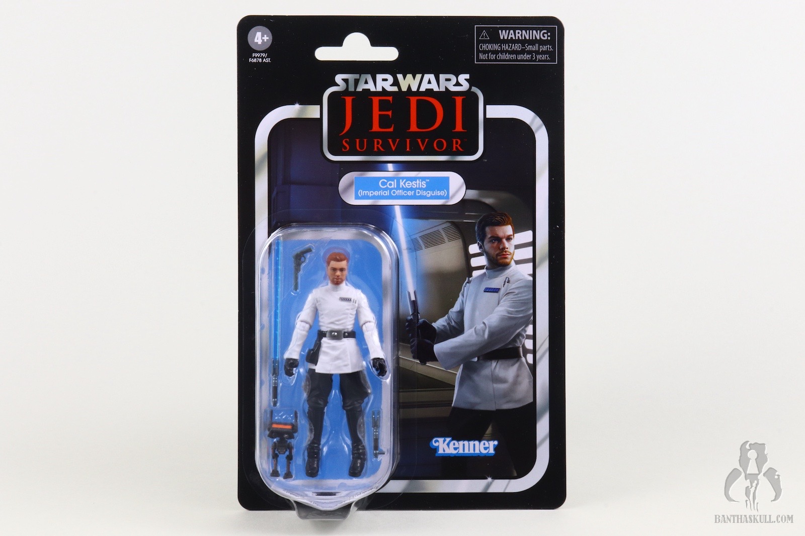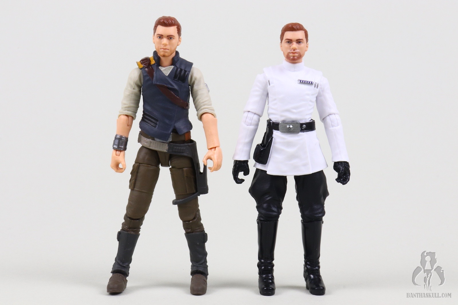 In addition to the poor interaction with the saber, there are also inaccuracies with this release. Lank Denvik, and thus Imperial Disguise Cal, wears a four blue square rank badge, which I believe represents a Captain in the ISB, plus a one by one code cylinder configuration. This figure has a six blue square rank badge, and one by two code cylinders. Cal does carry his sidearm during this phase of the game, but it’s on his left side and slung low in the holster belt position. With this release, the holster moves to the right side, and is high up on the waist of the tunic. Finally, to match the generic officer buck, Cal shrinks a few inches in scaled height. All of this is to say that this isn’t Cal Kestis in Imperial Officer Disguise. It’s a generic Imperial Officer with a Cal Kestis head. That head looks a little full and squat for Cal, incidentally, but this release does have the facial scar, unlike the standard Jedi Survivor VC265 - Cal Kestis release.