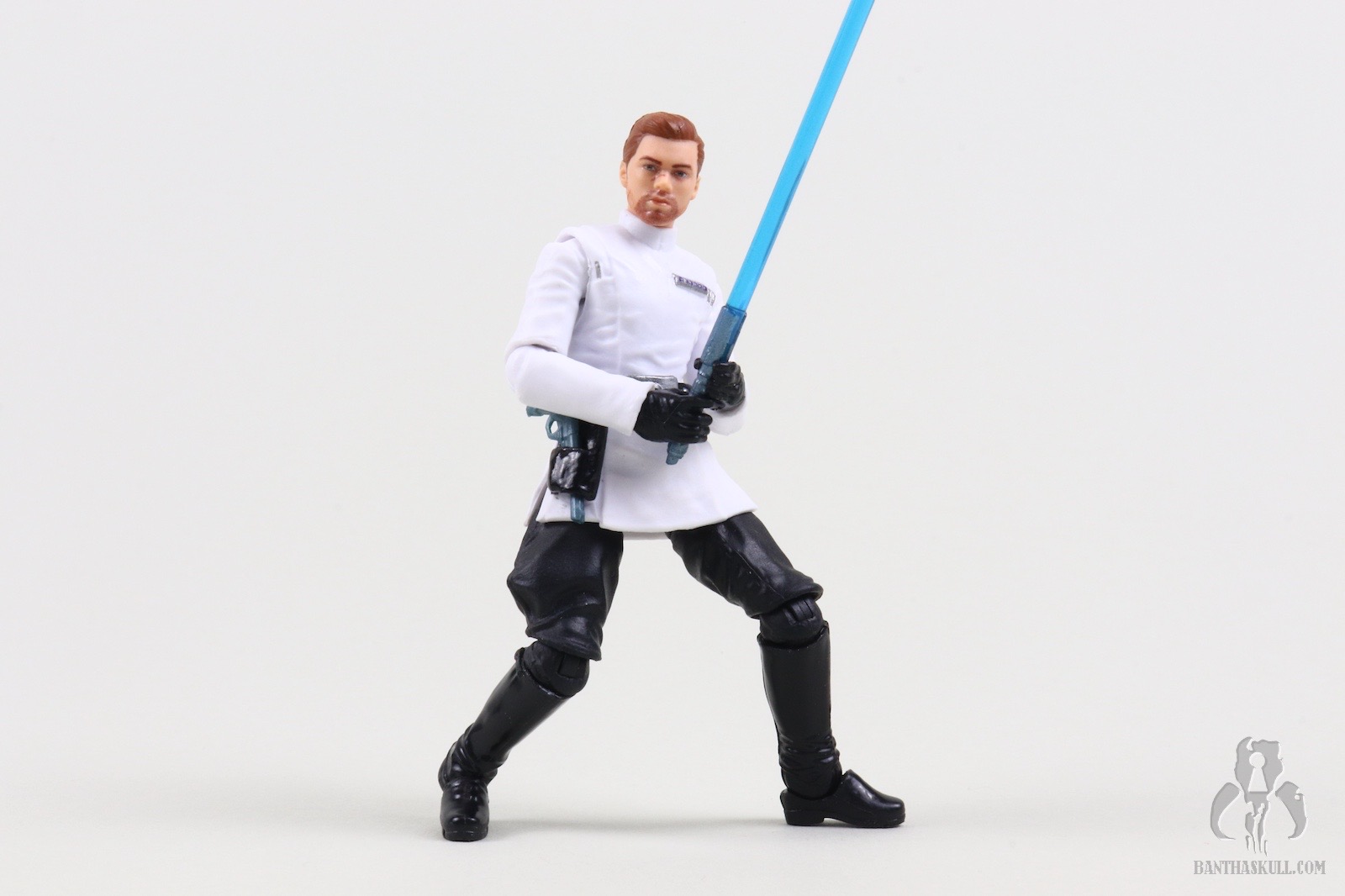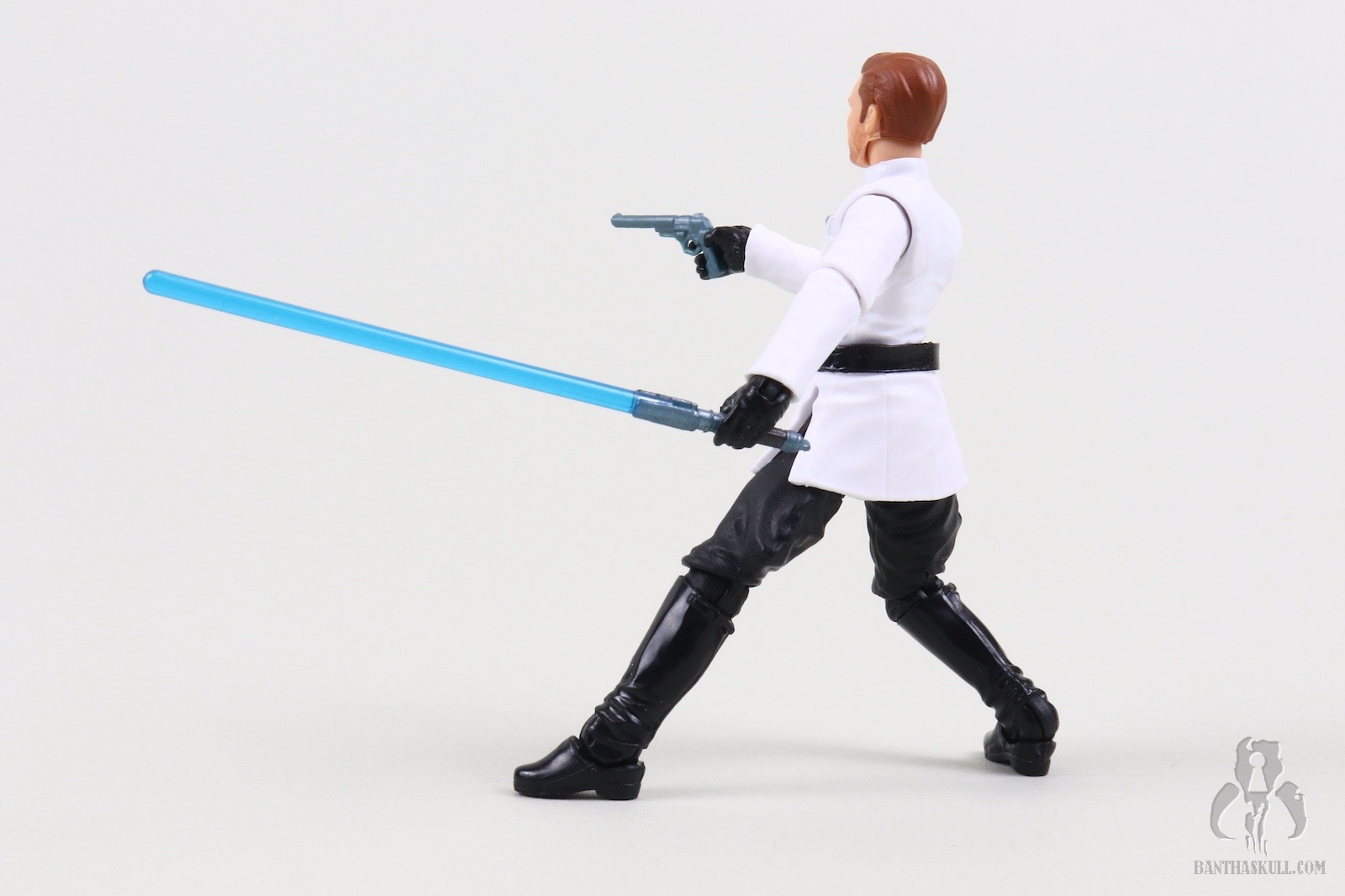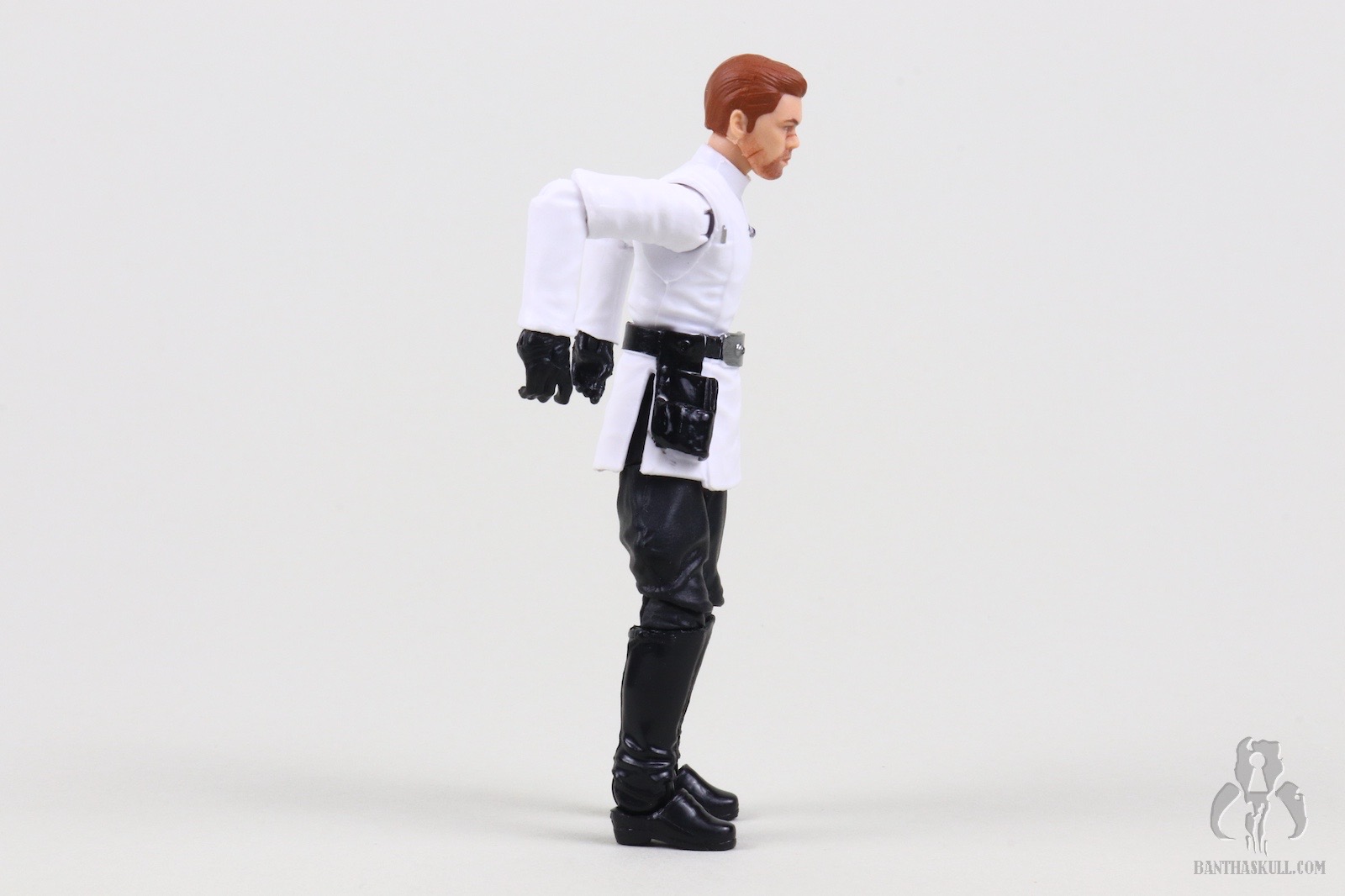 Mr. Nomadscout asked me to do this review since he hadn’t completed Jedi Survivor yet. When I explained to him that all Cal does in this disguise is walk and Jedi mind trick some dupe into opening a door, I said it would make for some scintillating diorama shots. Of course Hasbro didn’t cast this accessory load out to the game because it would make for a boring release. The figure comes with Cal’s lit saber, which, if memory serves, he never ignites while wearing Lank Denvik’s uniform, but therein lies the problem. The Imperial Officer base sculpt interacts terribly with a lightsaber. The hands are not sculpted to grip the hilt well, particularly the left hand. That left wrist hinges in the wrong direction for effective dueling poses. The elbows can’t even bend to a full ninety degrees, and legs can’t really be posed in dynamic dueling stances. Most of the poses above look like Cal is loading up his back foot to hit a dinger. For our non-American readers, that means his weight is on his back foot similar to a baseball swing. The figure also includes the saber hilt with a peg to hypothetically attach to the belt, but there is no corresponding peg hole. Also, in-game, Cal isn’t seen carrying the hilt, but he presumably has it on him. Where, I don’t know. The first person in the comments to make a prison wallet joke will get all of my scorn!