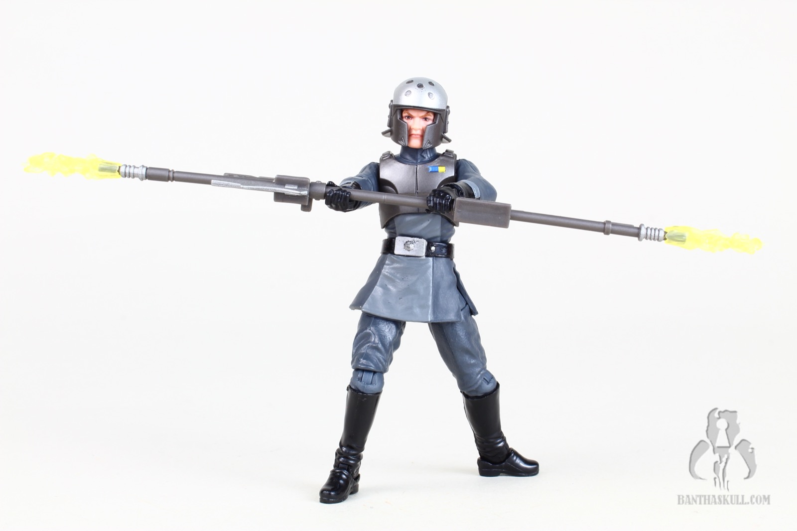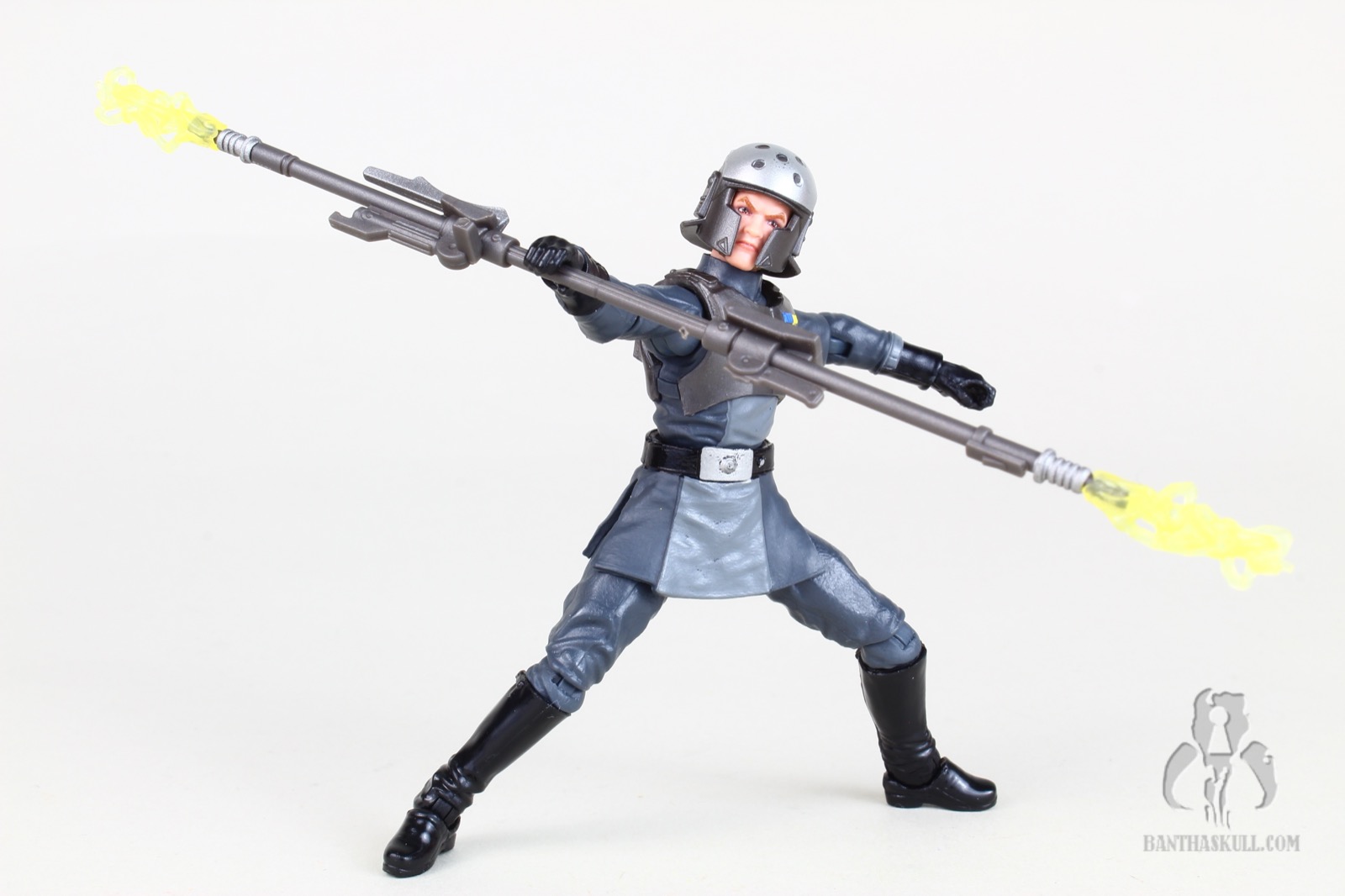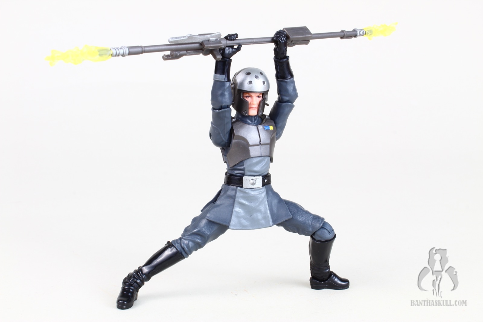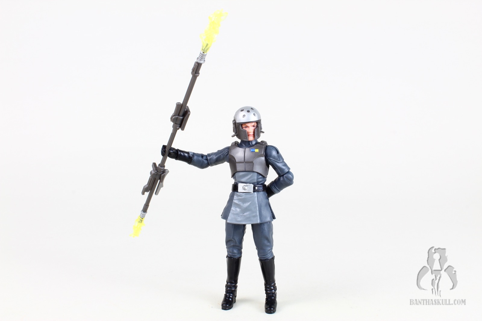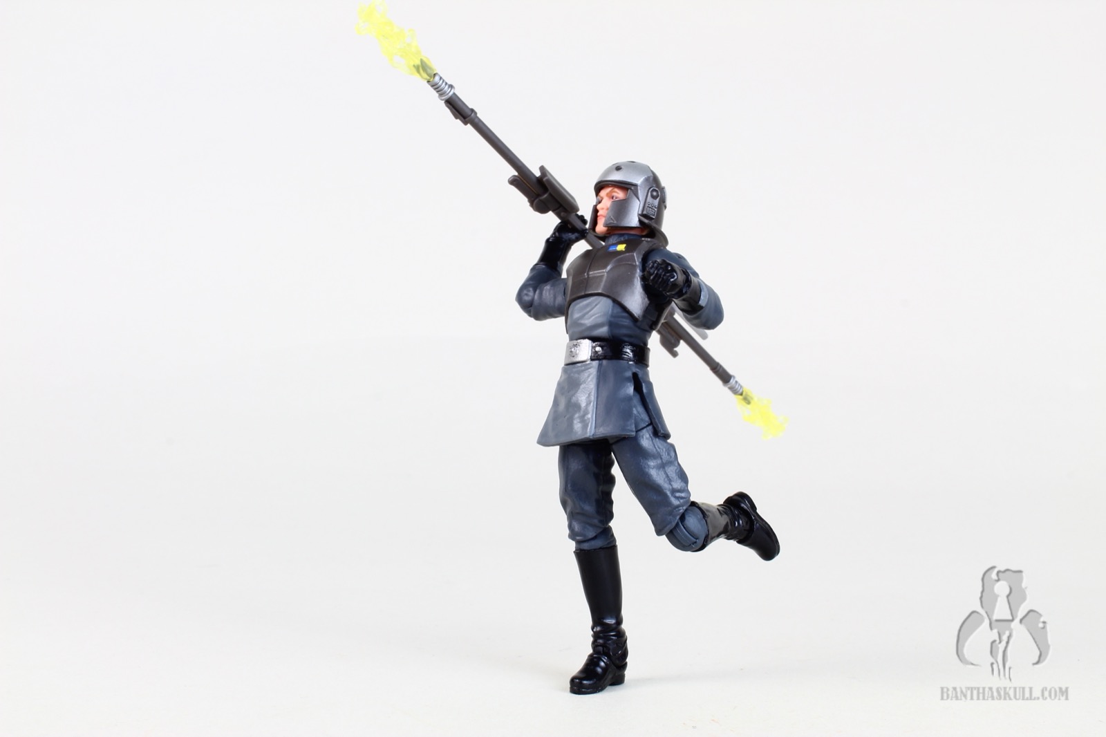 For weaponry, Kallus only comes with a completed bo-staff. It looks nice, and he can perform various grips and poses with it. I would have liked if Hasbro provided an alternative “half” bo-staff (like they did with Zeb), to give additionally options for posing. Kallsu often used it as a blaster. To compliment the bo-staff, Hasbro included a pair of electrostatic effects that plug in nicely to either end of the staff, and look great when attached to the posed figure.