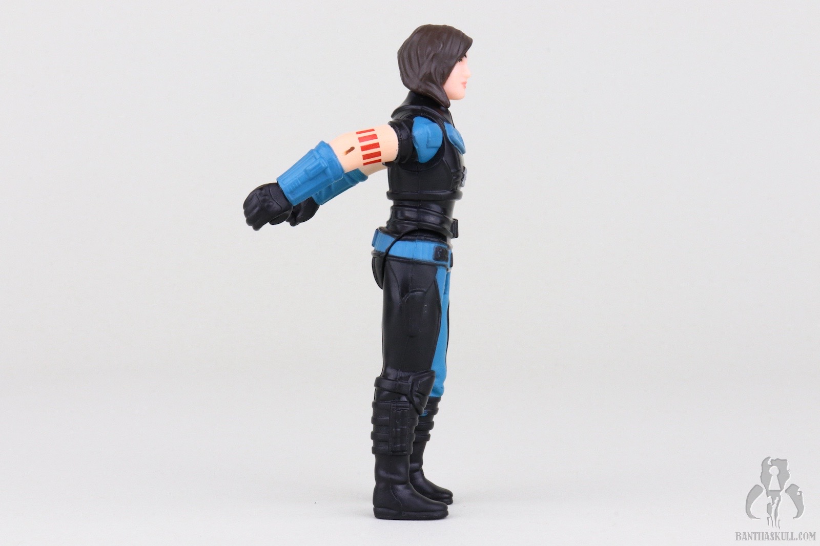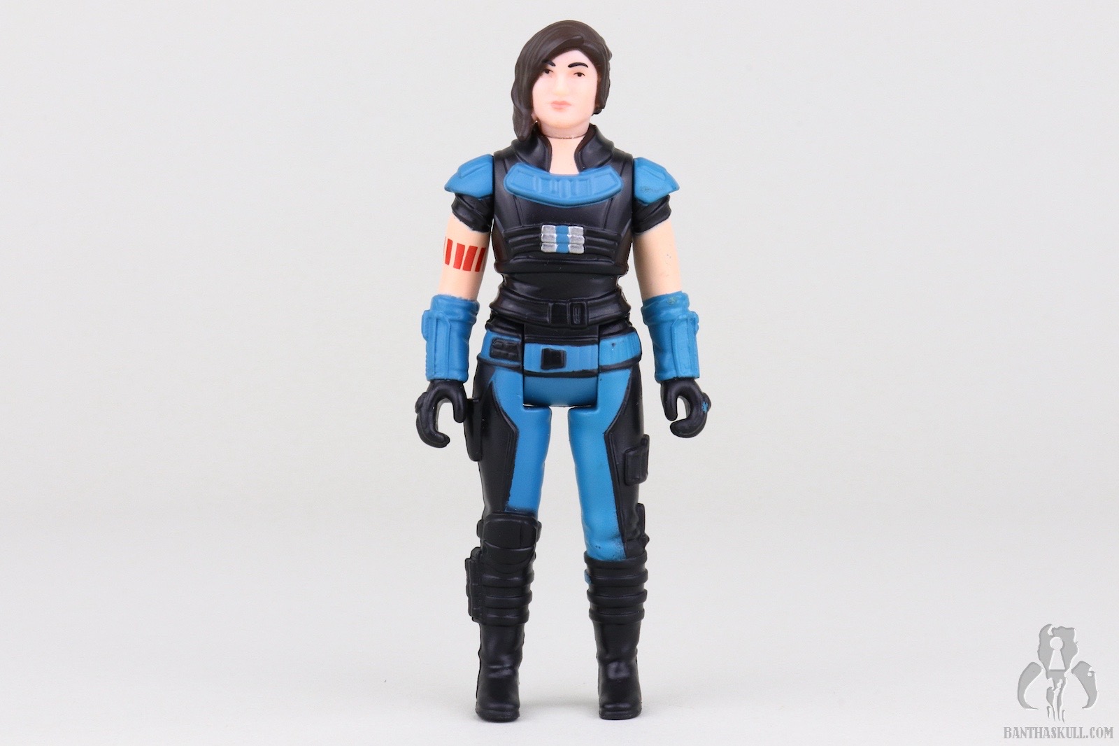 Some of the other Mandalorian Retro Collection figures feel like they have a little extra detailing beyond what would have been offered in the vintage Kenner line. This Cara Dune, however, feels just right. I think this one captures the retro feel exactly. The facial paint applications are barely better than an old school Lego mini-figure, which is correct. Not even a pretense of Dune’s Rebel Starbird tear tattoo is present. The head sculpt itself doesn’t bear much, if any, likeness to the actress either. In the Vintage Collection, these would be fatal flaws, but in the upside down world of the Retro Collection, they’re positives. The rest of the figure is mostly two tone teal and black with a splash of silver and red for the arm tattoo. It strikes the right balance of Kenner simplicity. This Cara Dune figure gets my vote for the most vintage feeling figure of the bunch.
