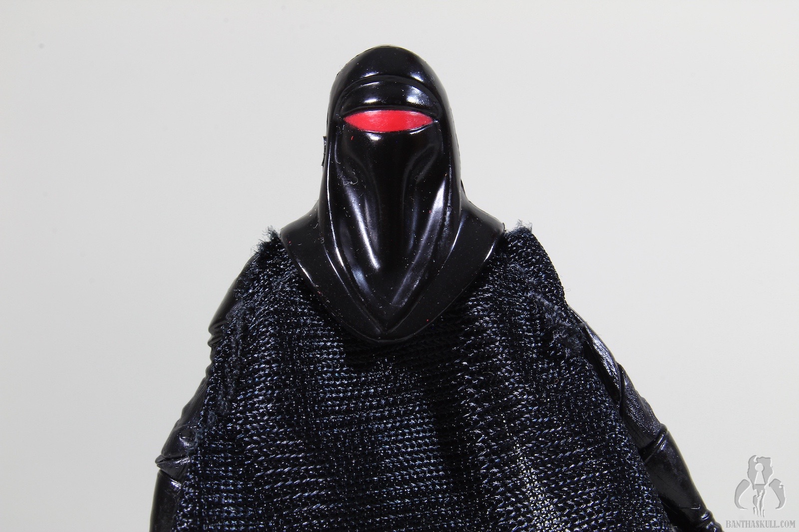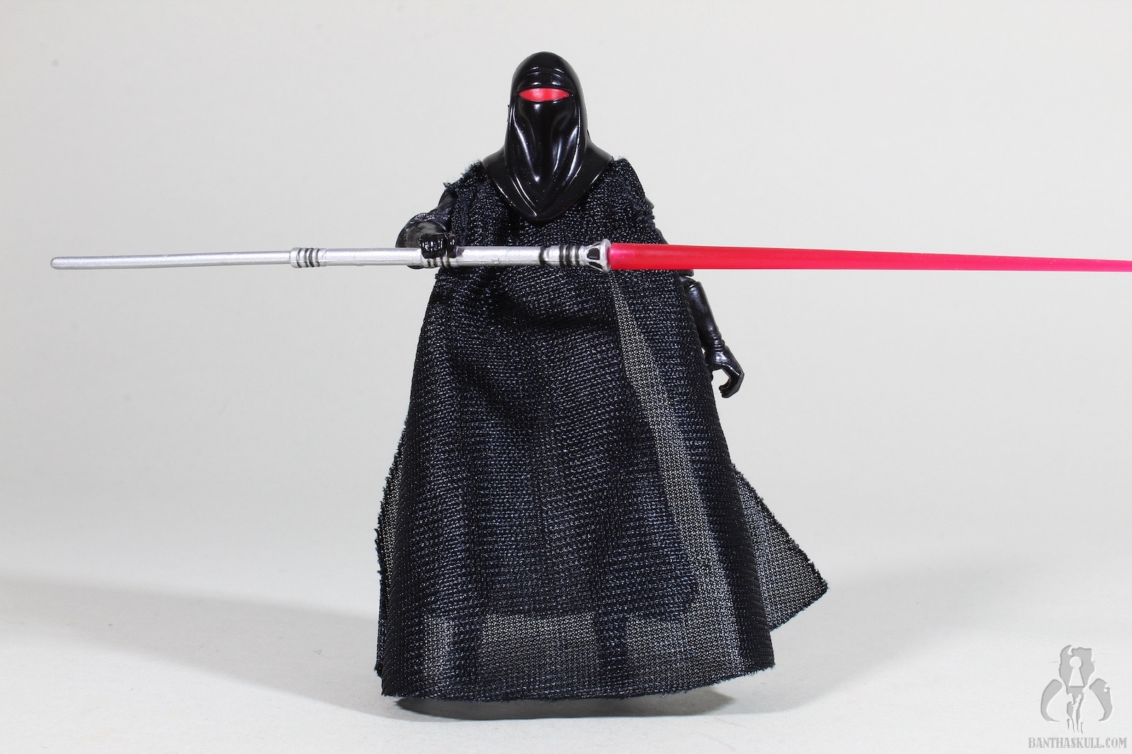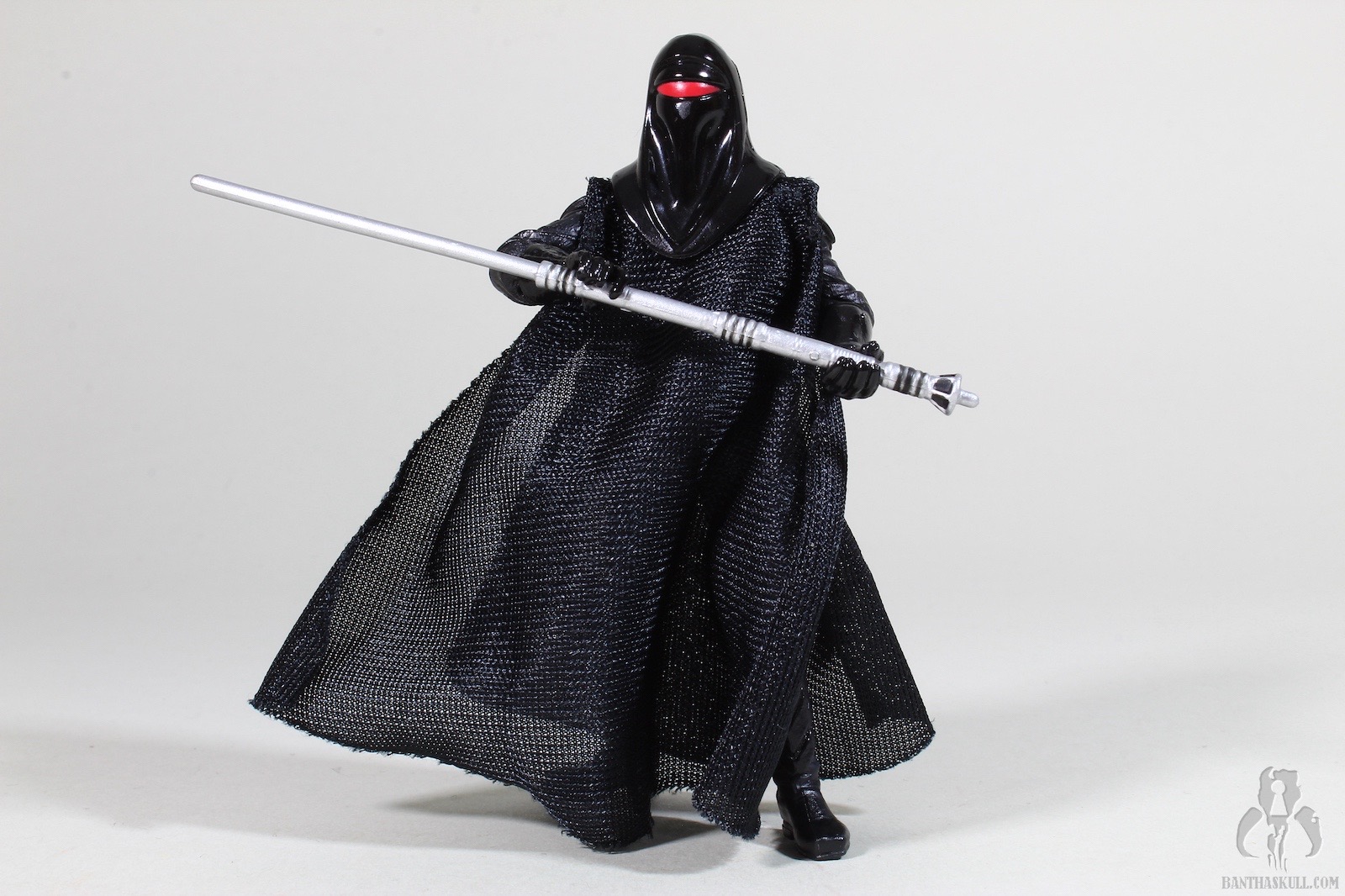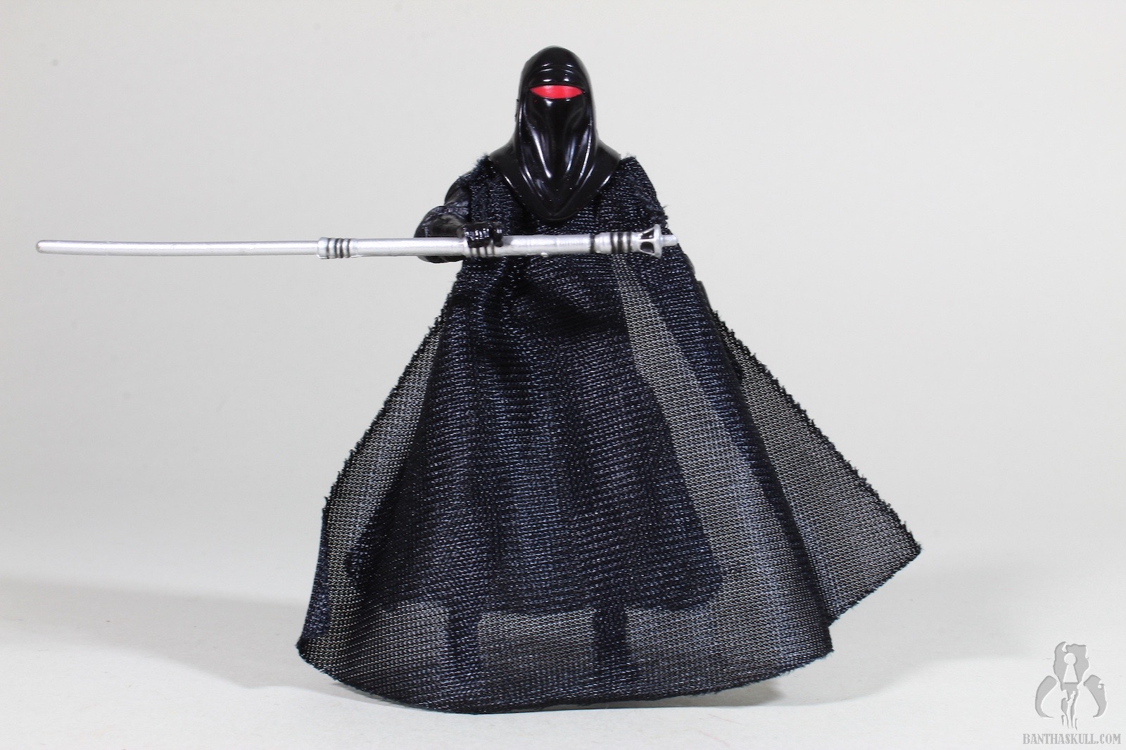 One of those “troopers” is the Emperor’s Shadow Guard. Force sensitive members of the Royal Guard were culled to form this elite group. Despite the name, this elite organization does not guard the Emperor’s shadow. He seems like the type of guy who would worry about such things, but the name is a red herring. In the game, the Shadow Guards are far from mere saber fodder for Galen Marek. They actually present a reasonable in-game challenge. Perhaps that is the reason this figure remains one of the most collectible TFU figures. Well, the real reason is most fans think a black Royal Guard is cool but we can pretend our collective mind goes deeper than that. Unfortunately using the 2005 ROTS Royal Guard as a basis for this figure does not do the character justice. In the game, the Shadow Guards appeared to wear Stormtrooper style armor on the torso with a kama draping from the waist. Dressing the figure up in Royal Guard like robes is a disservice. What’s puzzling is that Hasbro made new soft goods for this figure from the base figure. If they’re going to redo that element, why didn’t they make it accurate? Wikipedia says that the Shadow Guards were “identical” to Royal Guards with only an inversion of the color scheme to differentiate the two. This seems like a retcon. This is not supported in game. Additionally, the blade on the lightsaber pike is too long. The blade is as long as the staff, but it should really be about half as long.