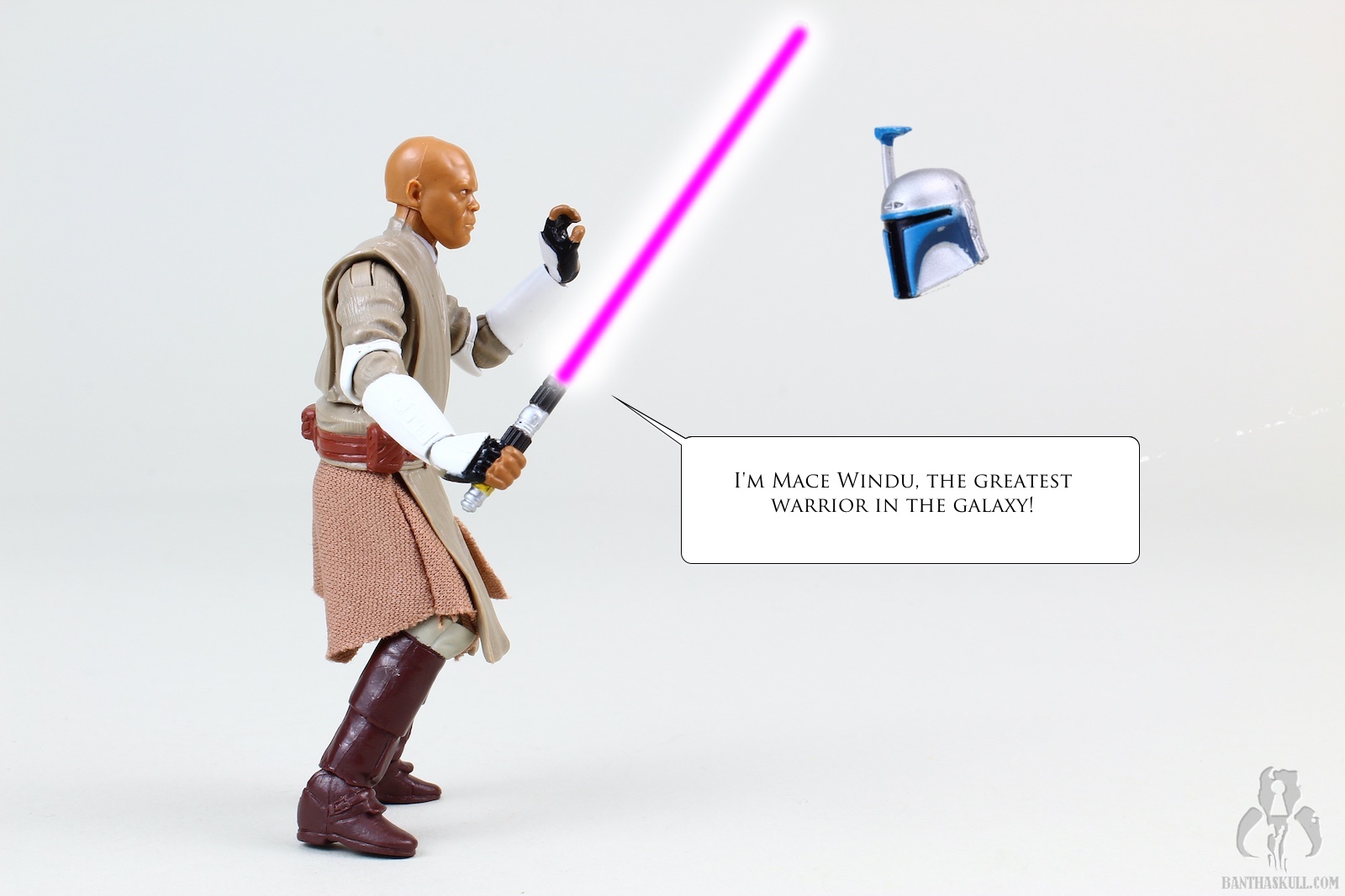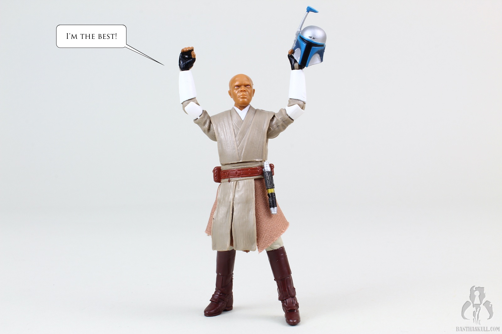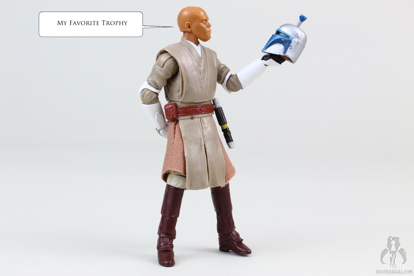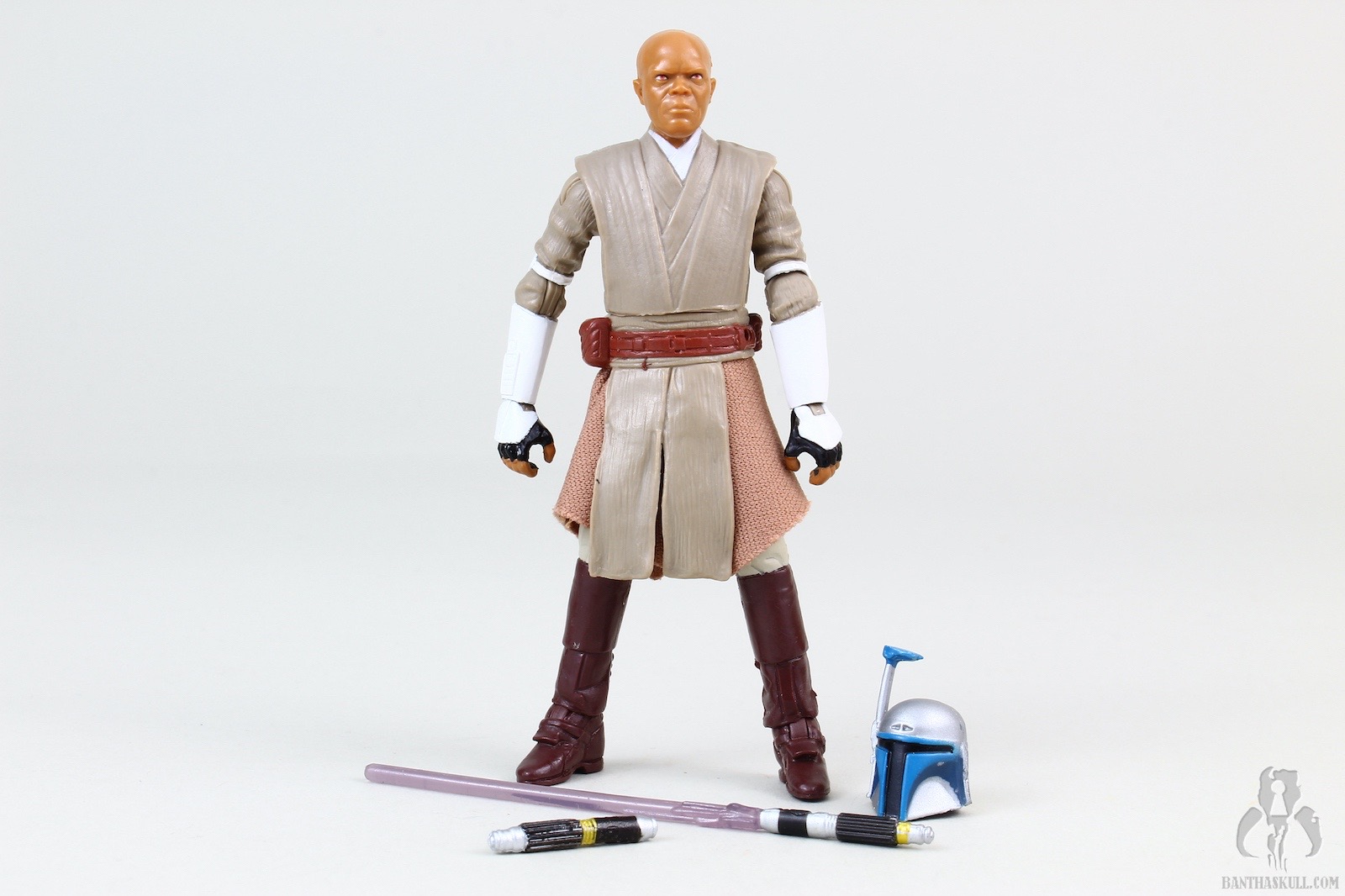 We got a Mace Windu figure in TVC. That figure was the film version of Mace. The only real difference in the costume here is the armored elbows and forearms. The head sculpt is all new. Interestingly, I like both, even though they look nothing alike, but both are a decent likeness to Sam Jackson. This figure has added wrist articulation, since these are ball jointed, This figure also has a ball jointed torso, but as Chris pointed out, it’s a double-edged sword because enabling the joint exposes the inner workings and ruins the aesthetic of the figure. This figure lacks a Jedi robe, but that’s just as well, since the one that came with the TVC version was particularly large. Mace also comes with a Jango Fett helmet accessory. I know that there was a story in TCW where the helmet was planted as a bomb to kill Mace. But I thought it was funny to think of the helmet as a trophy that Mace keeps in his quarters, and when he has some downtime, he’ll reenact the moment.