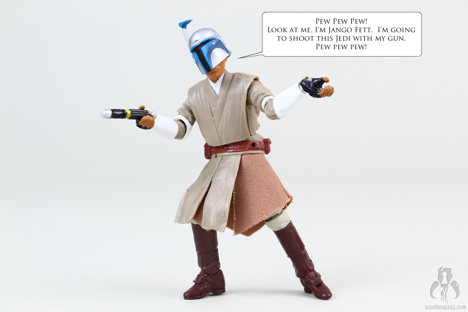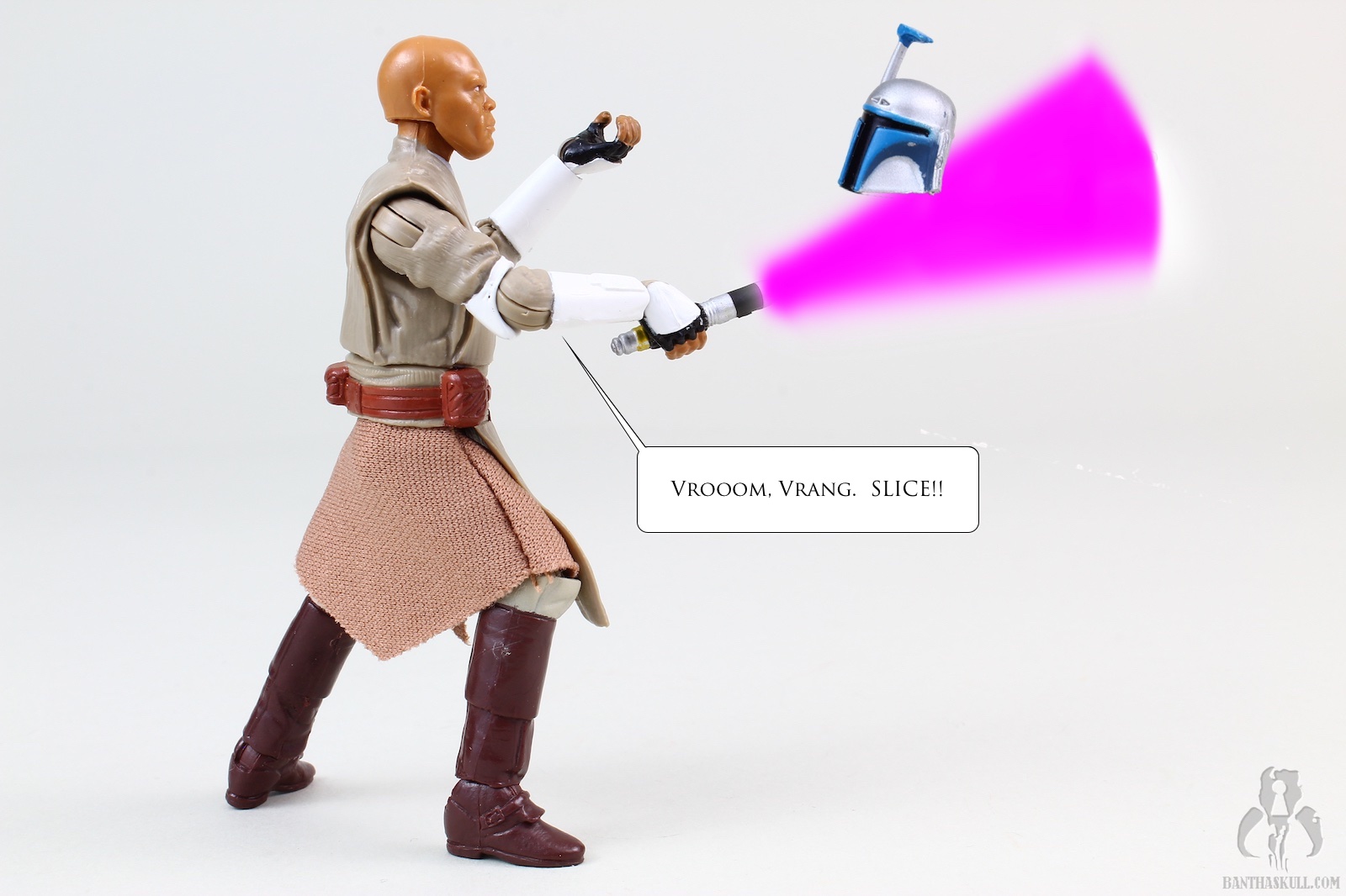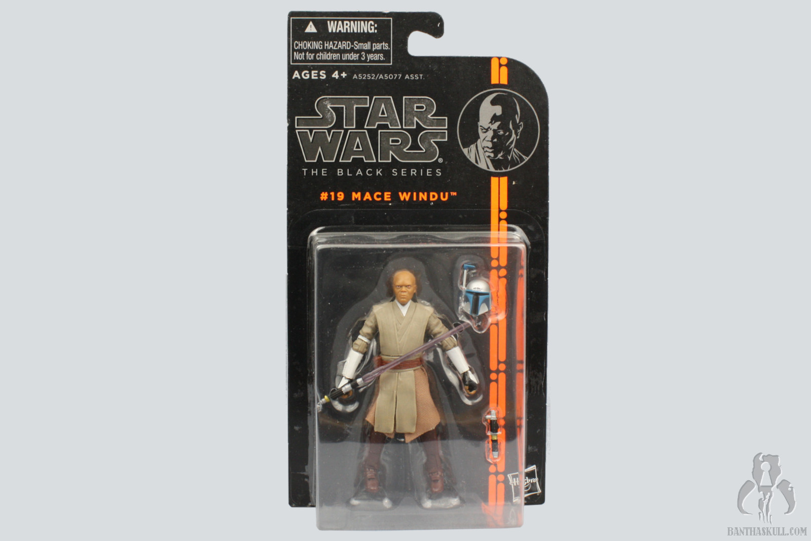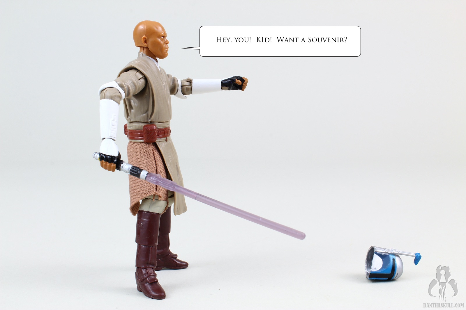 We got a Mace Windu figure in TVC. That figure was the film version of Mace. The only real difference in the costume here is the armored elbows and forearms. The head sculpt is all new. Interestingly, I like both, even though they look nothing alike, but both are a decent likeness to Sam Jackson. This figure has added wrist articulation, since these are ball jointed, This figure also has a ball jointed torso, but as Chris pointed out, it’s a double-edged sword because enabling the joint exposes the inner workings and ruins the aesthetic of the figure. This figure lacks a Jedi robe, but that’s just as well, since the one that came with the TVC version was particularly large. Mace also comes with a Jango Fett helmet accessory. I know that there was a story in TCW where the helmet was planted as a bomb to kill Mace. But I thought it was funny to think of the helmet as a trophy that Mace keeps in his quarters, and when he has some downtime, he’ll reenact the moment.