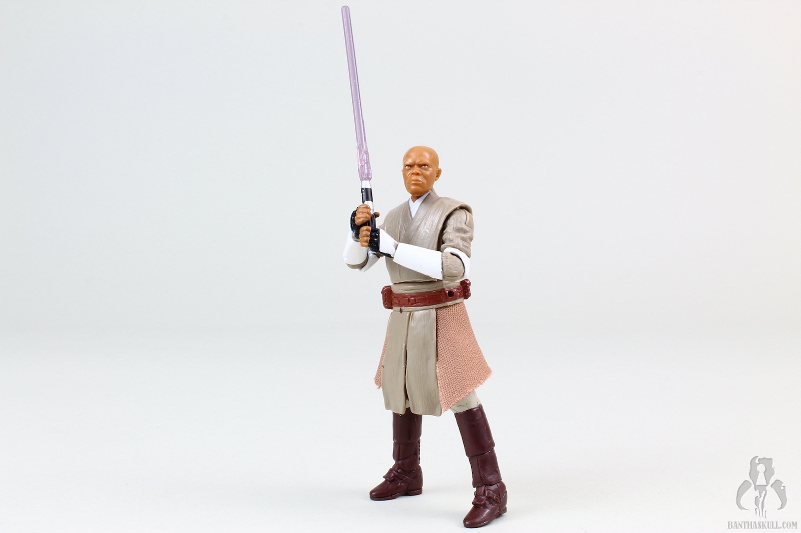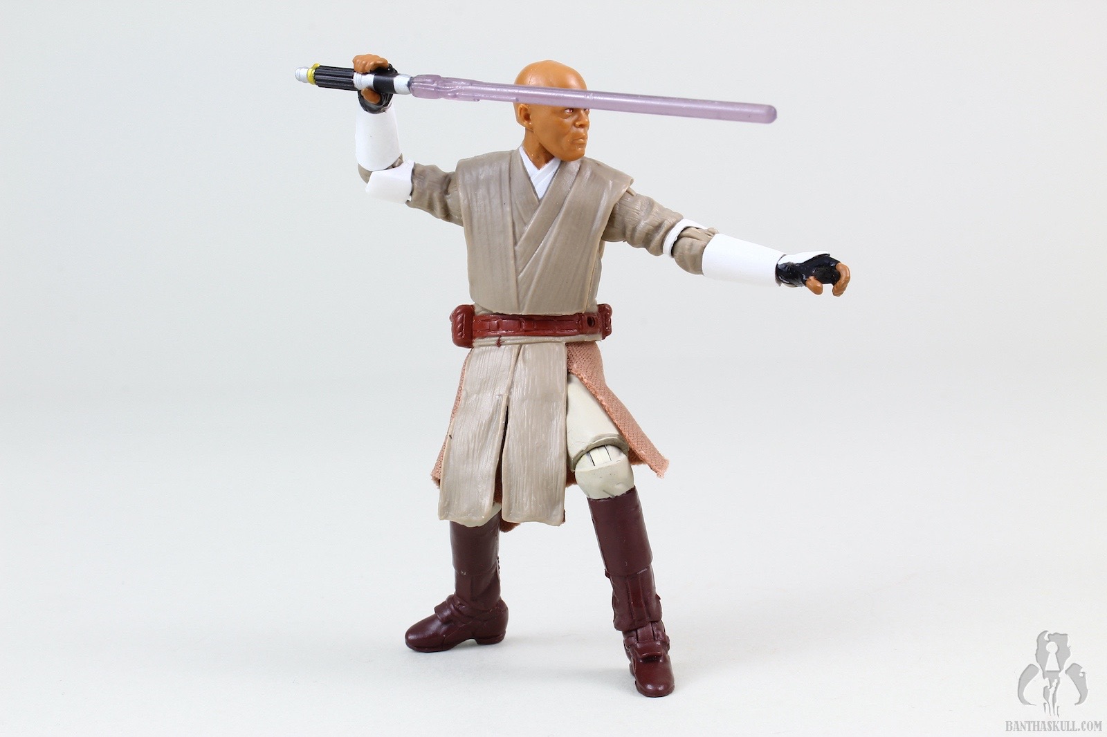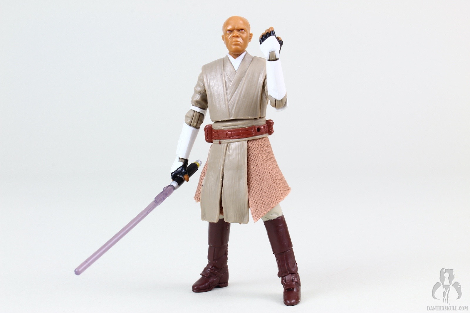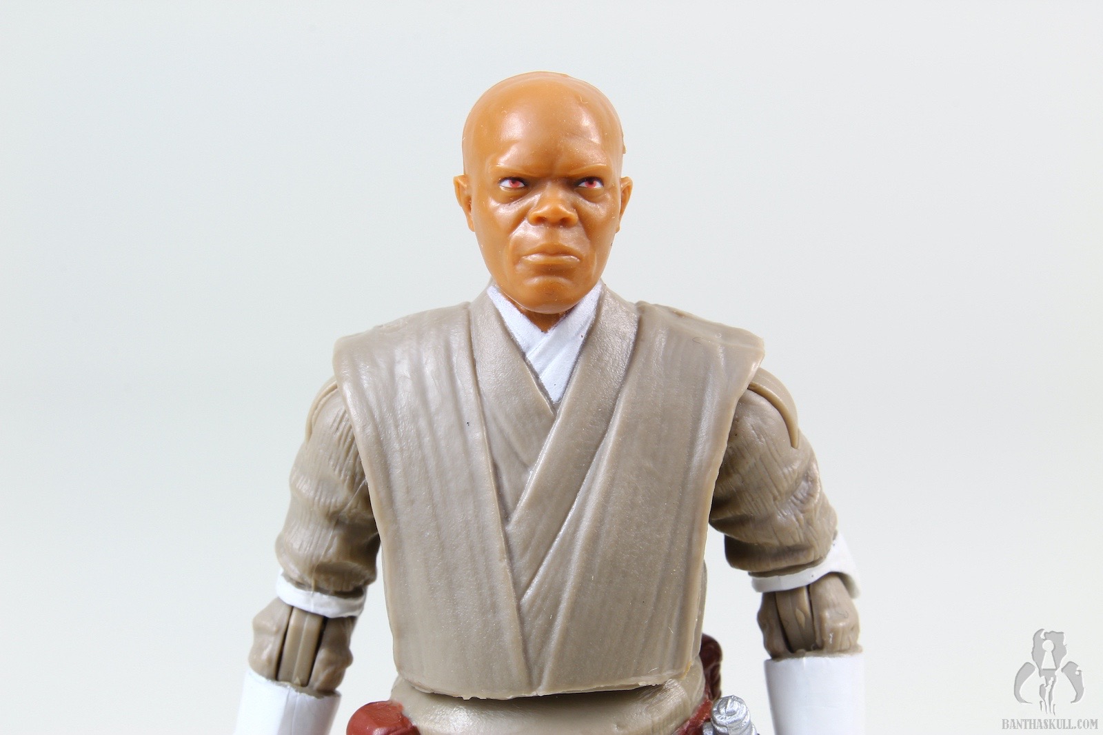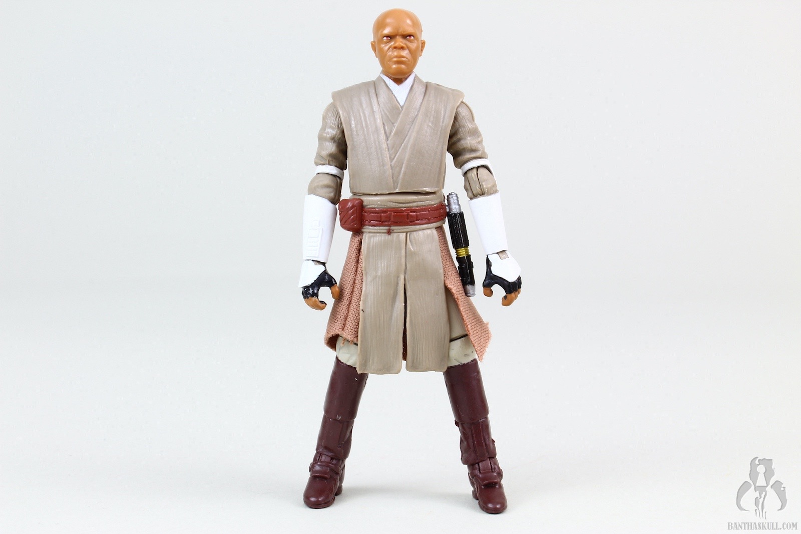 I’ll start off where the negatives appear. The torso is ball jointed, but it’s vaguely reminiscent of the 2004 VOTC Stormtrooper. If you articulate the joint even slightly back or forward, it exposes the joint itself. The head does not have great range of motion up and down. This is bad news if you’d like to pose Master Windu as if he’s menacing above a cowering Palpatine. The irises on my sample appear more orange than brown. One thing that’s becoming a bit annoying on Jedi figures is that the plastic sculpted upper tabard really interferes with the range of motion of the arms inward. I’d like to see Hasbro solve this issue at some point. Lastly, the unlit hilt is weird. It’s much longer than the hilt on the lit saber. Both are inaccurate. The unlit saber is missing the gold accents at the base of the hilt and the lit saber is missing the gold accents in the middle. I’m not bothered by this lack of hyper accuracy in a toy as much as the overly large unlit hilt which just sticks out.