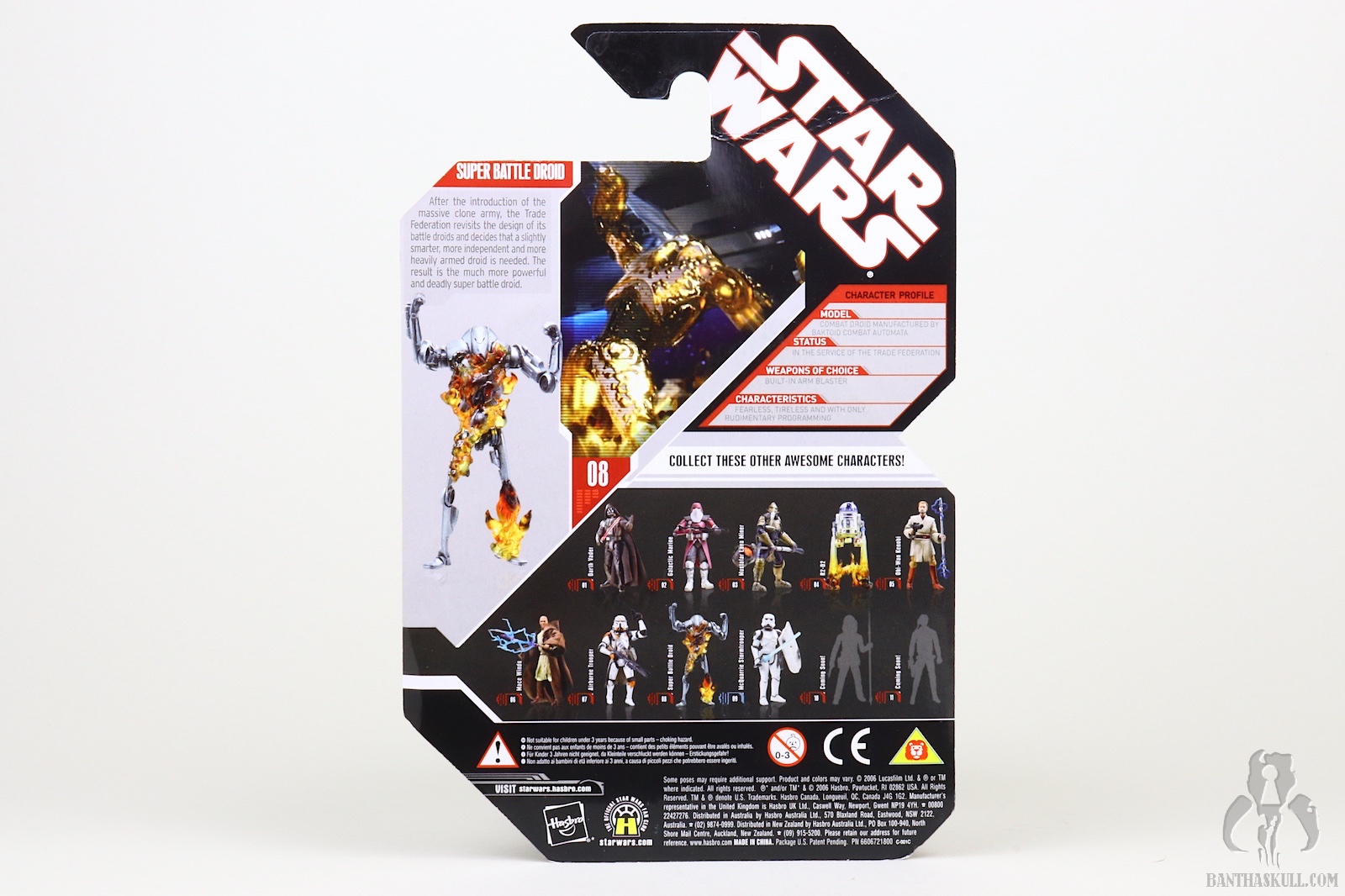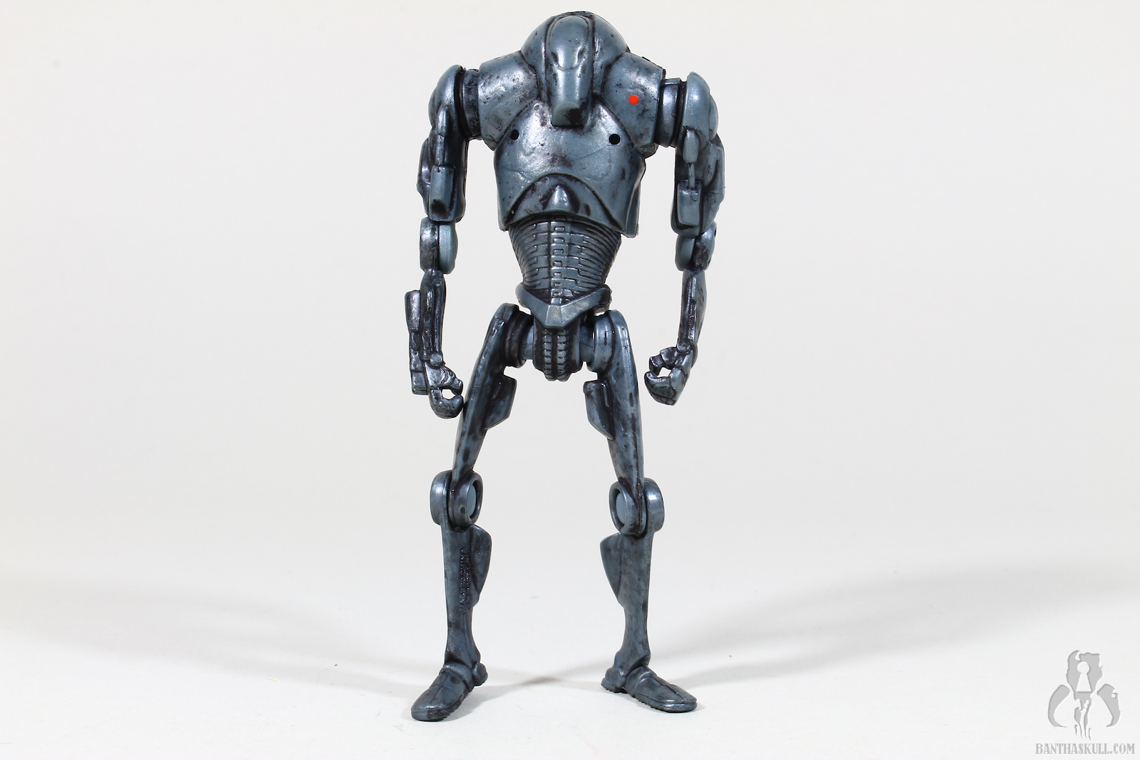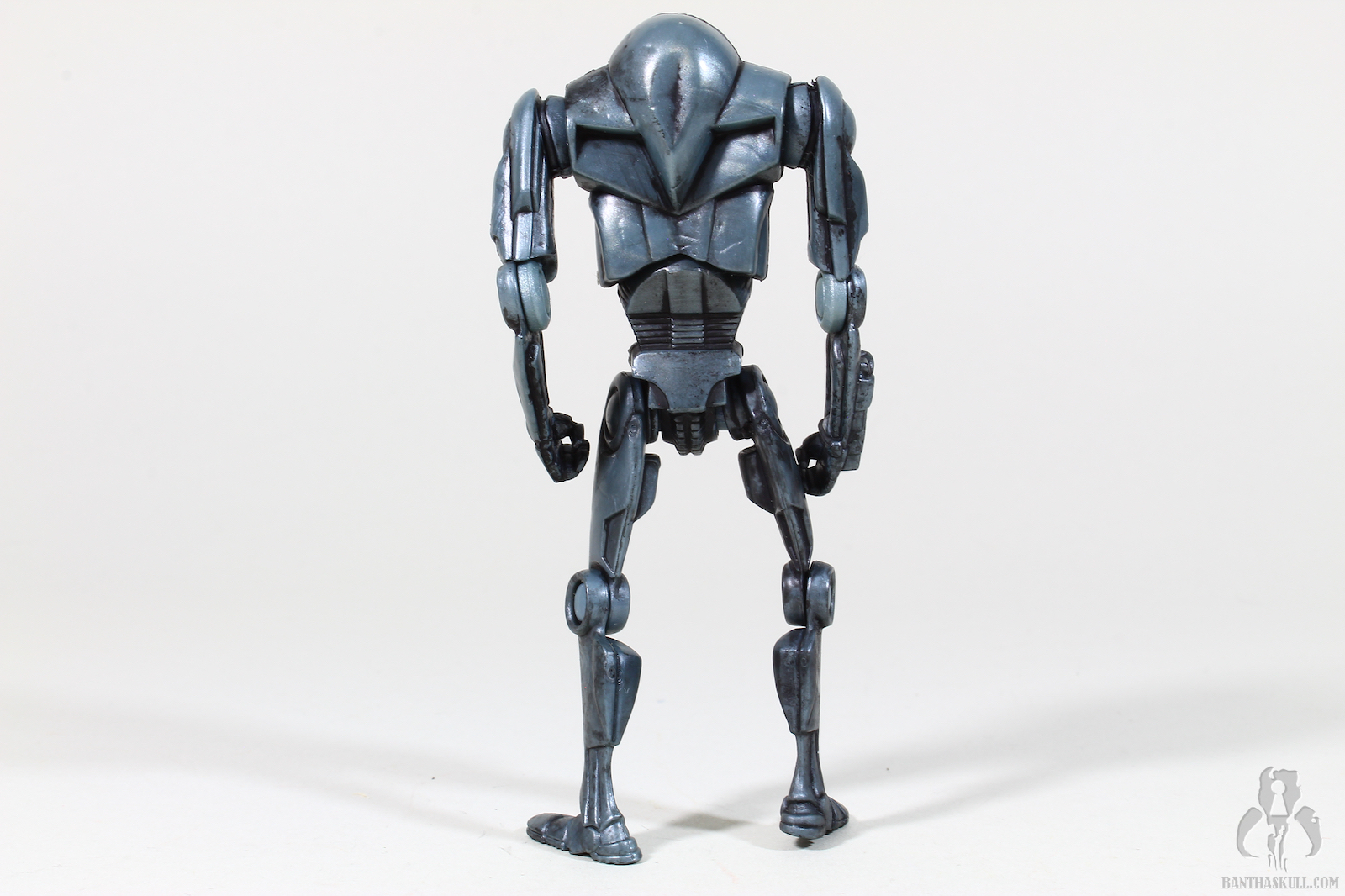 Up to this point, Hasbro had not accomplished a collector grade version of the Super Battle Droid. In fact, all of the efforts to that point could be considered poor with improper scale, minimal articulation, and a lack of detailing that made them look decidedly plastic. Hasbro finally got out of their own way with this 30th Anniversary Collection release. It has ball jointed articulation at the shoulders and elbows and ball joint-like articulation at the torso. The lower body features swivel hips and knees. Unfortunately, wrists and ankles were not in the cards. The ball jointed shoulders on my sample were extremely tight and actually caused the halves of the torso to split apart, which is how I got to examine the true articulation of the torso. It’s more of a fancy swivel joint than a ball joint. Even though ankles would have helped, you can surely pose the Super Battle Droid menacingly, or relentlessly marching into battle with its blaster arm raised. This figure would see multiple retools, repaints and re-releases, but the most notable is 2010’s Geonosis Arena Conflict set which finally incorporated articulated ankles. The most problematic issue with the lack of ankles on this release is that the left foot is sculpted with an upward angle, so you are forced to place the left leg back to stand the figure. No neutral pose can be achieved.