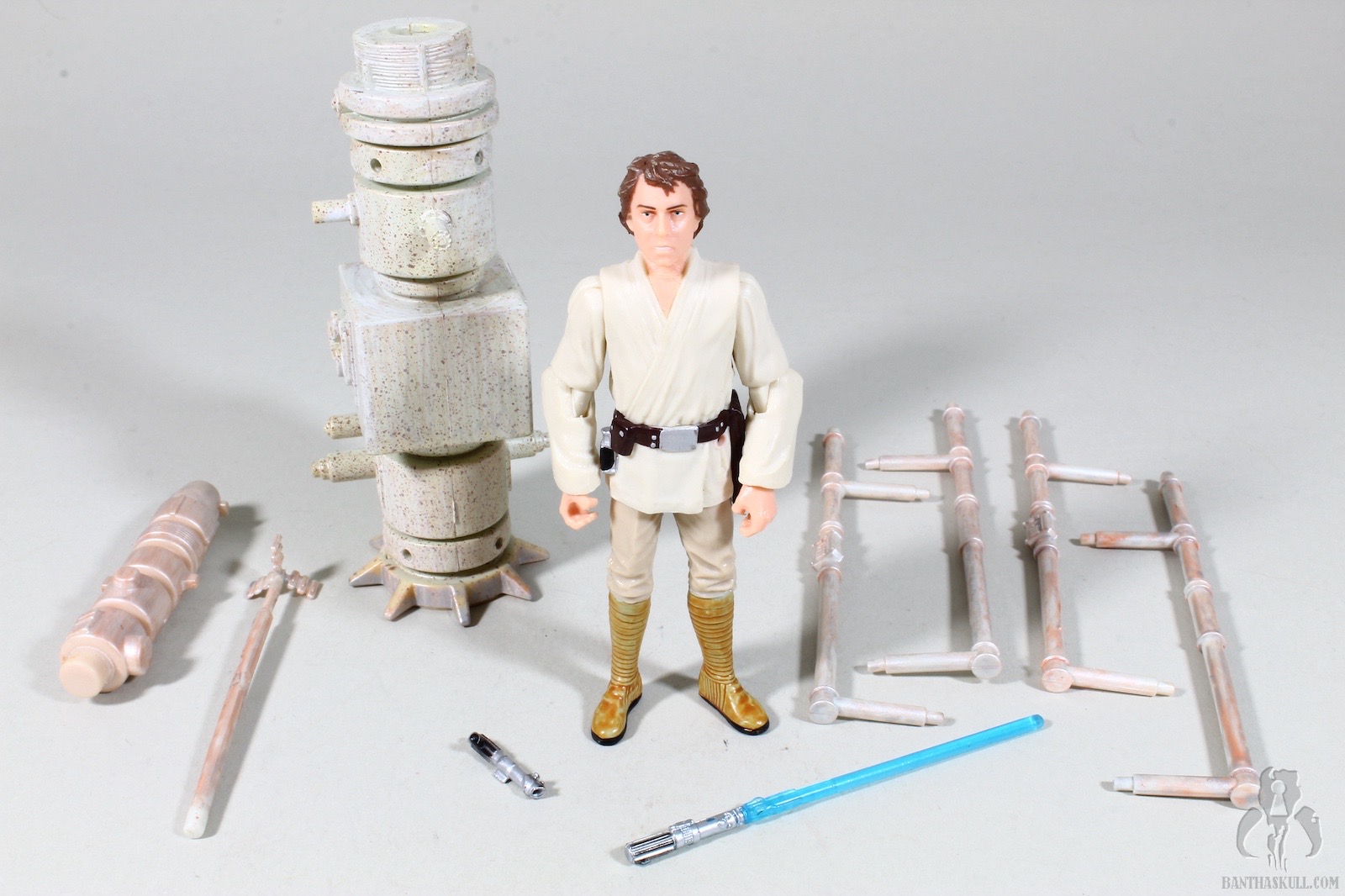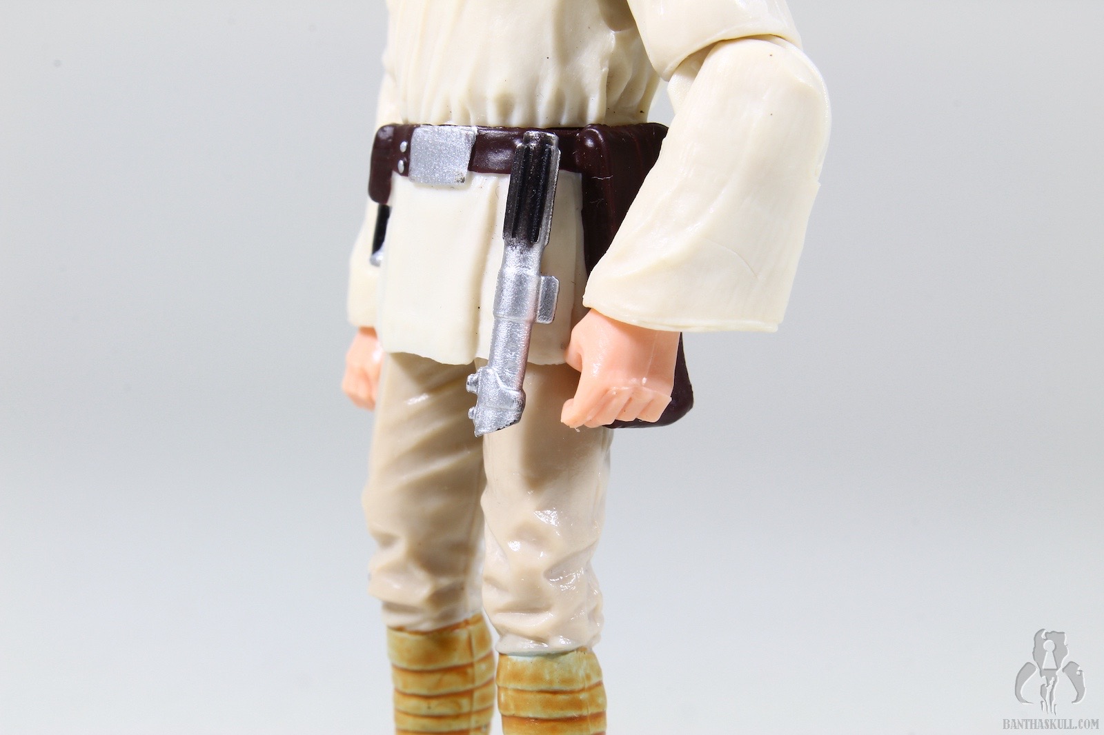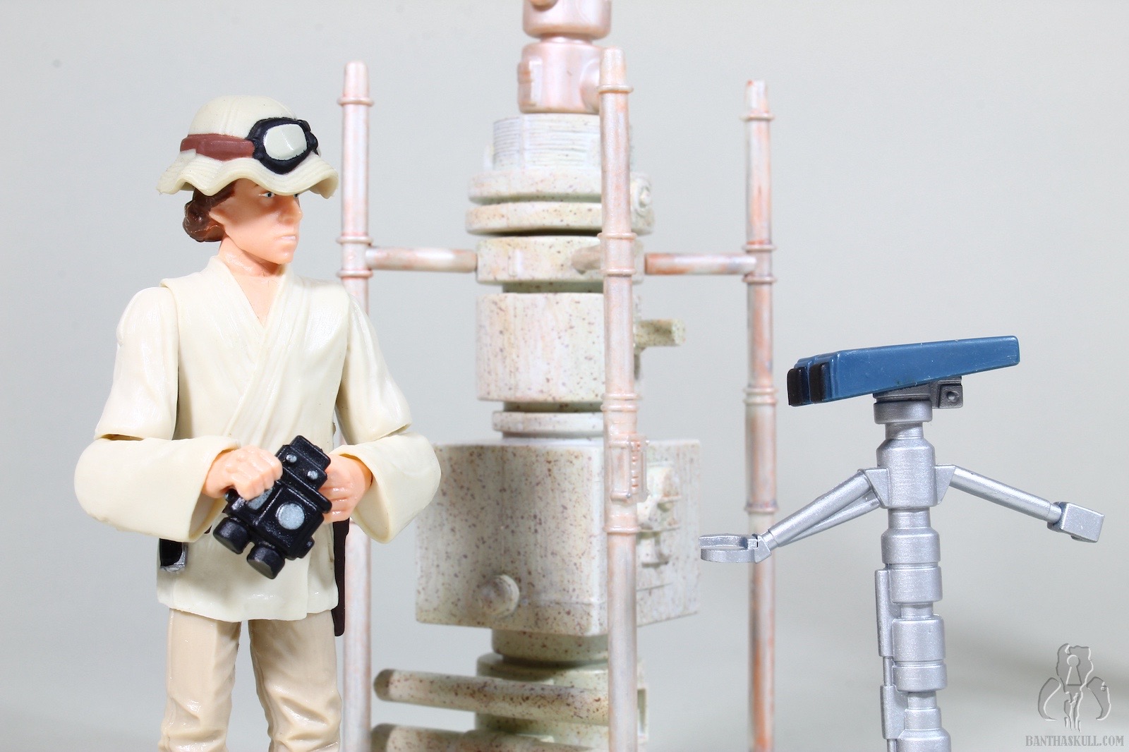 All of these gripes are the equivalent of a super model with webbed feet. Most collectors are not going to notice. The reason almost everyone bought this figure was for the huge moisture vaporator accessory. The cost of this pack-in is surely the reason why Hasbro had to reduce the articulation of the figure itself. The vaproators were prevalent throughout Tatooine, so even if you are not setting up a Lars homestead display, it can be used to spice up the exterior of your cantina display. There are two vaporators in the scene where Luke sells his Landspeeder to Wioslea alone. The accessory is not 100% perfect. My sample came out of the package with an unfortunate lean to one side, but the props themselves were not perfect. The figure is a weak five, but the vaproator accessory easily promotes this to a 7 out of 10. You would be justified in buying this just for the accessory. As a bonus, the figure’s right hand can be easily interchanged with the right “force hand” from the Legacy Collection Ben Kenobi if you wanted to be able to get better dueling poses out of that figure.