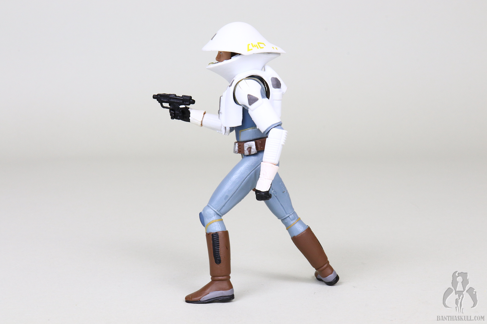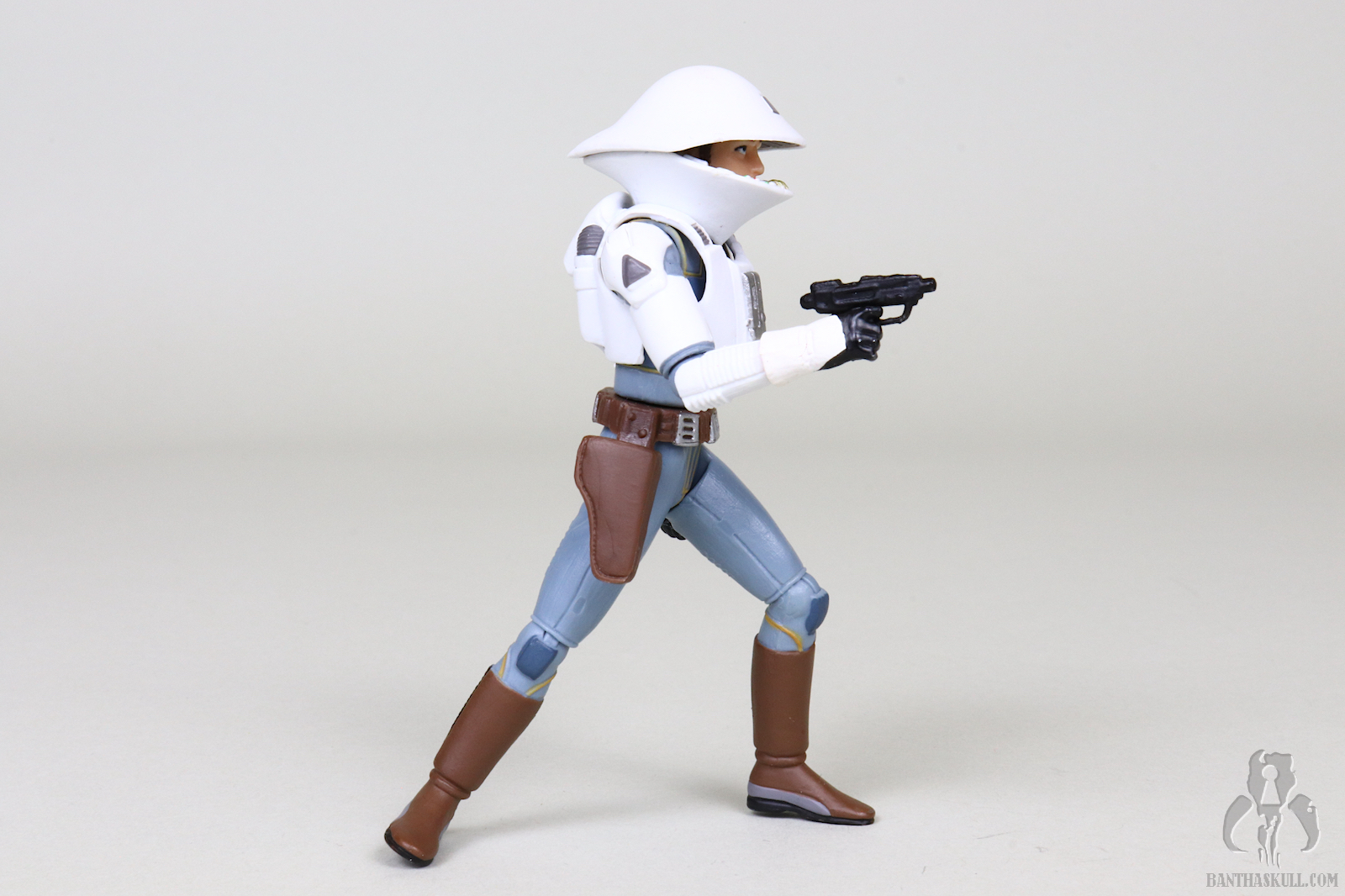 The most damning criticism I can make about the figure is the lack of ankle joints (noting that the slight “stroke mouth” on this sample is a production anomaly). You can engage the knees and balance the figure on the tip of the same foot as you can see above, but rest assured that it’s quite a precarious stance. It won’t stay that way for long without the assistance of a stand. Speaking of the knees, they represent one of the most deftly concealed points of articulation in the history of the line. They essentially become invisible with the legs are fully extended. The figure only comes armed with a blaster pistol, but the arms have the requisite articulation and range of motion to interact with a long gun. In fact the angle of the grips on the hands aligns so perfectly that I highly suspect the figure was originally intended to come with a rifle.