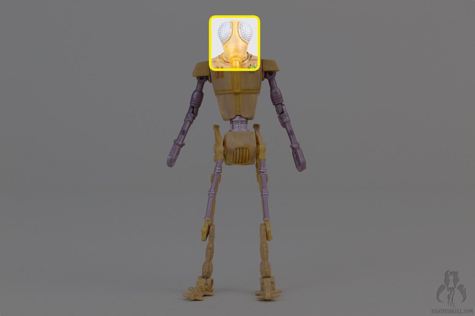 Obi-Wan Kenobi (carry forward) contains the head of BG-J38. This worker drone droid served as Jabba the Hutt’s personal dejarik and hologames droid. Source: Return of the Jedi